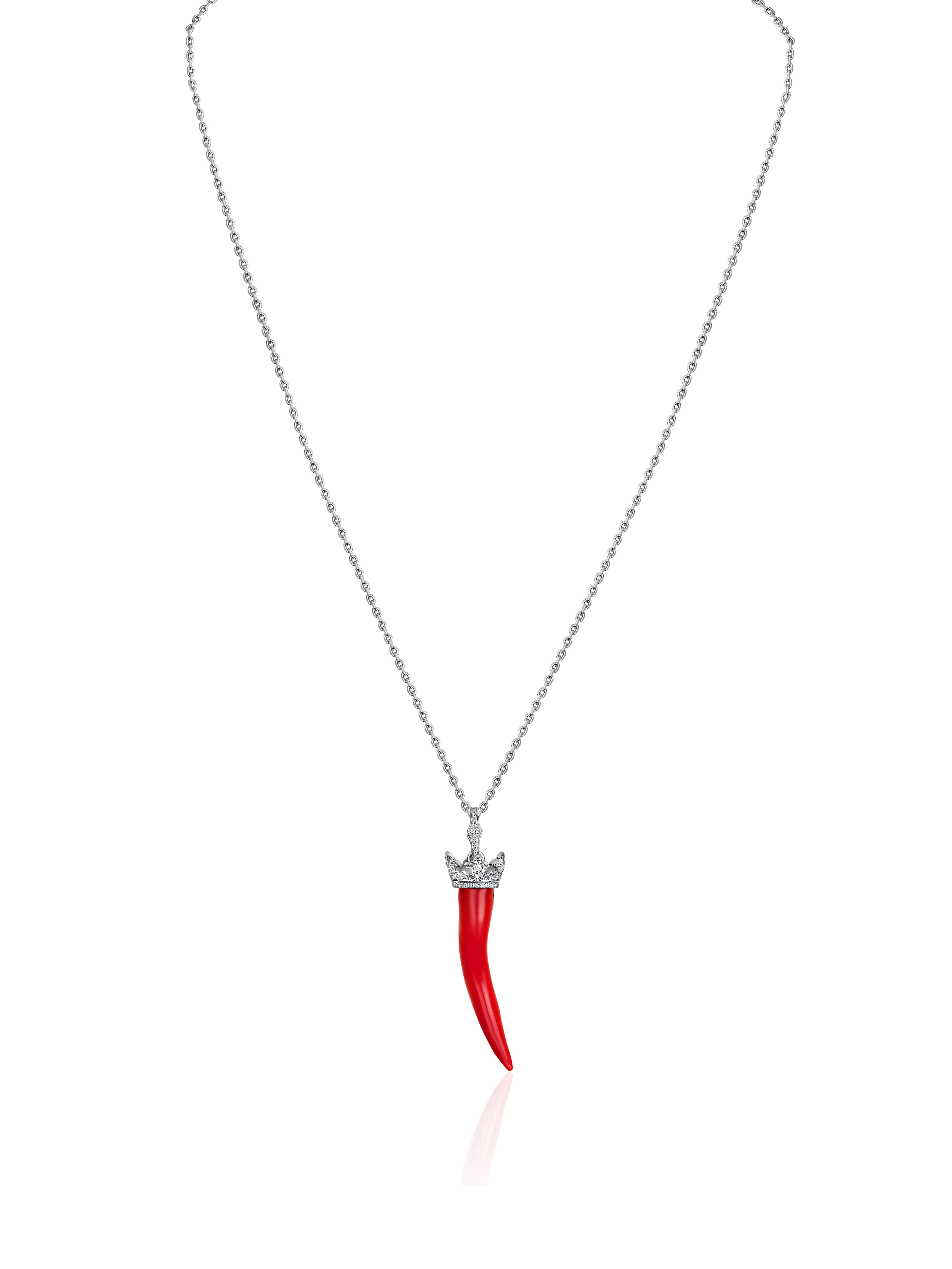 Necklace with a pendant in white gold with coral weighing 3.10 g and 94 round-cut diamonds with a total weight of 0.59 ct.