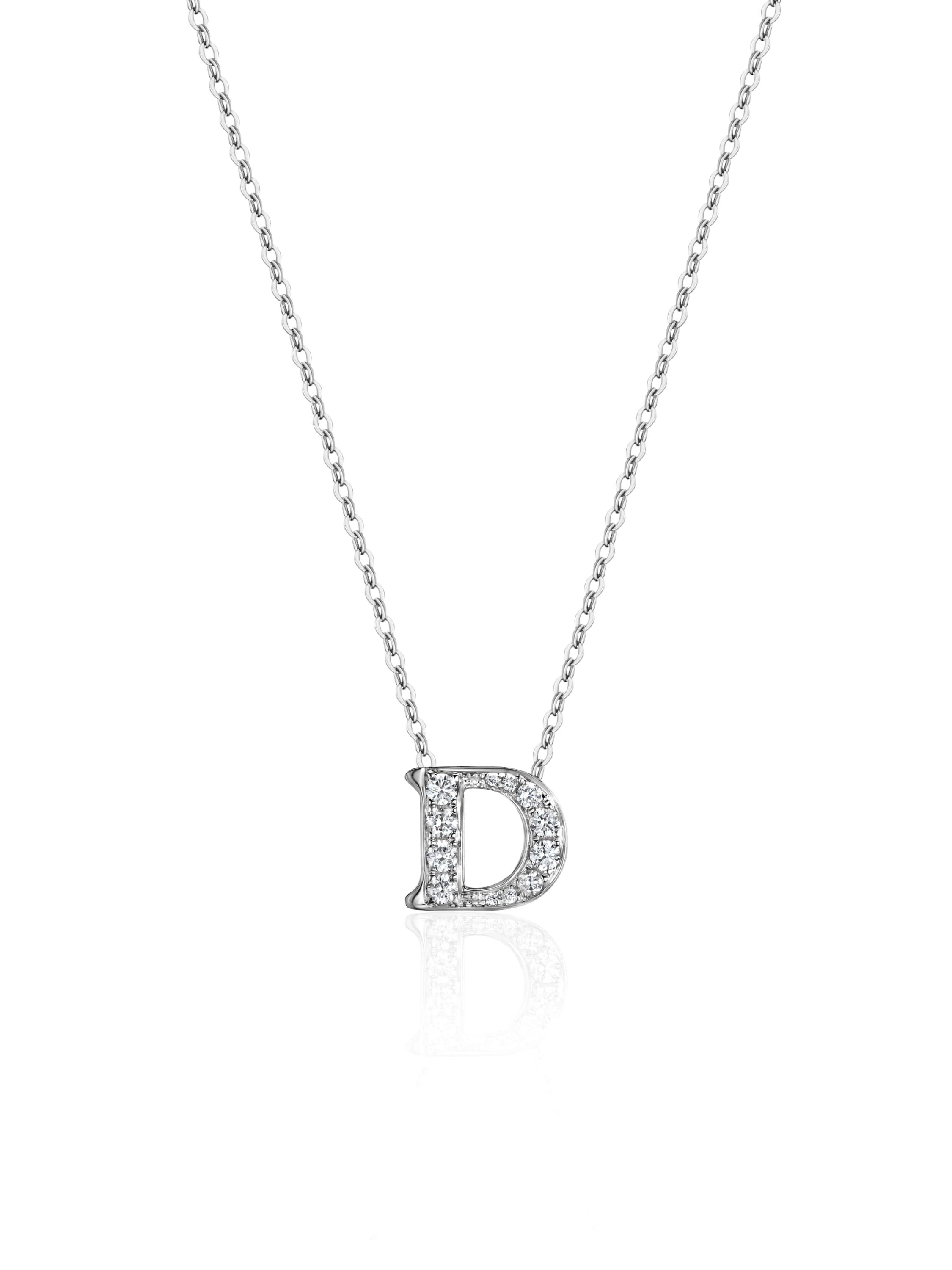 White gold necklace with a pendant in the shape of the letter D, set with 12 round diamonds weighing 0.15 ct.