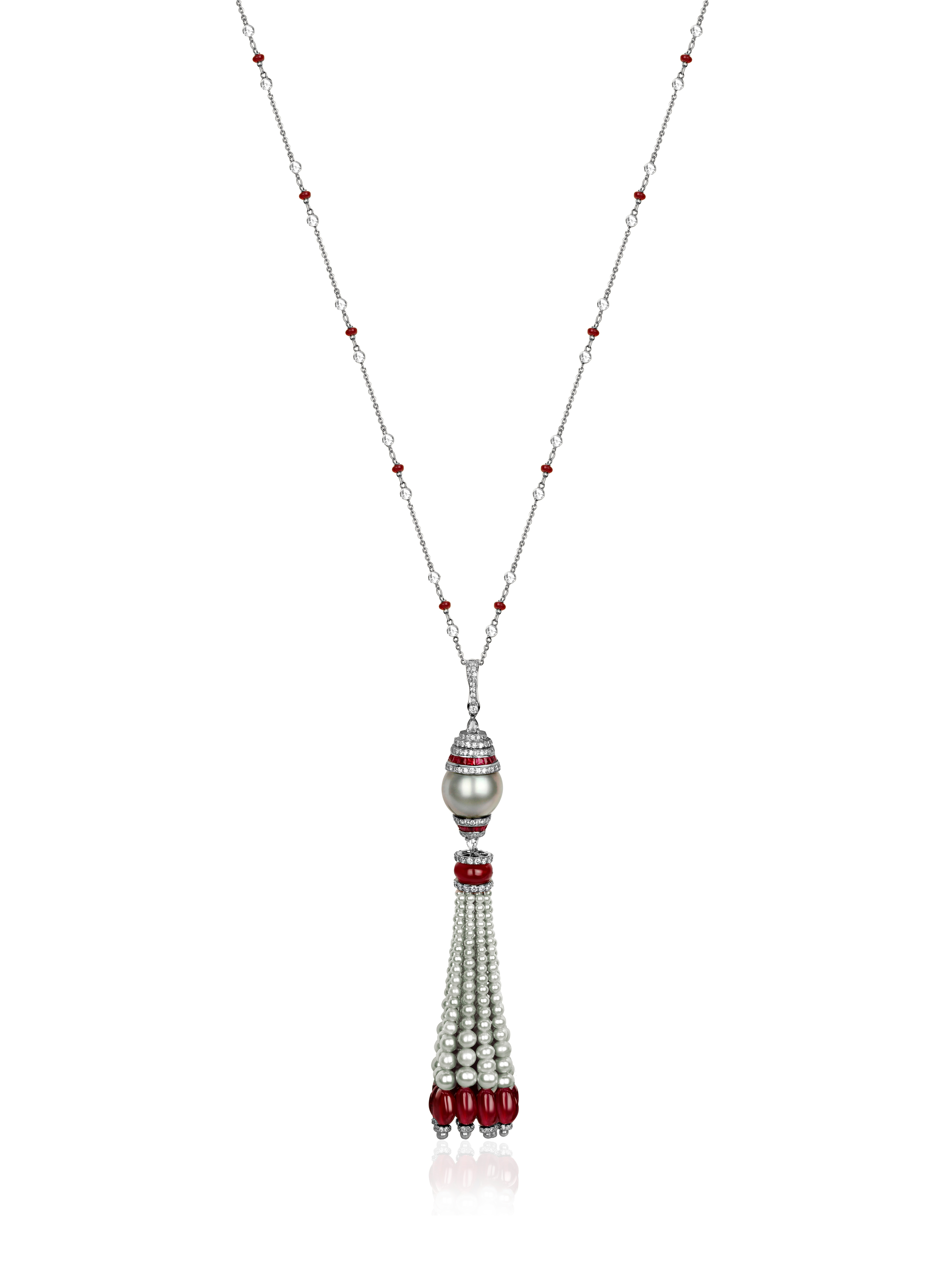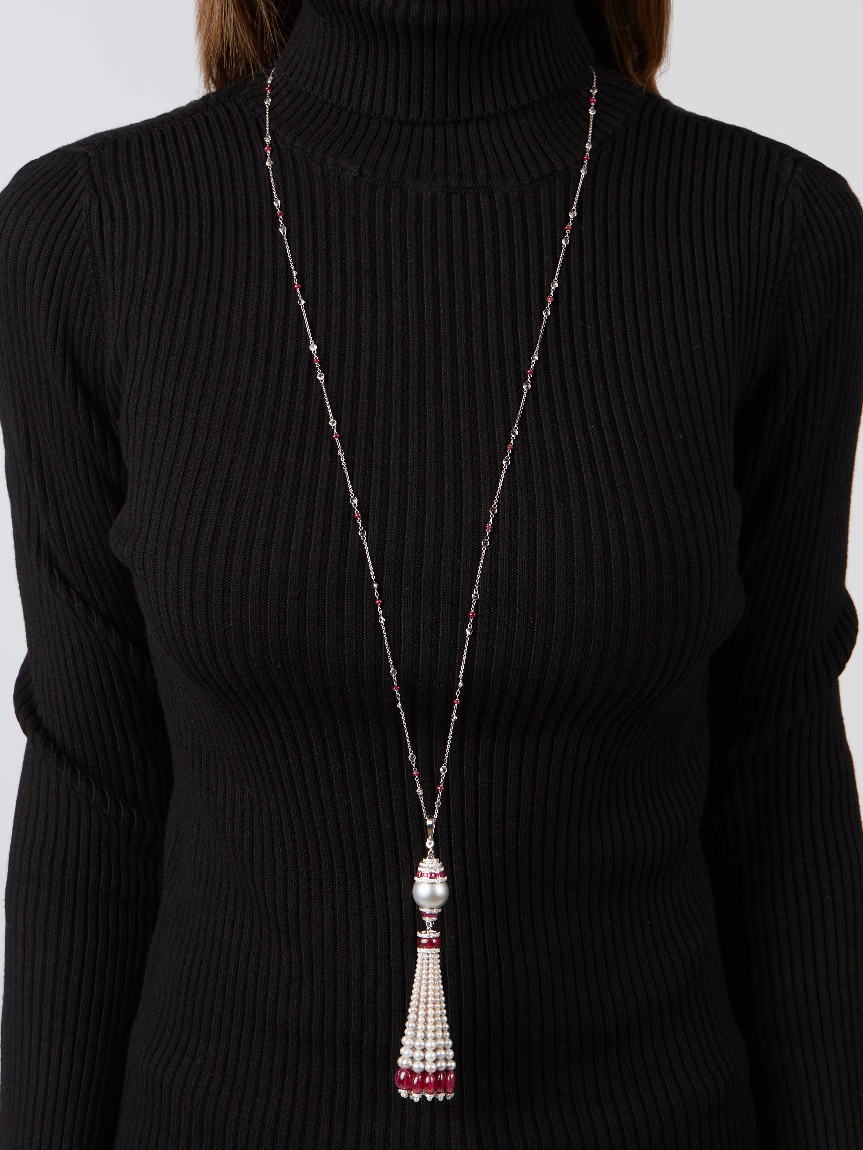Necklace with a pendant in white gold with a ruby weighing 6.62 g, round-cut diamonds with a total weight of 3.11 ct and gray pearls.