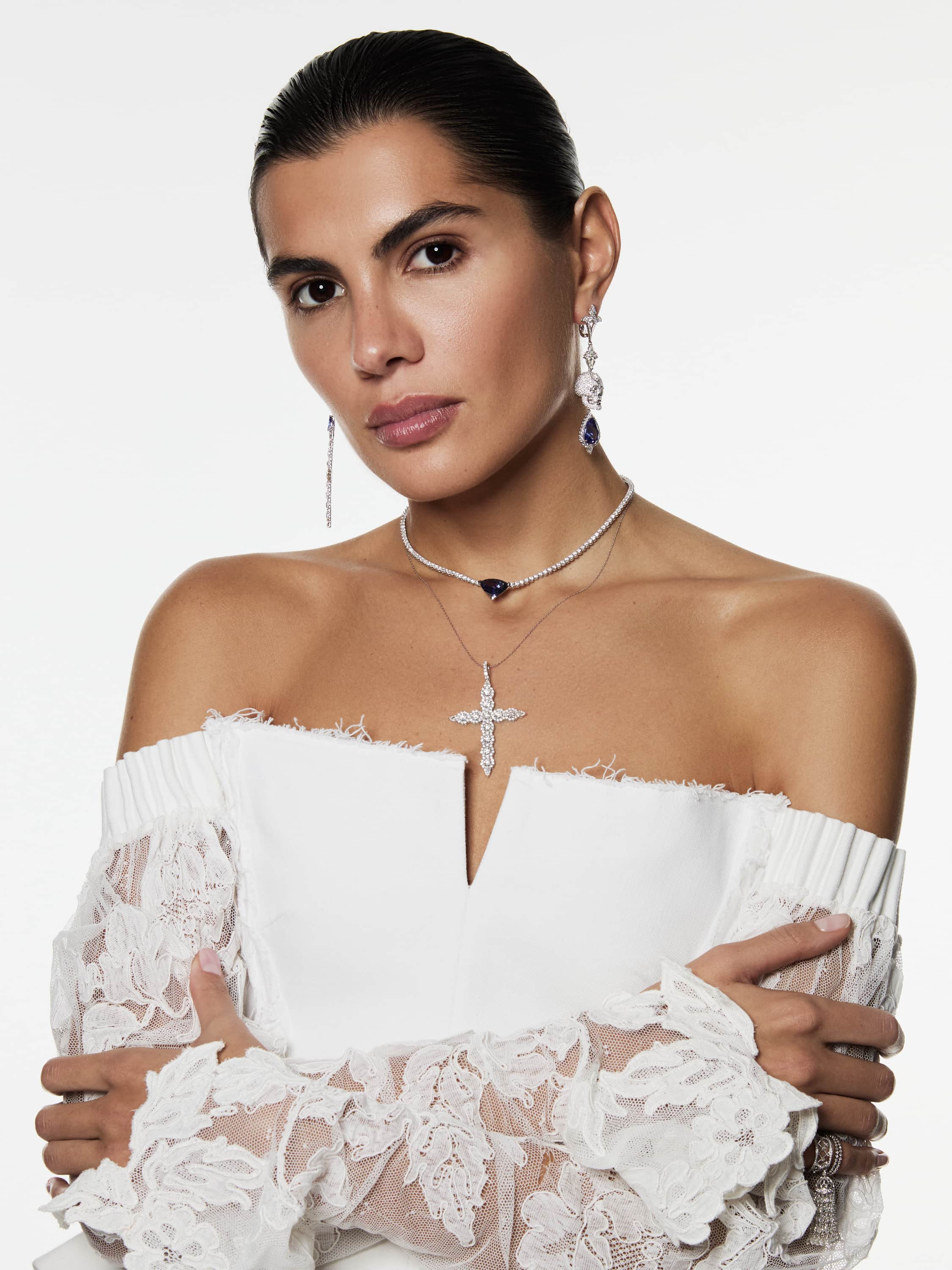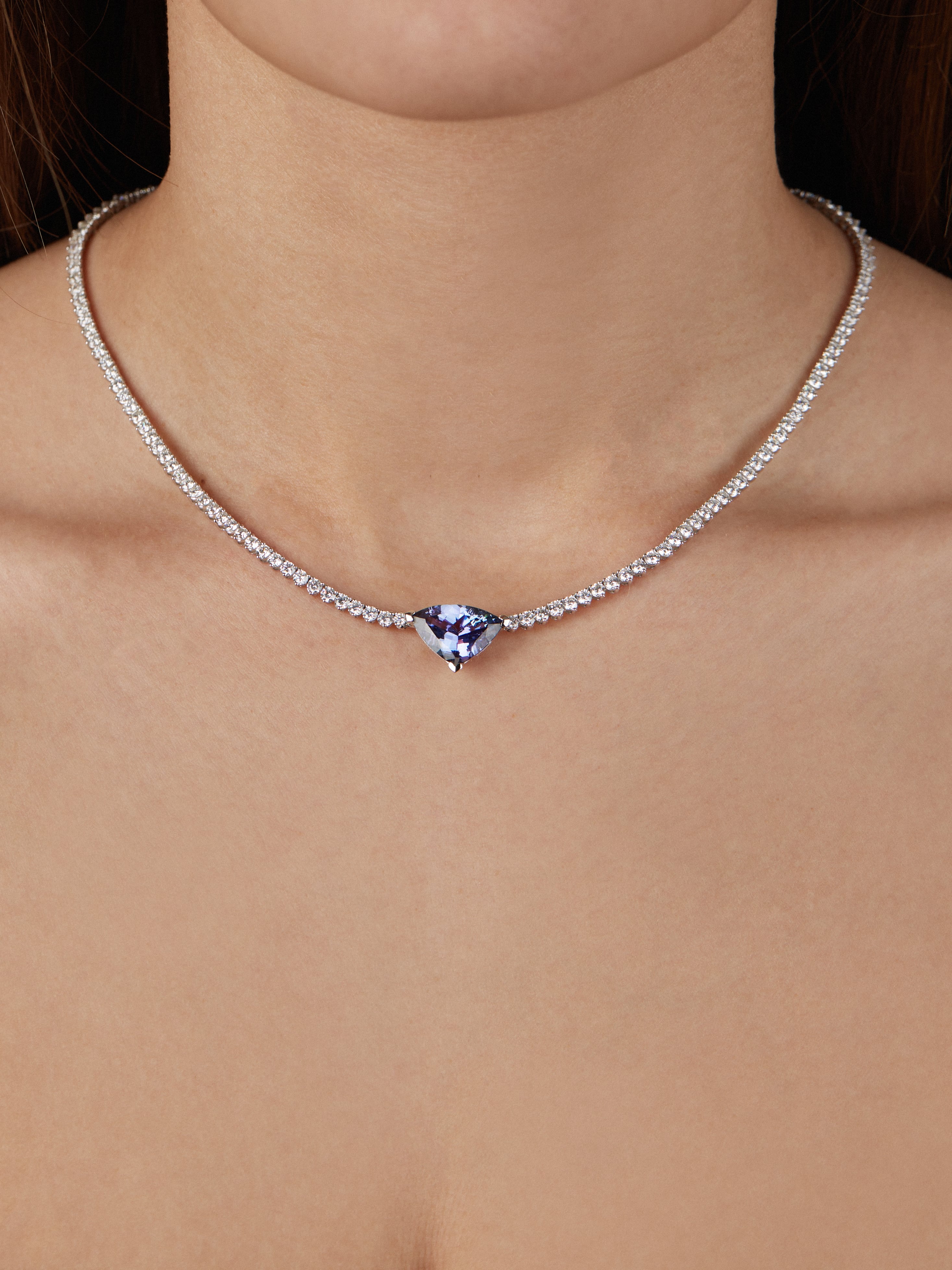 Necklace with a pendant in white gold with tanzanite weighing 4.77 ct and 209 round-cut diamonds with a total weight of 6.84 ct.
