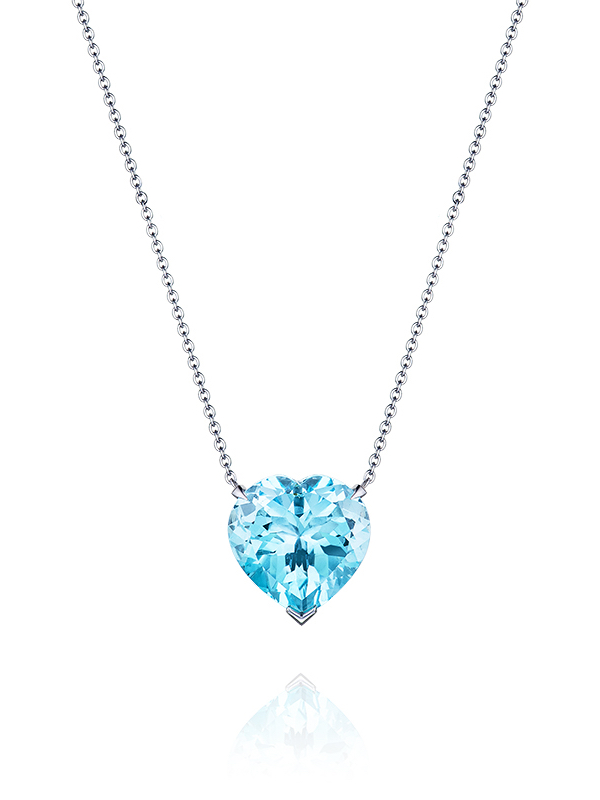 White gold necklace with a Sky Blue topaz heart cut weighing 14.7 ct, a briolette-cut rock crystal weighing 0.24 ct, and a round-cut ruby weighing 0.01 ct.