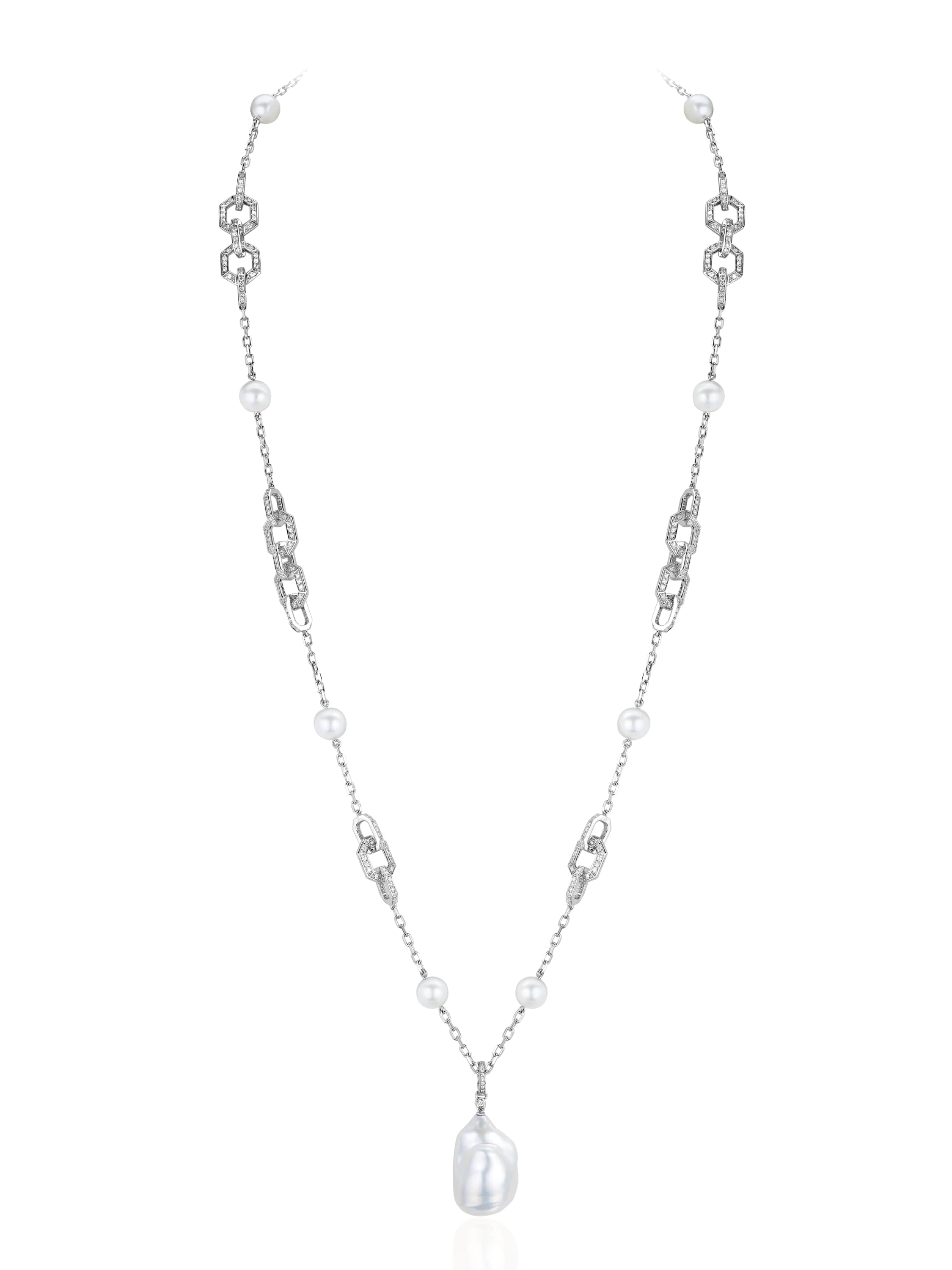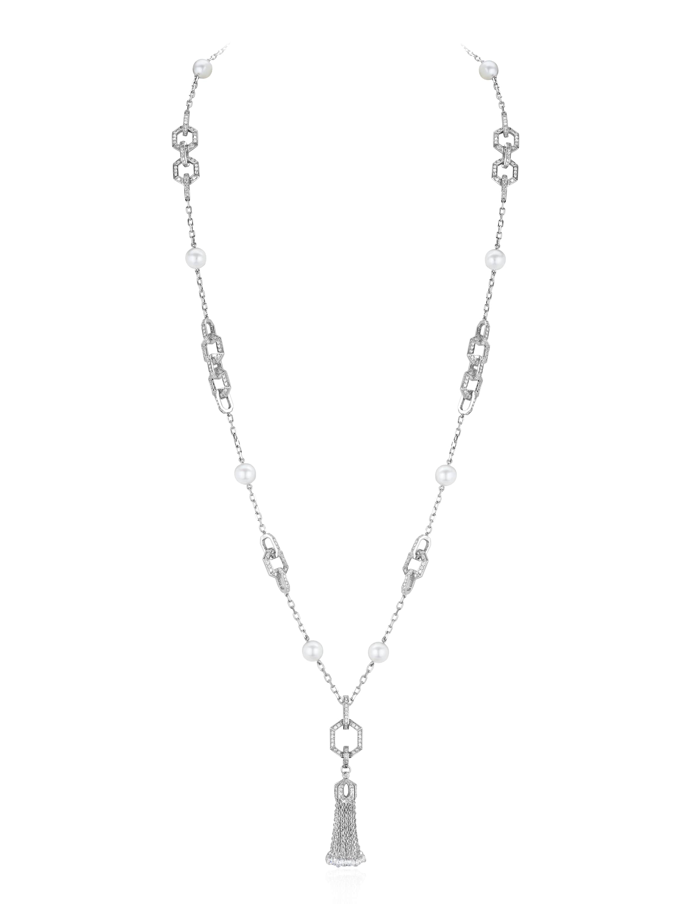 Necklace with 2 white gold pendants with 1 cultured pearl 6.00 g 24*15 mm, 12 cultured pearls 6.56 g 7.00 mm and 776 round-cut diamonds weighing 5.56 ct.
