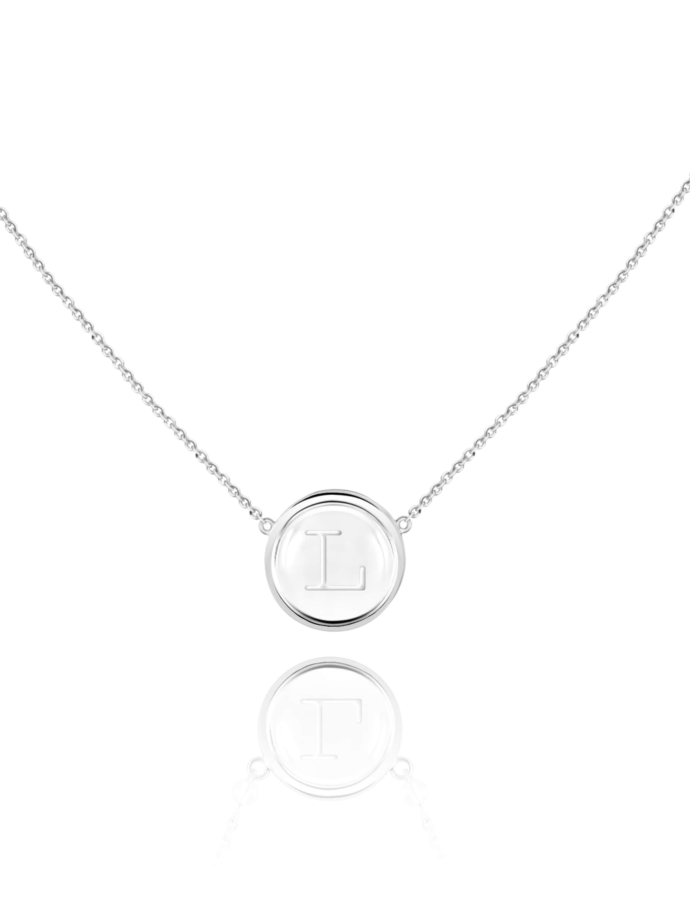 White gold necklace with a pendant featuring the letter L and a rock crystal weighing 6.12 ct.