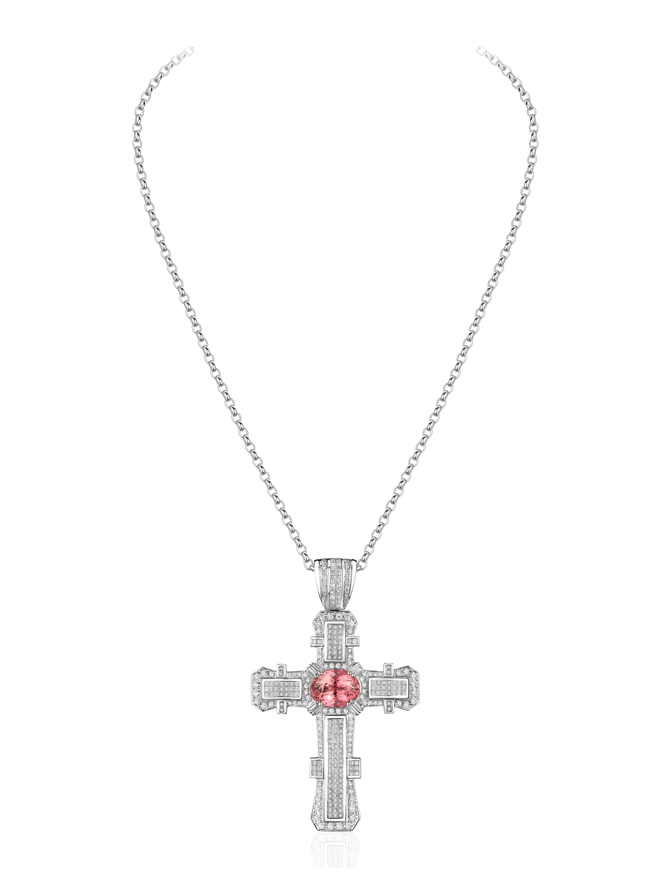 Cross pendant necklace with a 9.98 ct tourmaline, 167 princess‑cut diamonds 3.65 ct and 112 round‑cut diamonds weighing 2.53 ct.