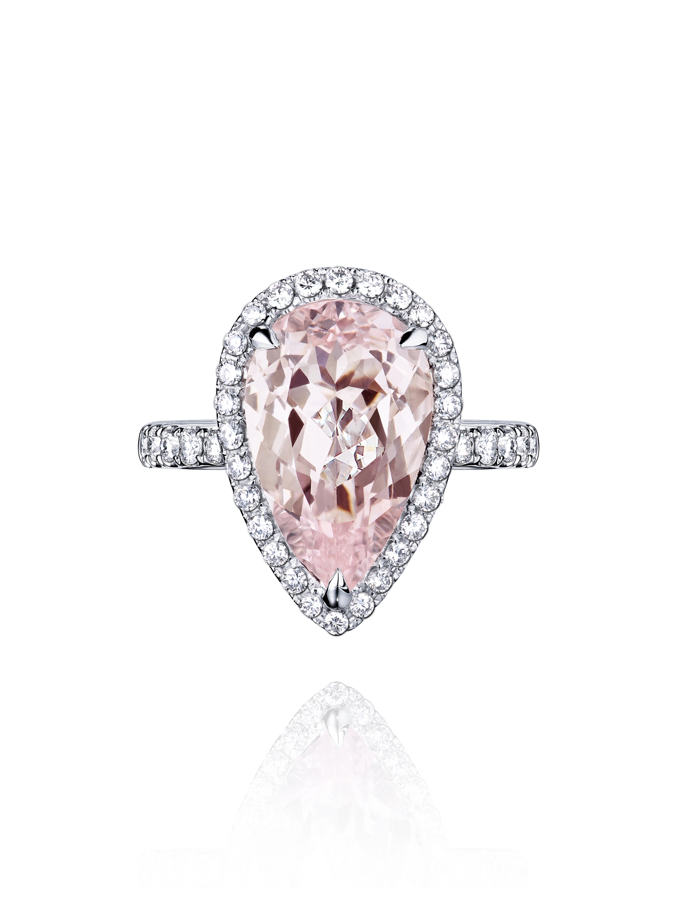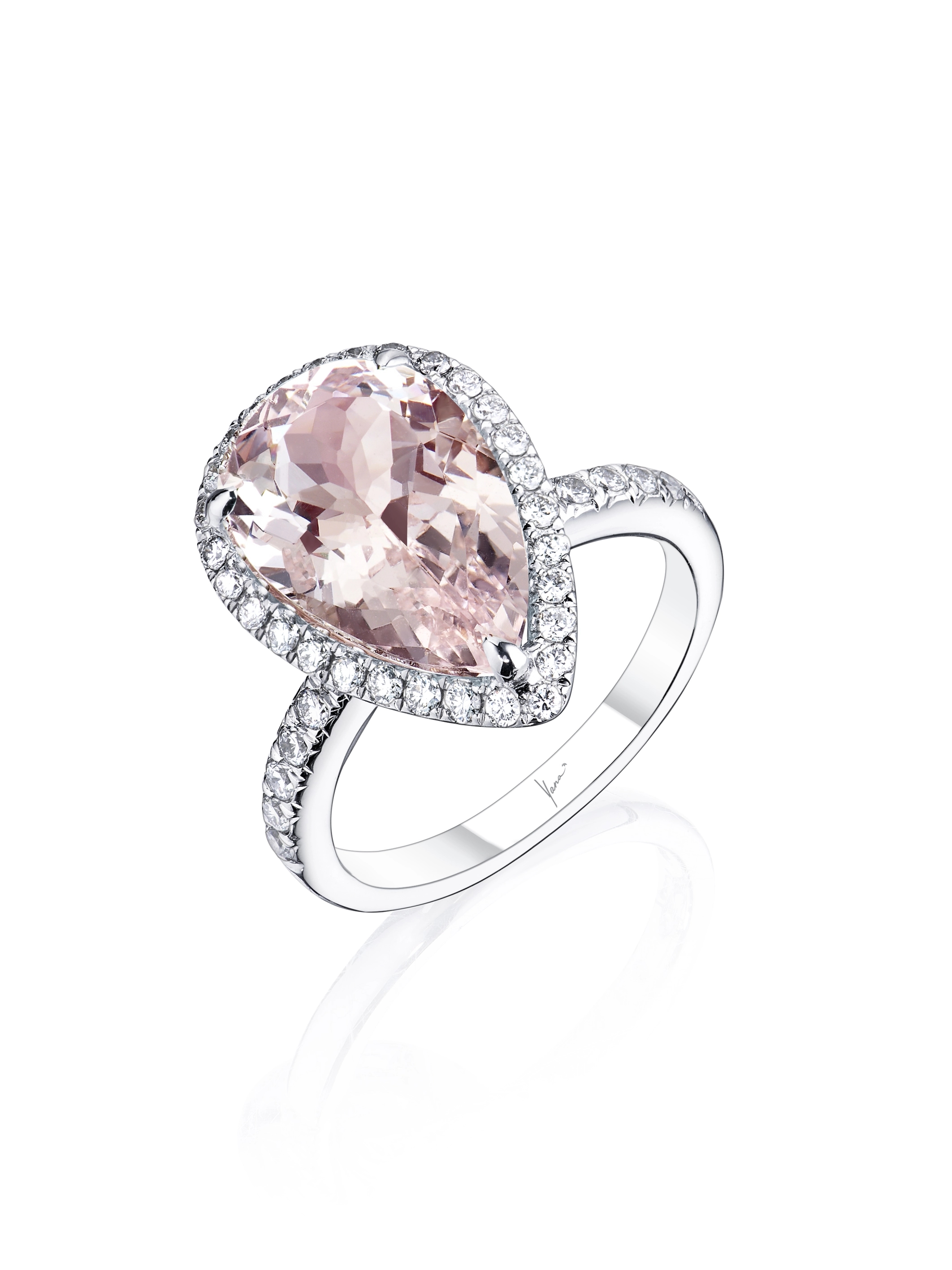 White gold ring with a pear-cut morganite weighing 4.74 ct and 54 round-cut diamonds with a total weight of 0.78 ct. Item weight – 6.67 g.