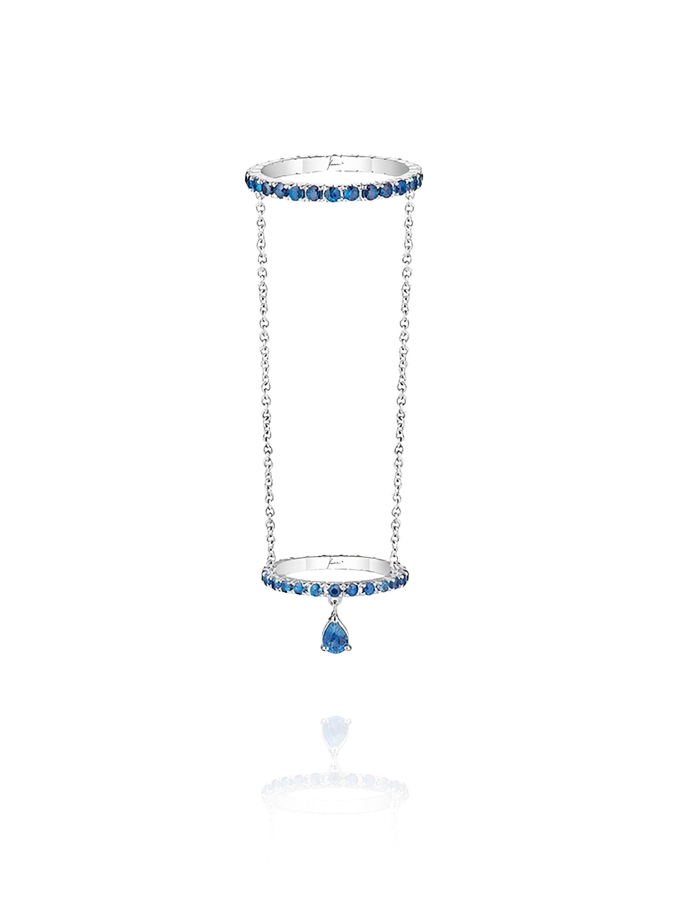 Double ring in white gold with a pear-cut sapphire weighing 0.31 ct and 53 sapphires with a total weight of 1.68 ct.