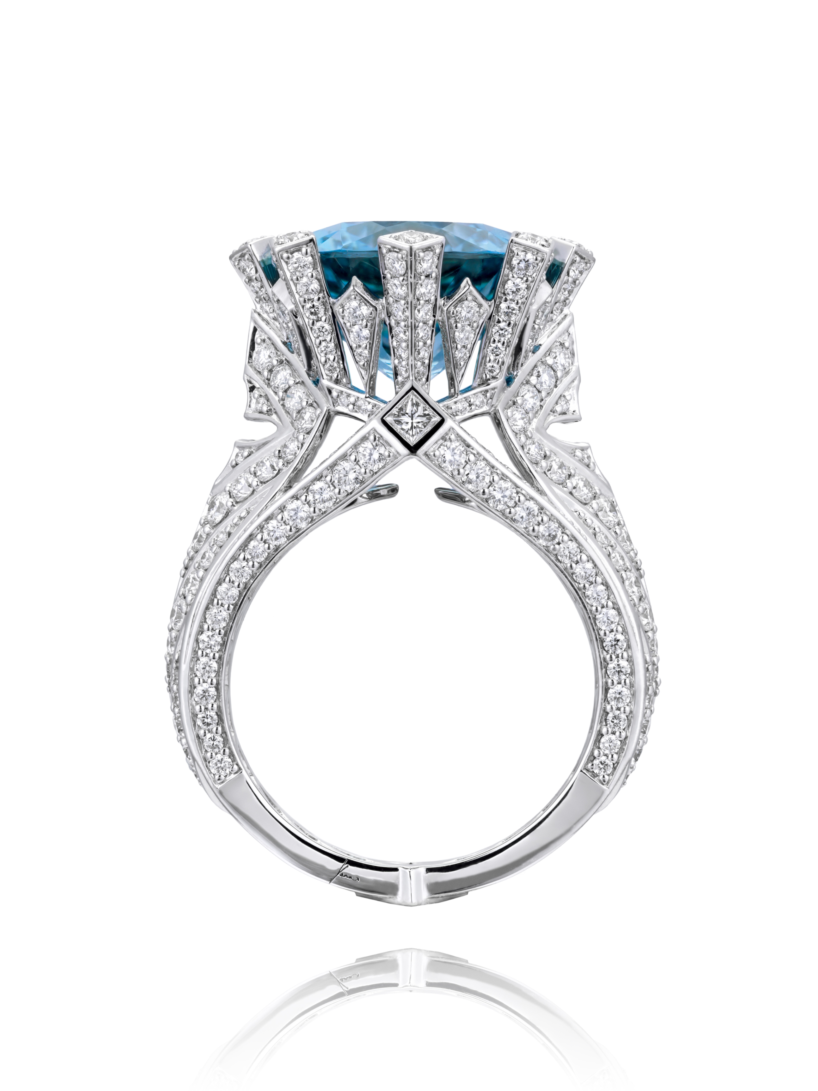 A white gold ring inlaid with an aquamarine weighing 9.22 ct, 3 princess-cut diamonds with a total weight of 0.23 ct, and 300 round-cut diamonds with a total weight of 1.92 ct.