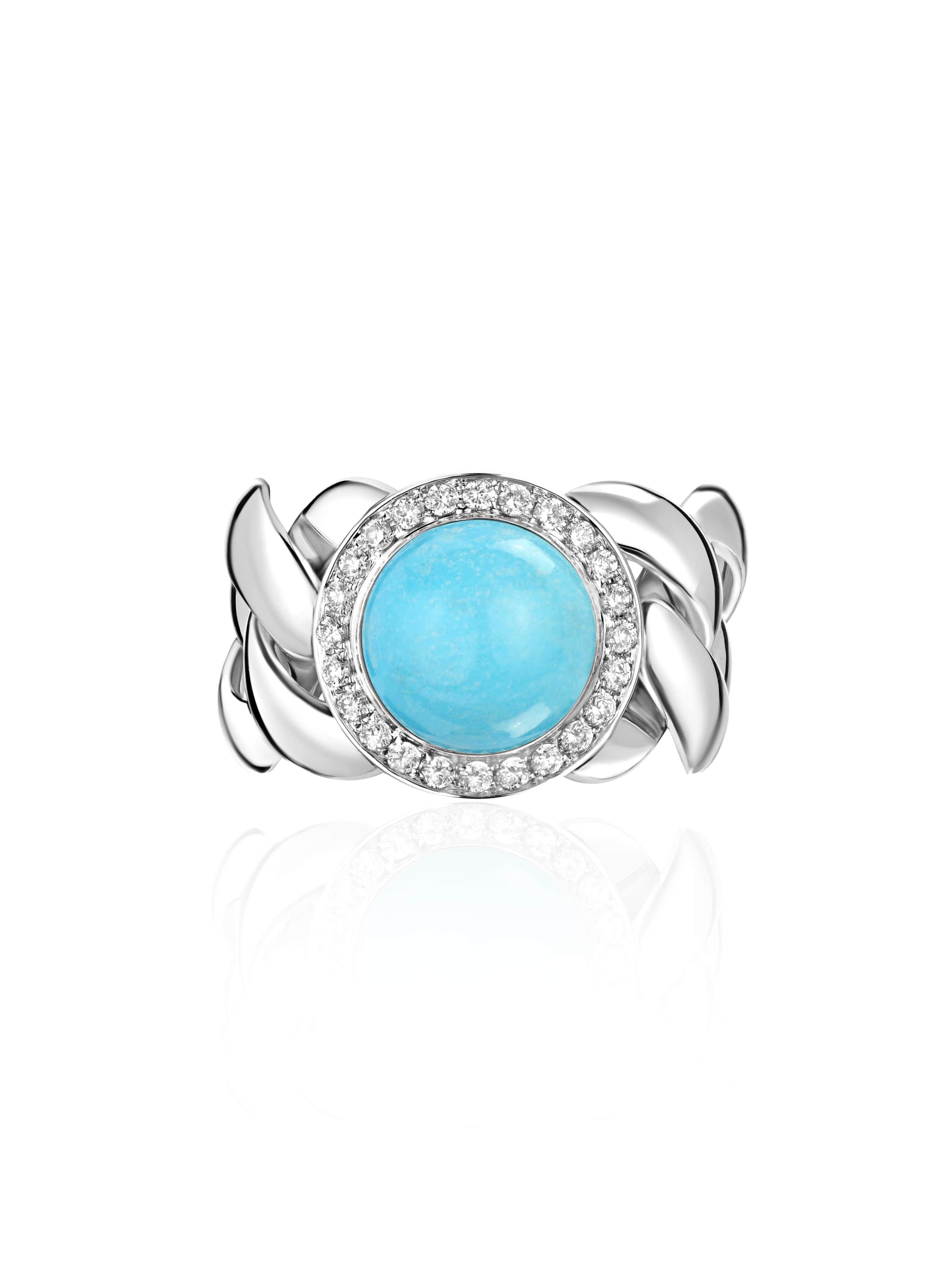 White gold ring with Arizona turquoise weighing 2.84 ct and 24 round-cut diamonds weighing 0.20 ct.
