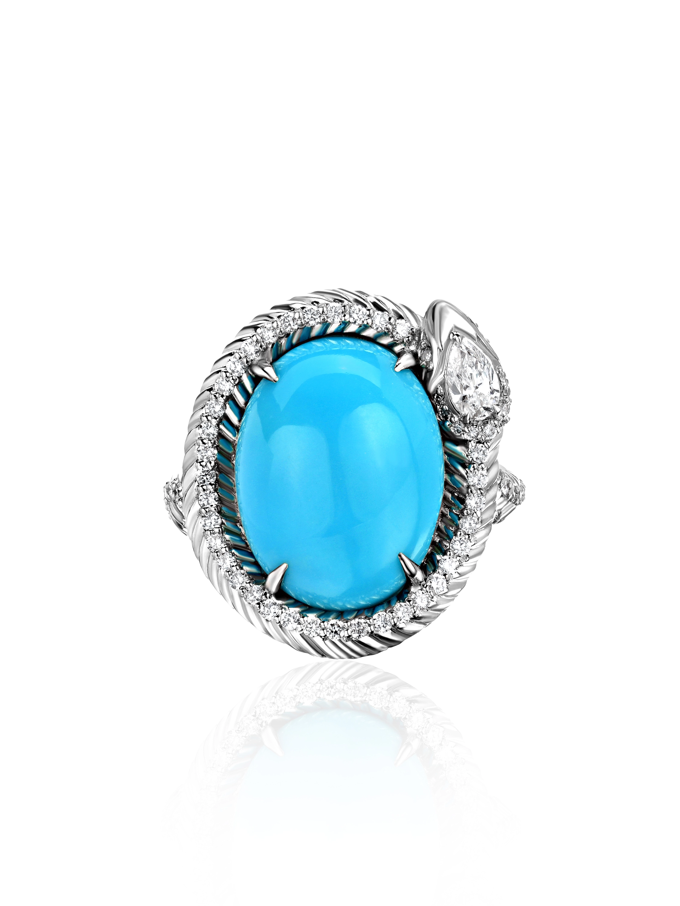 A white gold ring set with turquoise weighing 1.57 g, 60 round-cut diamonds with a total weight of 0.38 ct, and 1 pear-cut diamond weighing 0.17 ct. Item weight: 13.56 g.