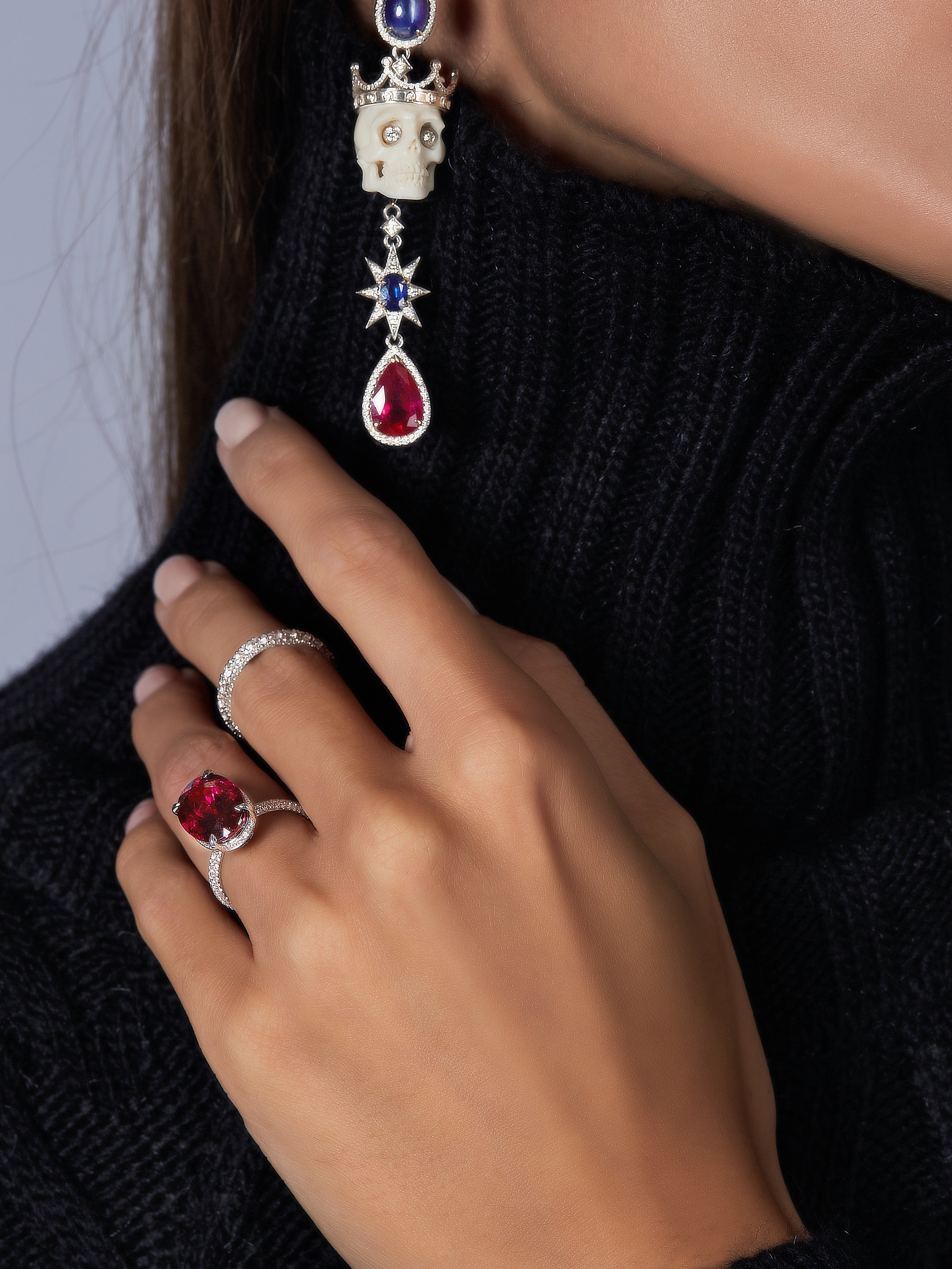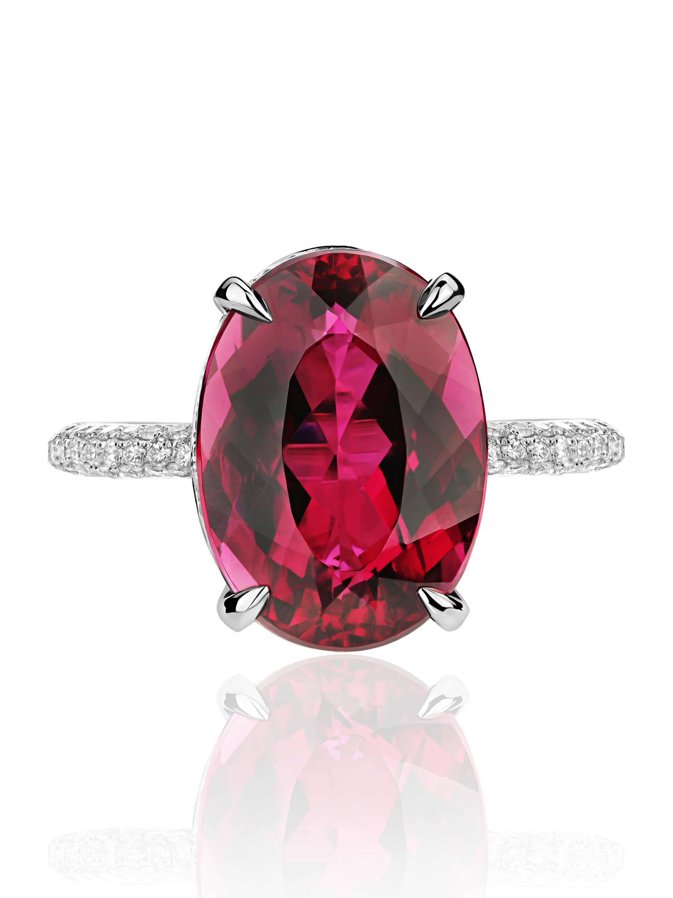 White gold ring set with 196 round diamonds with a total weight of 0.69 ct and an oval rubellite weighing 6.70 ct.