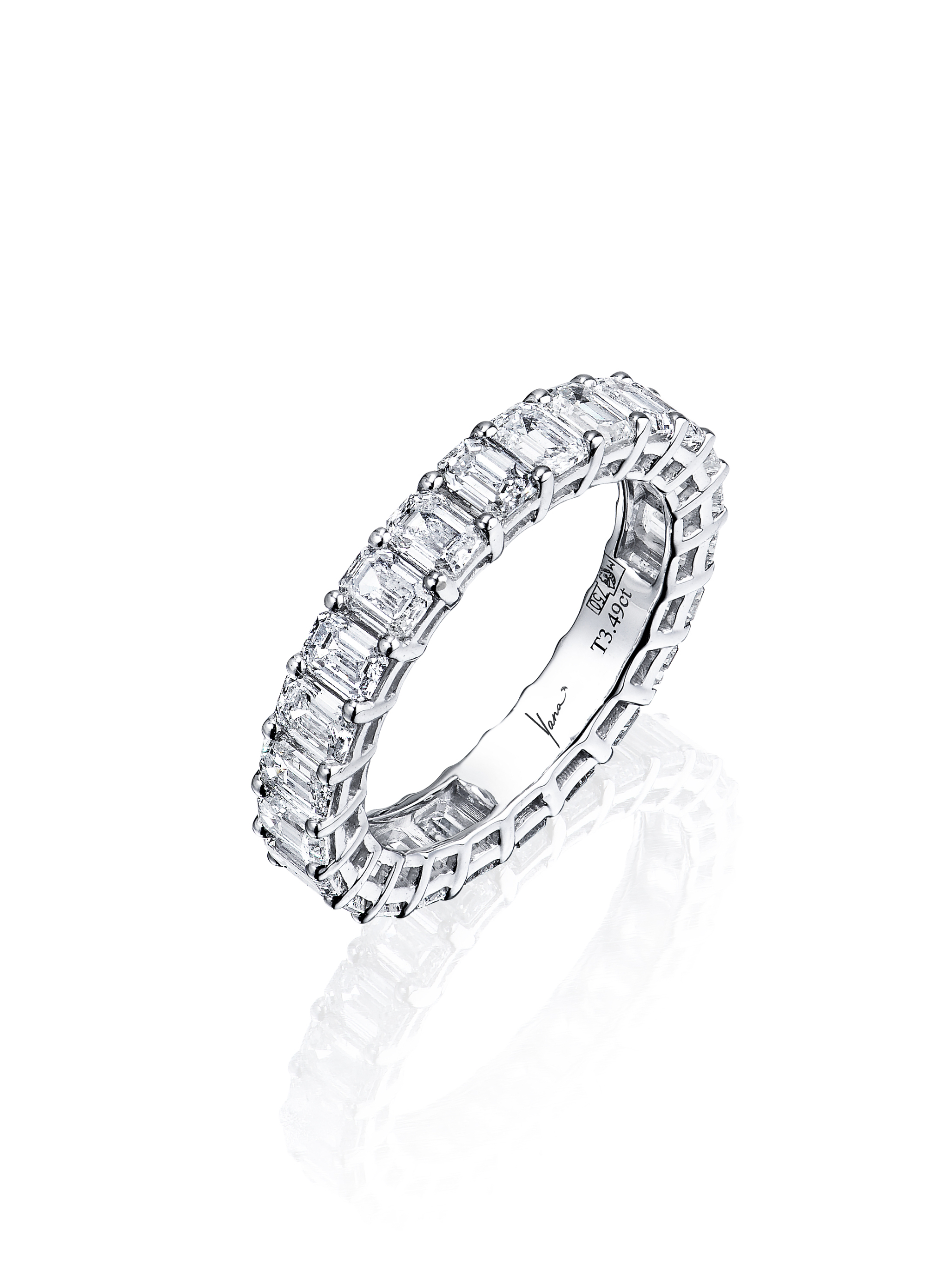 A white gold ring inlaid with 24 emerald-cut diamonds with a total weight of 3.49 ct H/SI.