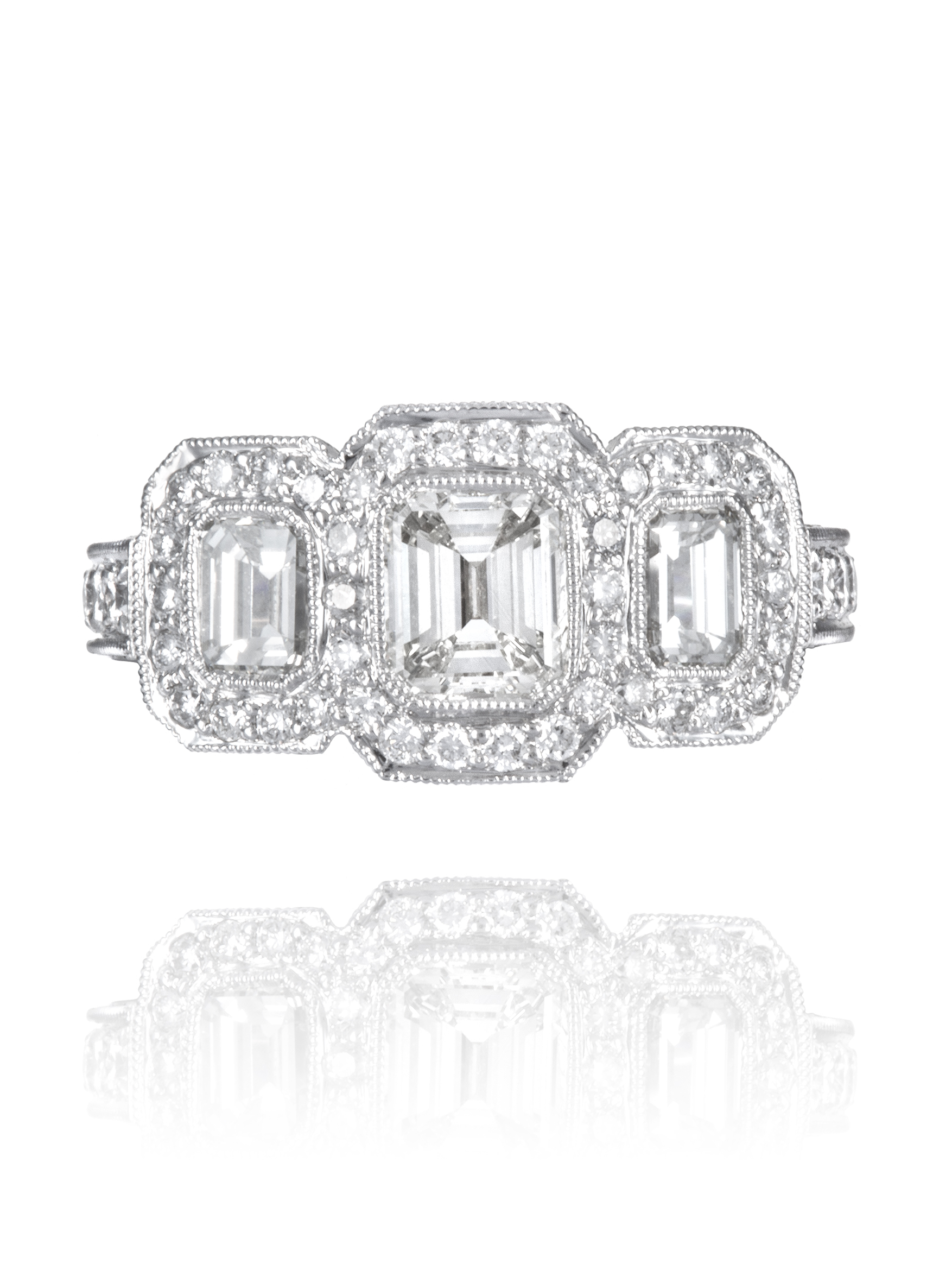 Ring made of white gold, incrusted with 185 round-cut diamonds with a total weight of 1.57 ct and 3 baguette-cut diamonds with a total weight of 2.13 ct.