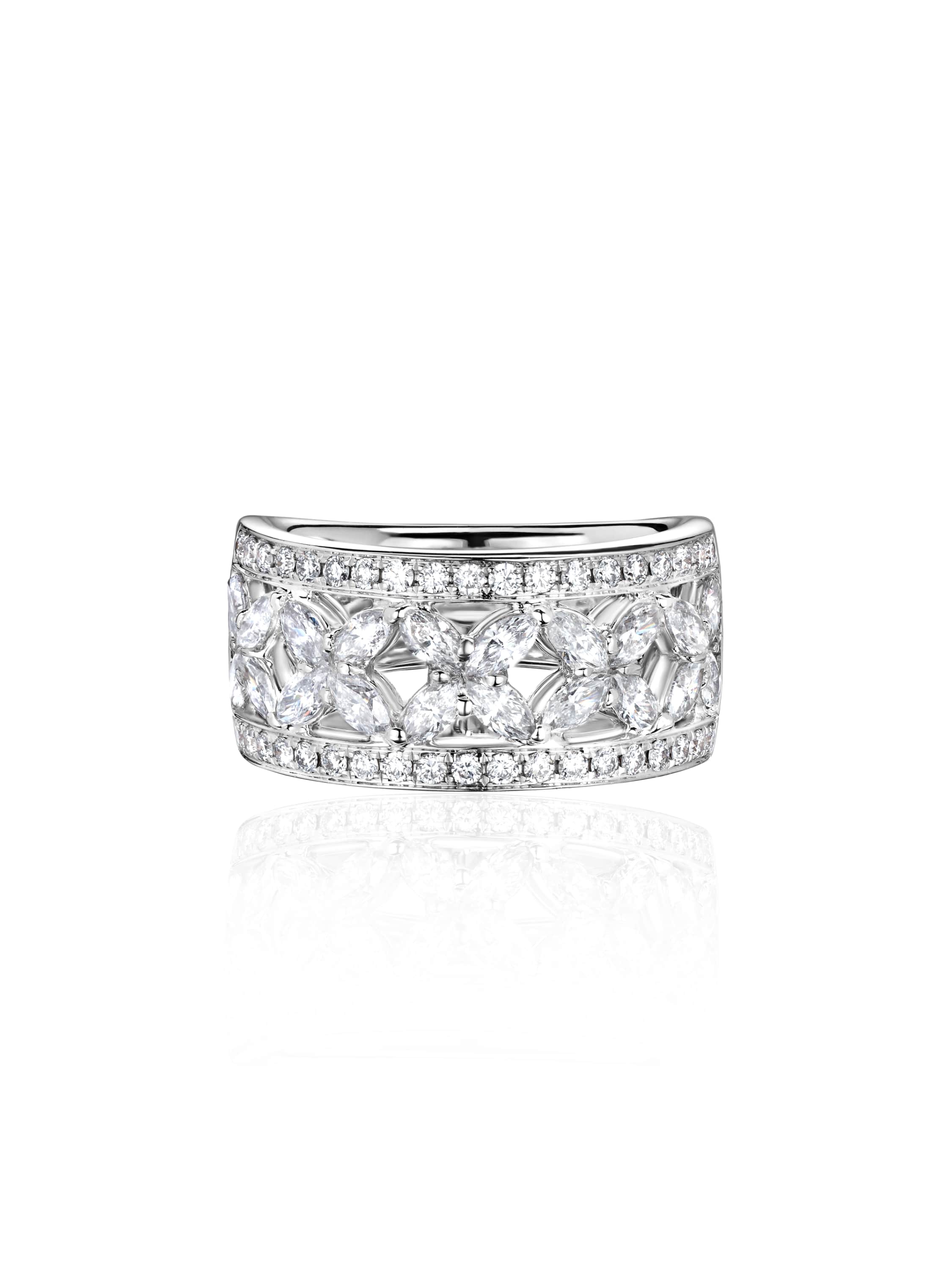 White gold ring with 20 marquise-cut diamonds weighing 1.16 ct and 38 round-cut diamonds weighing 0.40 ct.