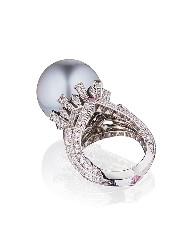 White gold ring with a black pearl weighing 8.06 g with a diameter of 17.7 mm, 80 pink diamonds with a total weight of 0.78 ct, 172 grey diamonds with a total weight of 1 ct and 5 princess-cut spinels with a total weight of 0.69 ct.