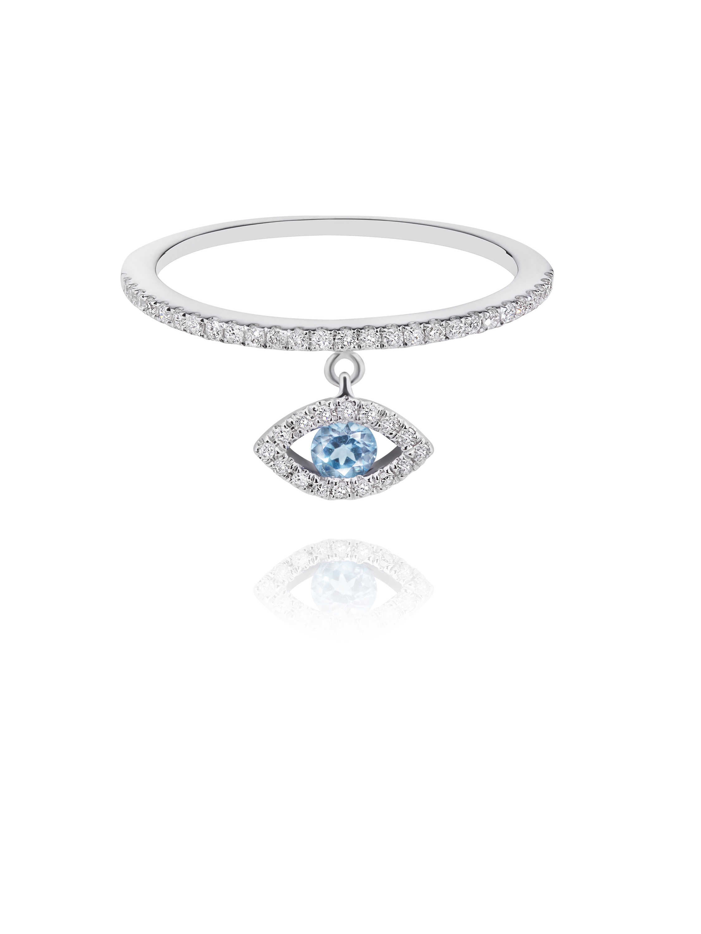 White gold ring with blue quartz weighing 0.16 ct and 43 round-cut diamonds with a total weight of 0.16 ct.