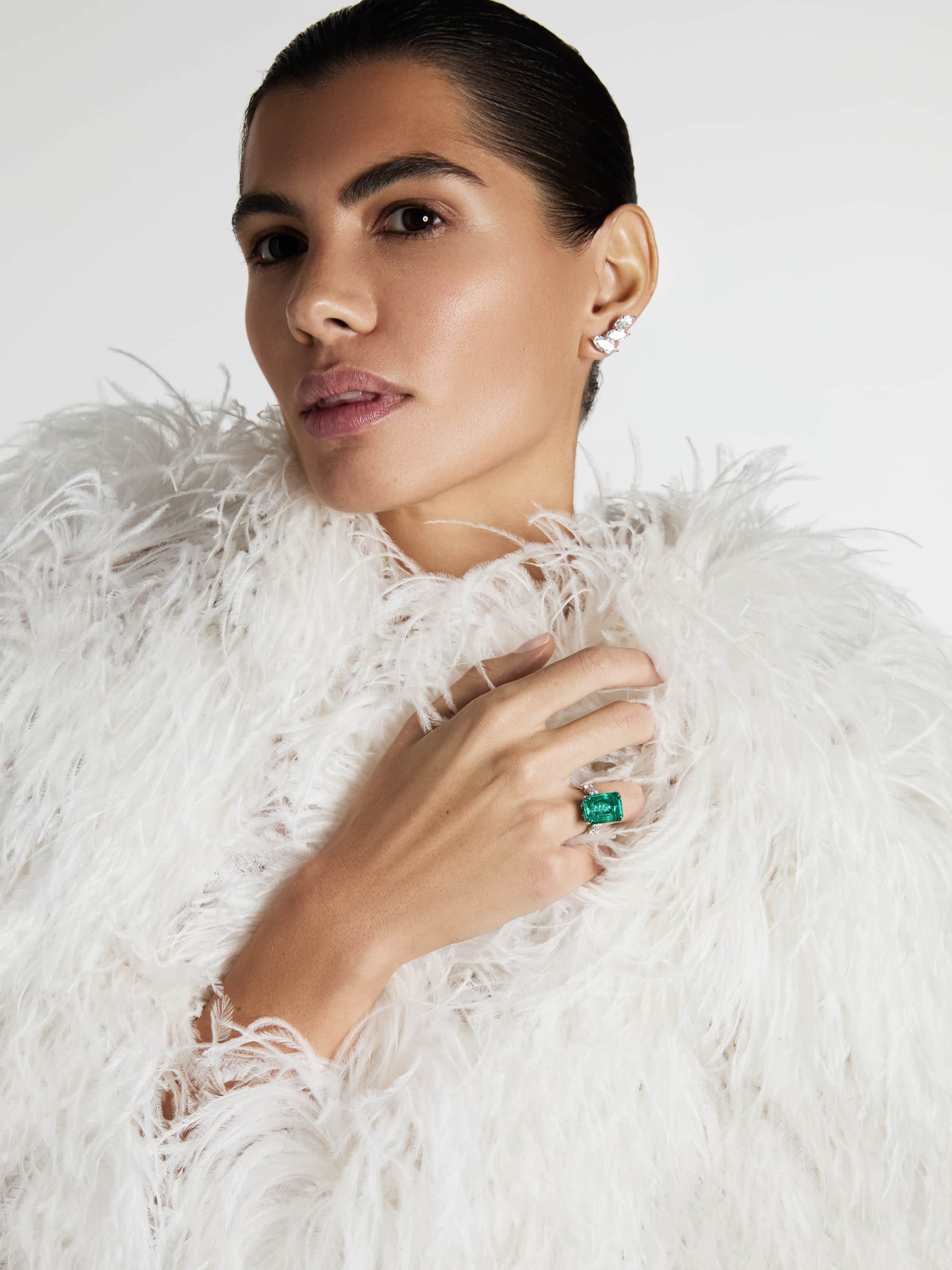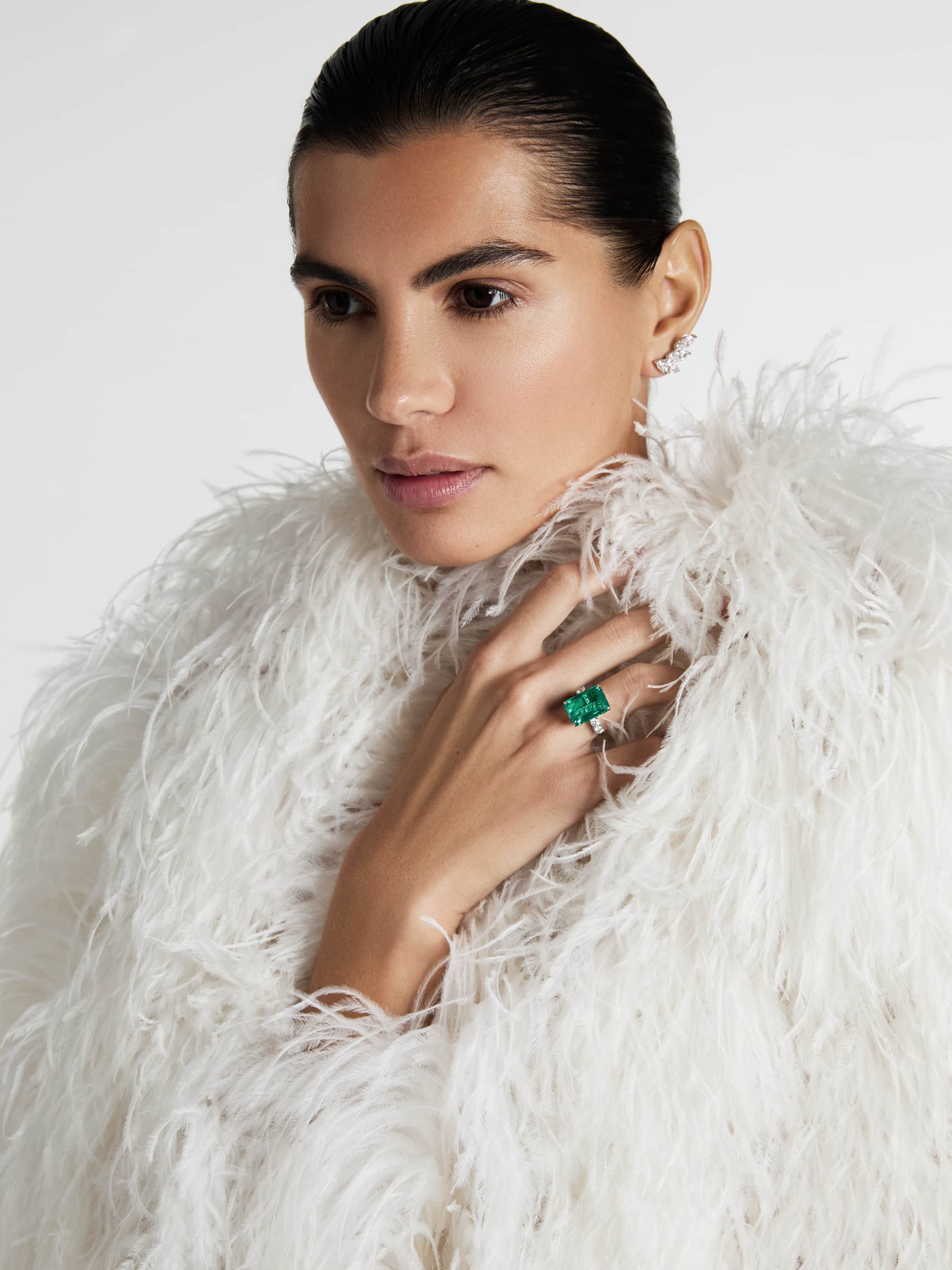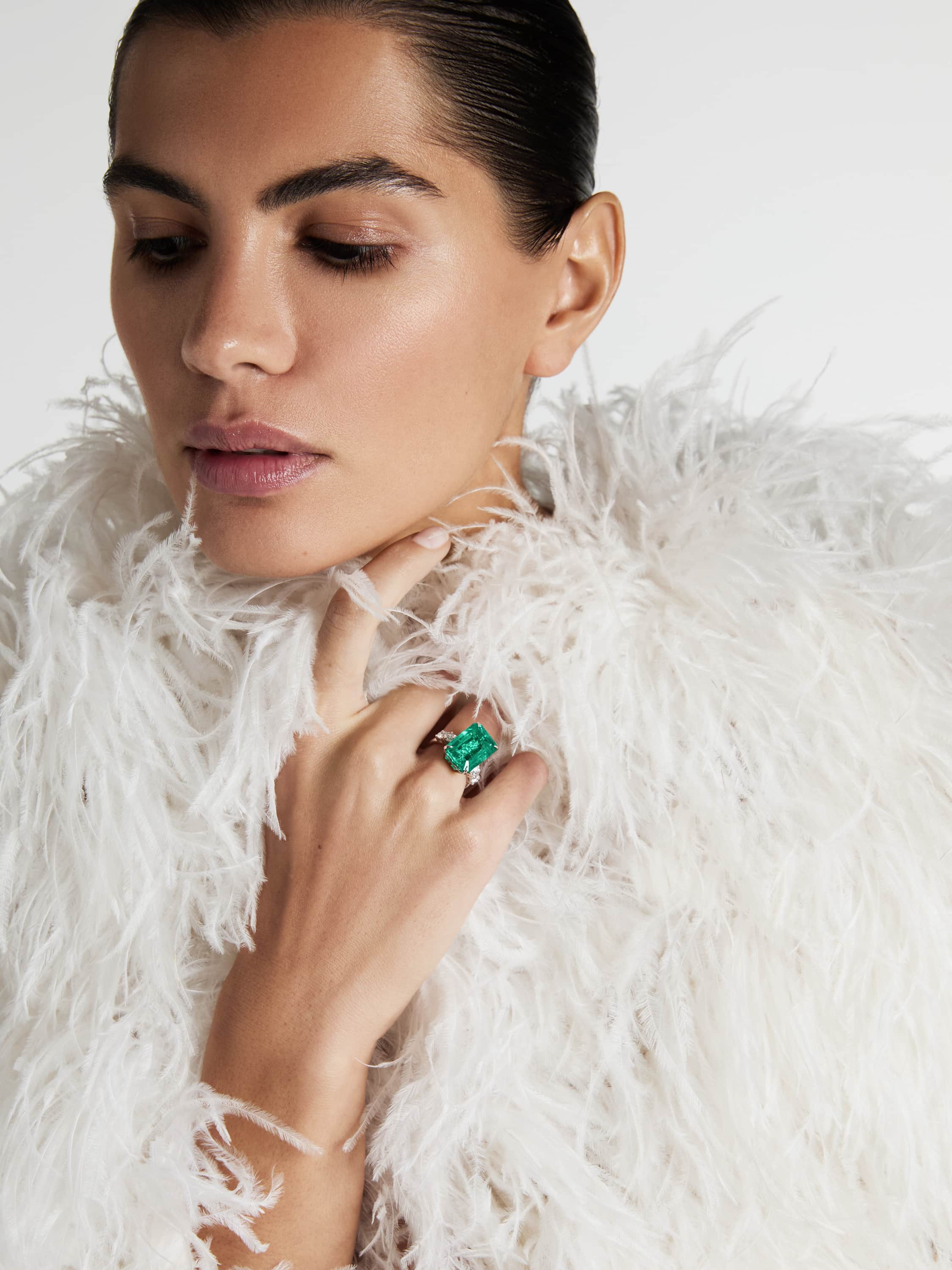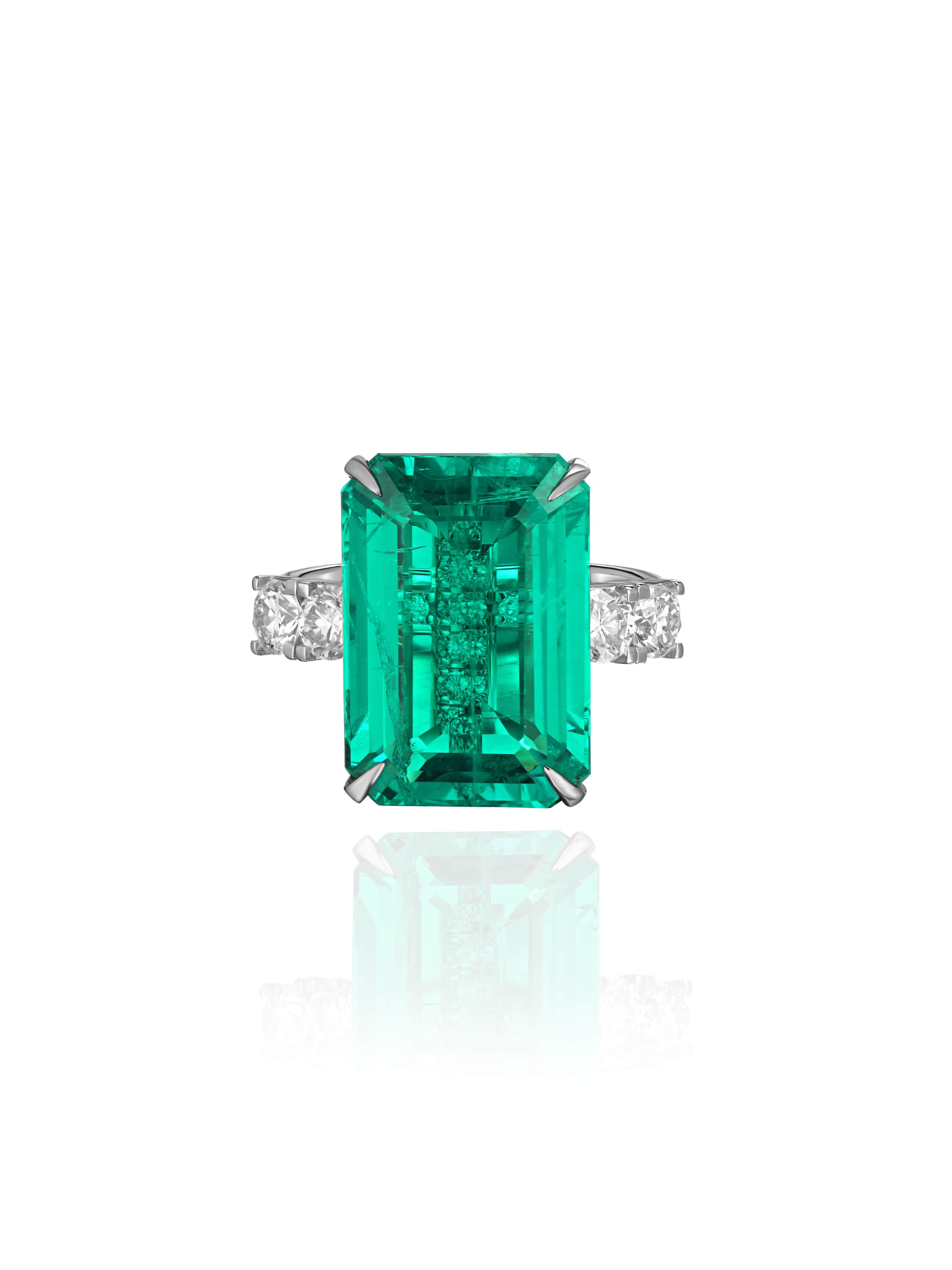 White gold ring with 1 recrystallized octagon-cut emerald weighing 10.52 ct and 12 round LG diamonds weighing 0.80 ct.