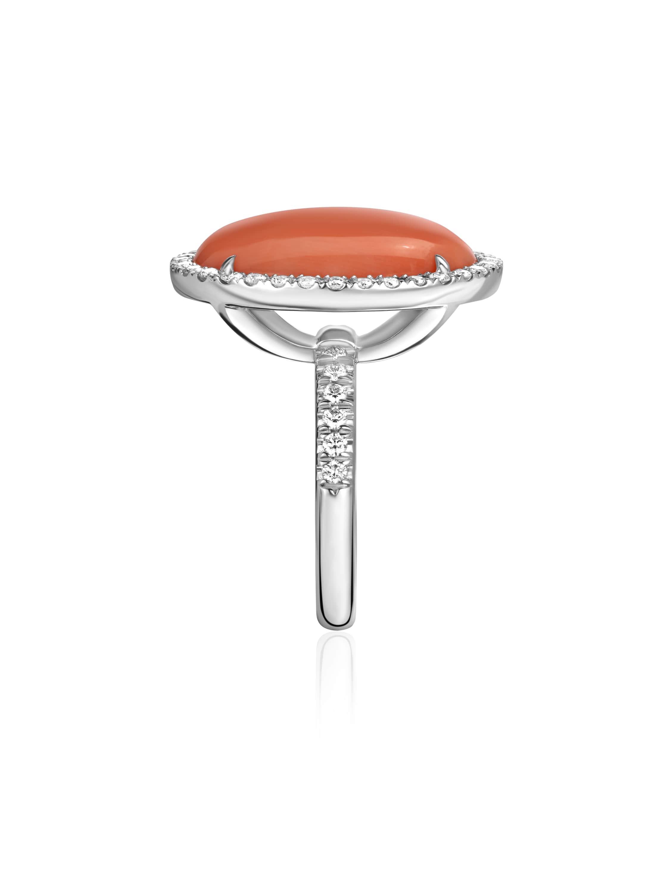 White gold ring with an oval coral weighing 11.13 ct and 44 round-cut diamonds with a total weight of 0.69 ct.