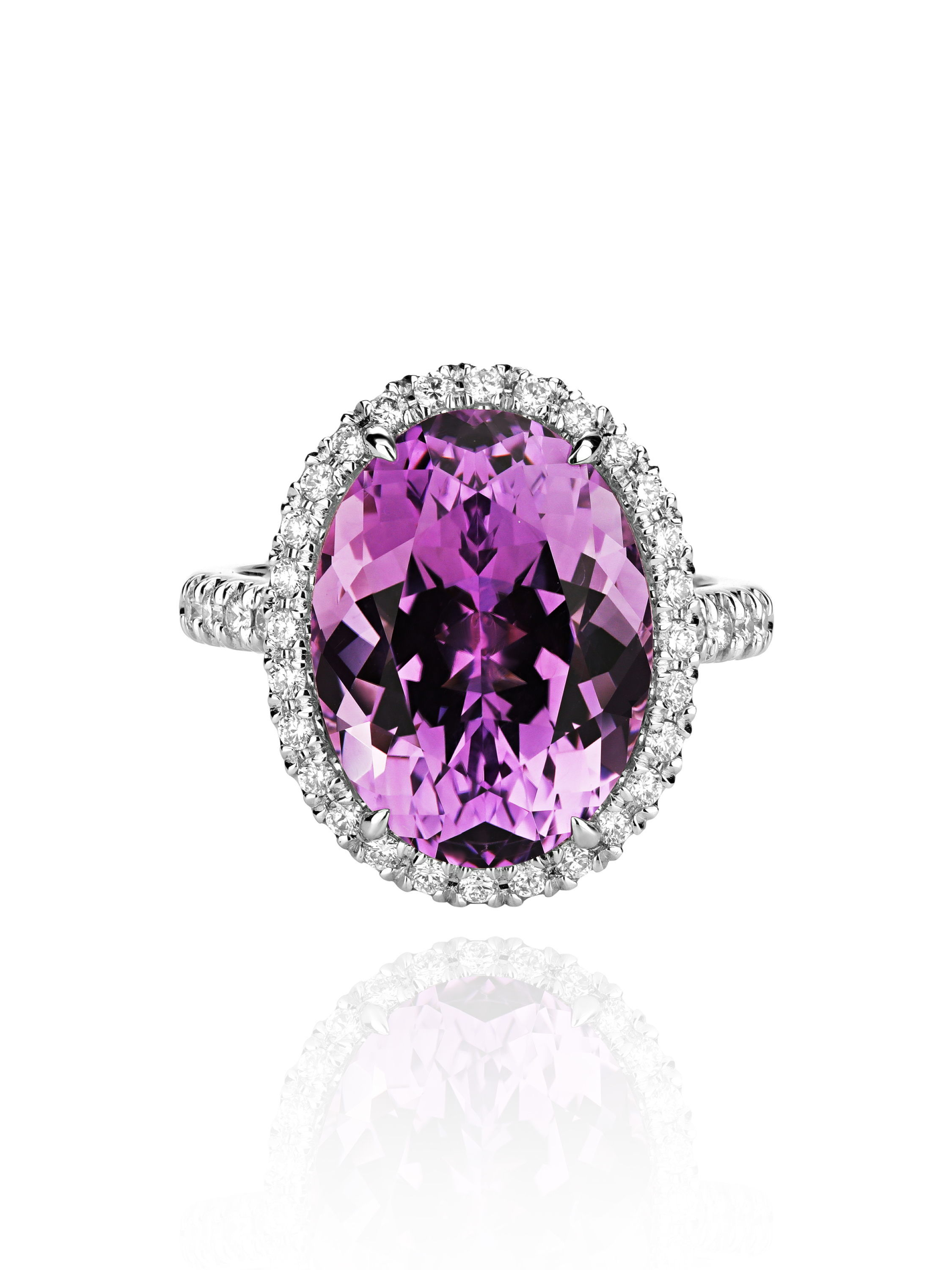 White gold ring set with an oval amethyst weighing 9.22 ct and 40 round-cut diamonds with a total weight of 0.51 ct.