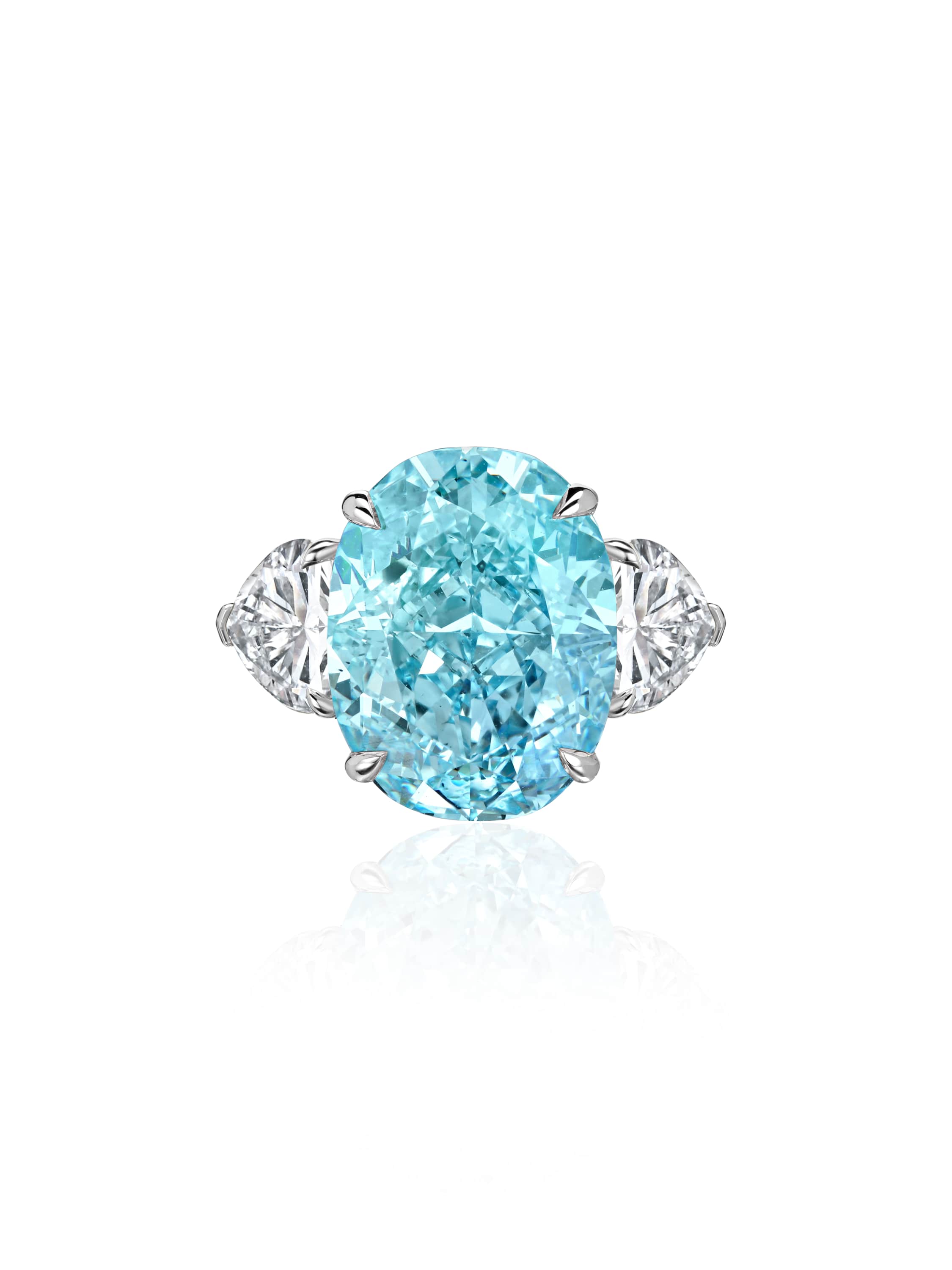 White gold ring with an 11.42 ct FVB/VS2 oval lab-grown diamond and 2 lab-grown heart-cut diamonds 2.19 ct F/VS1.