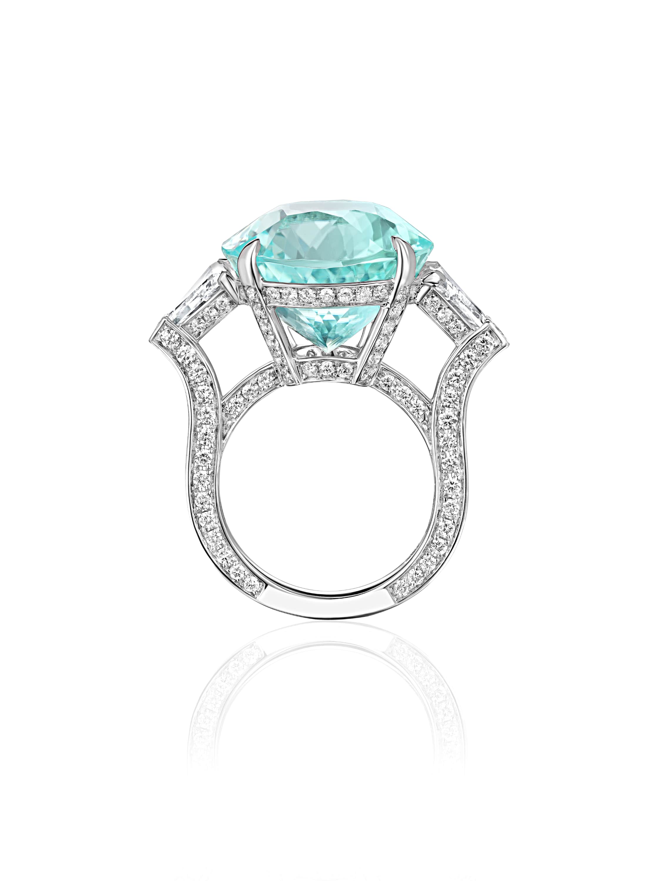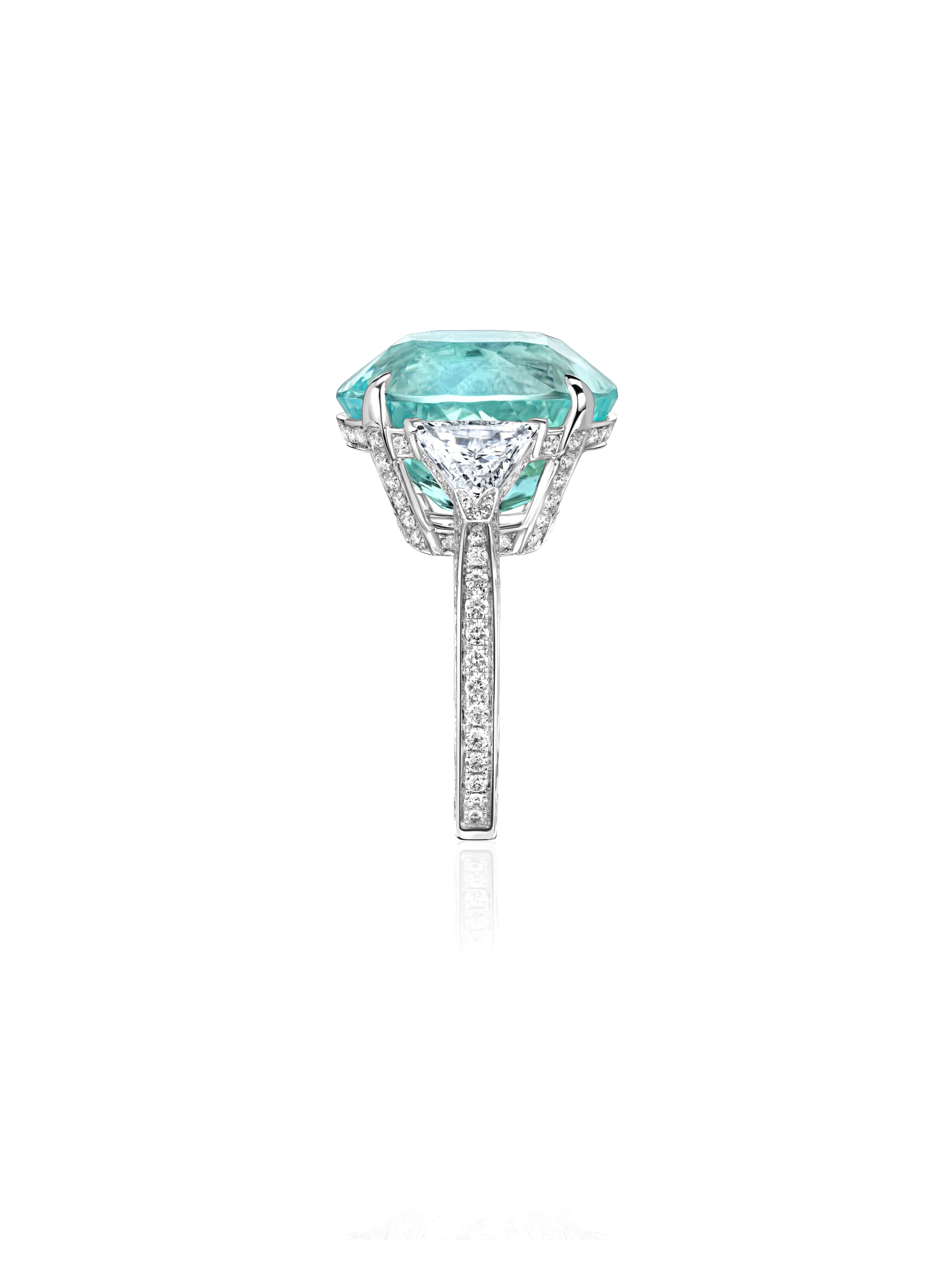 White gold ring with an oval Paraiba tourmaline 21.47 ct, 2 trillion-cut diamonds 1.42 ct and 166 round diamonds weighing 1.55 ct.