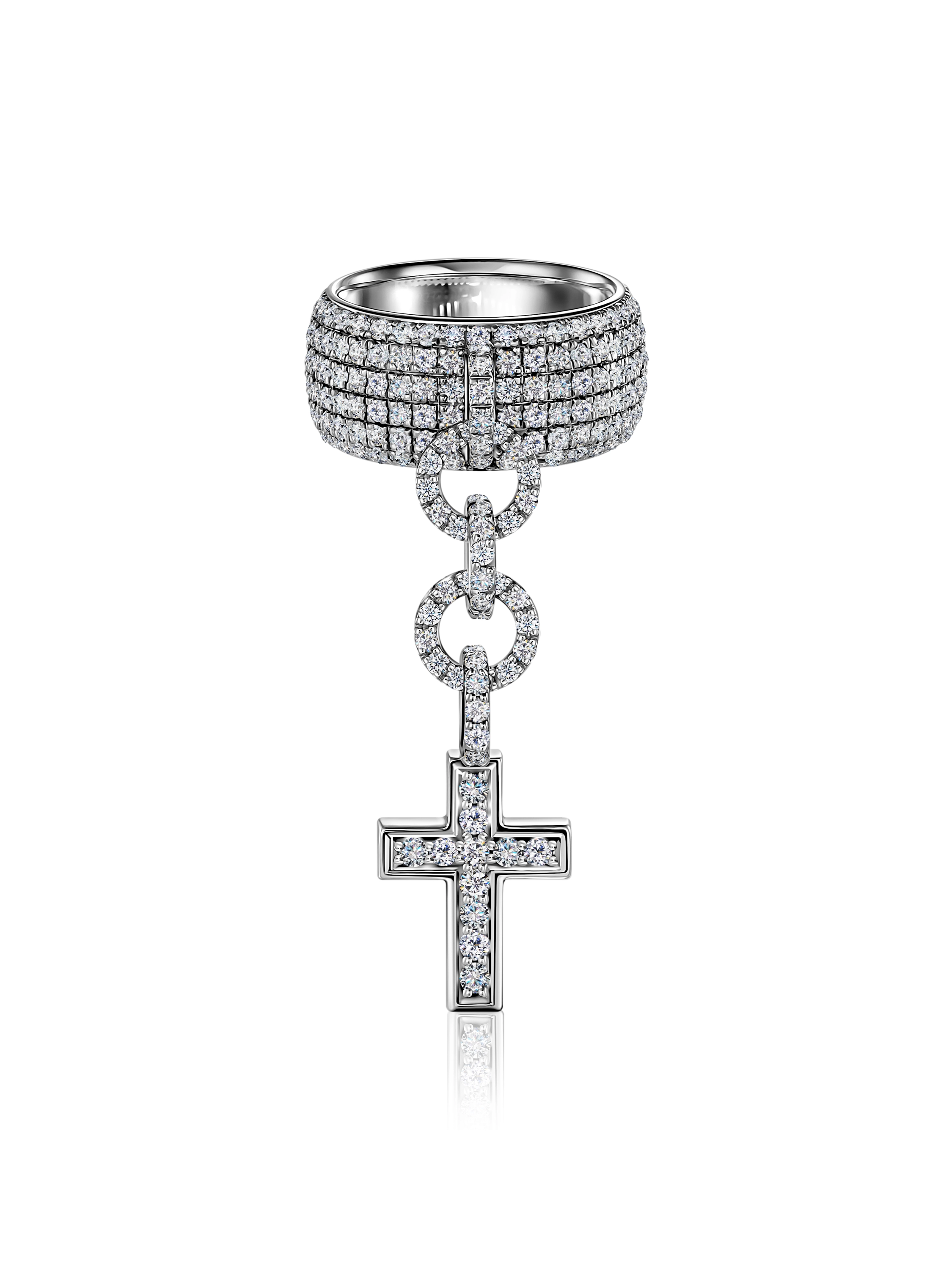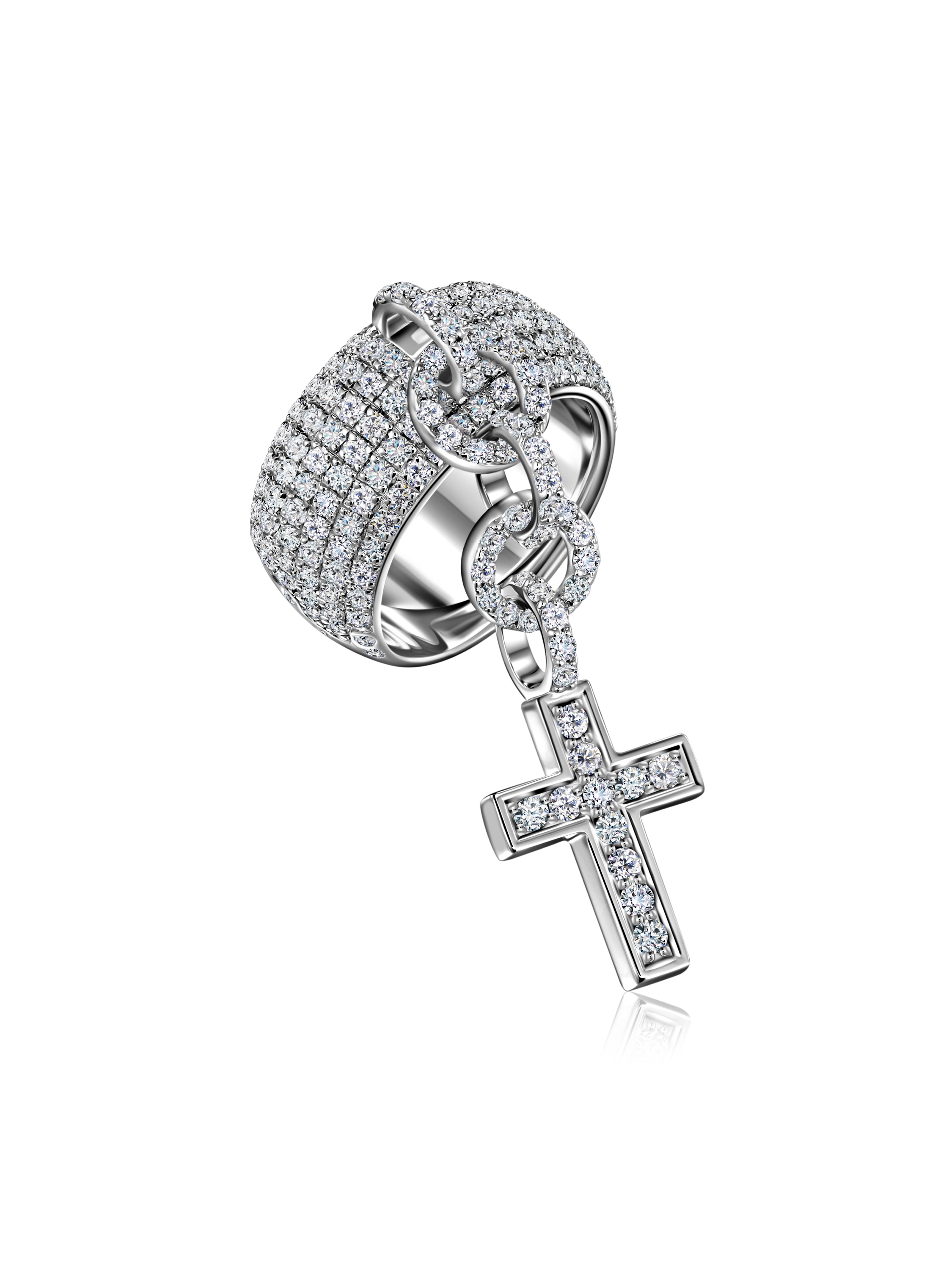 A white gold ring with a cross-shaped pendant, encrusted with 247 round-cut diamonds with a total weight of 3.52 ct. Weight: 12.85 g.