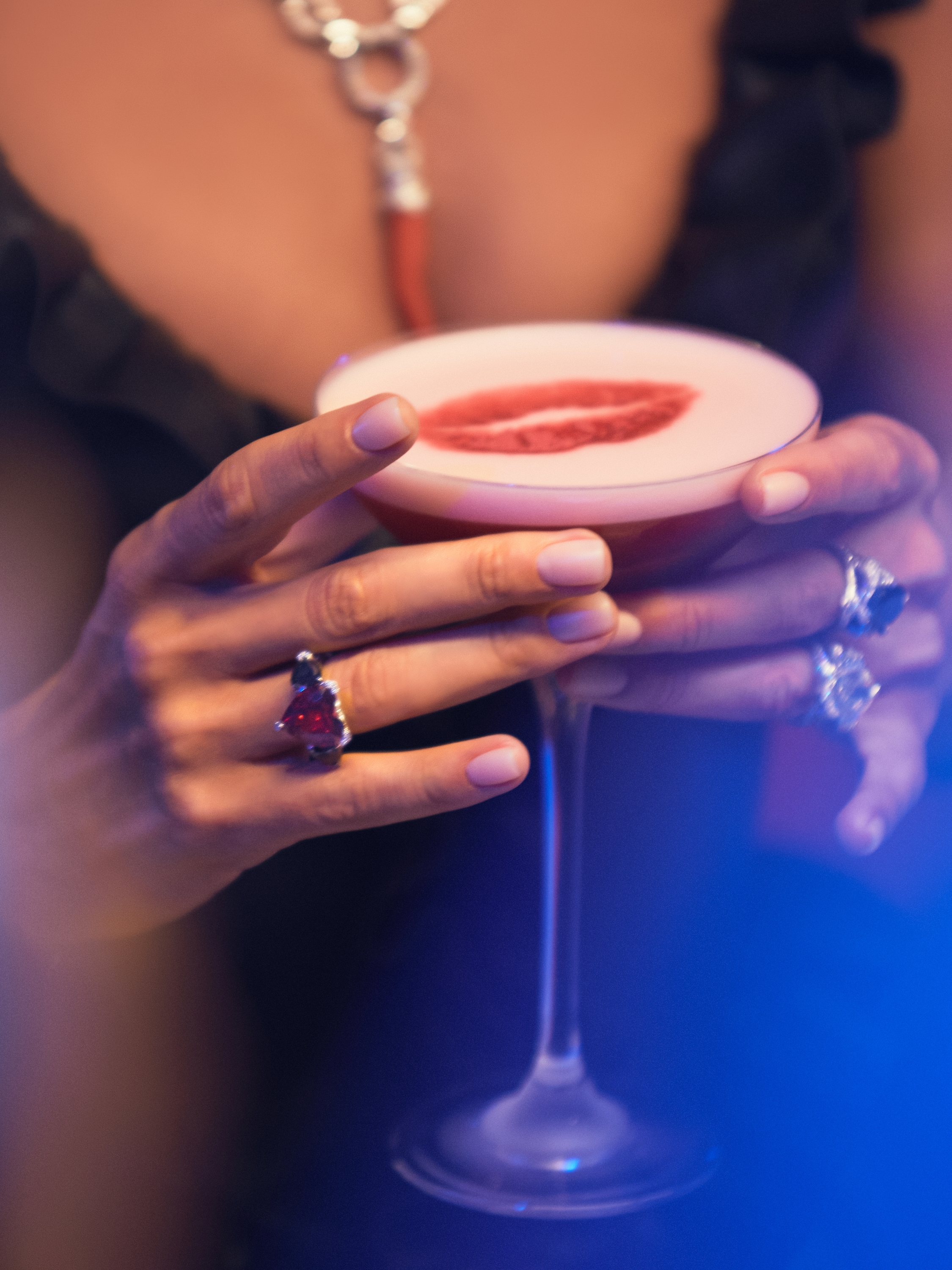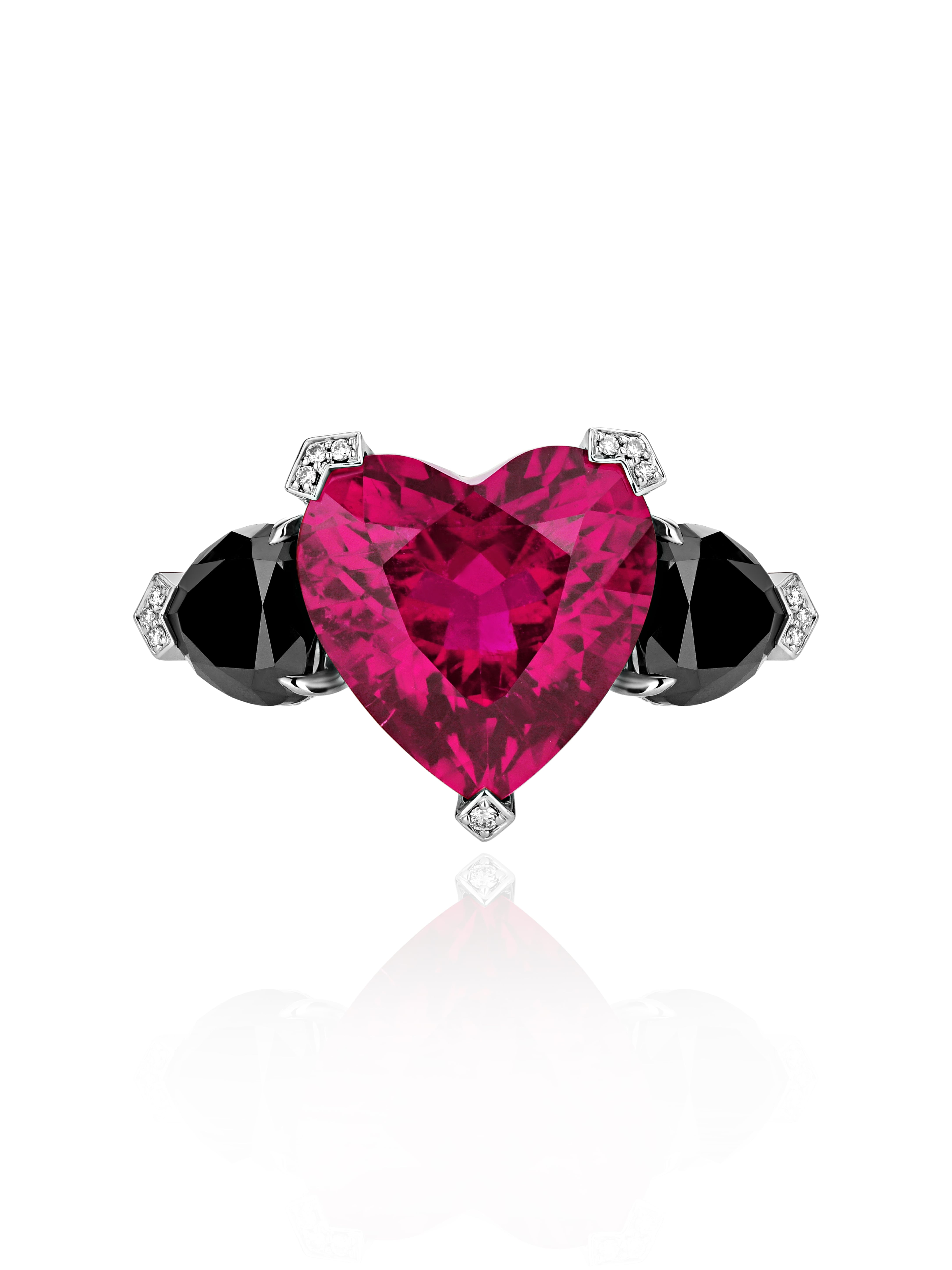 White gold ring with a heart-cut rubellite weighing 9.35 ct, 2 heart-cut black diamonds with a total weight of 3.16 ct, and 279 round-cut diamonds with a total weight of 1.40 ct.