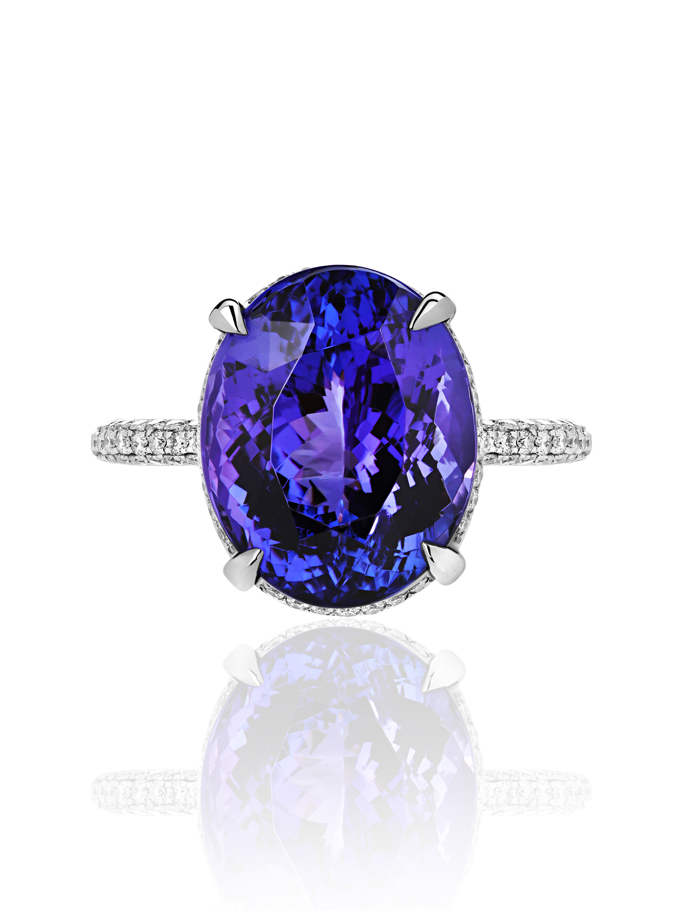 Ring made of white gold with an oval tanzanite weighing 9.05 ct and 204 round-cut diamonds with a total weight of 0.98 ct.
