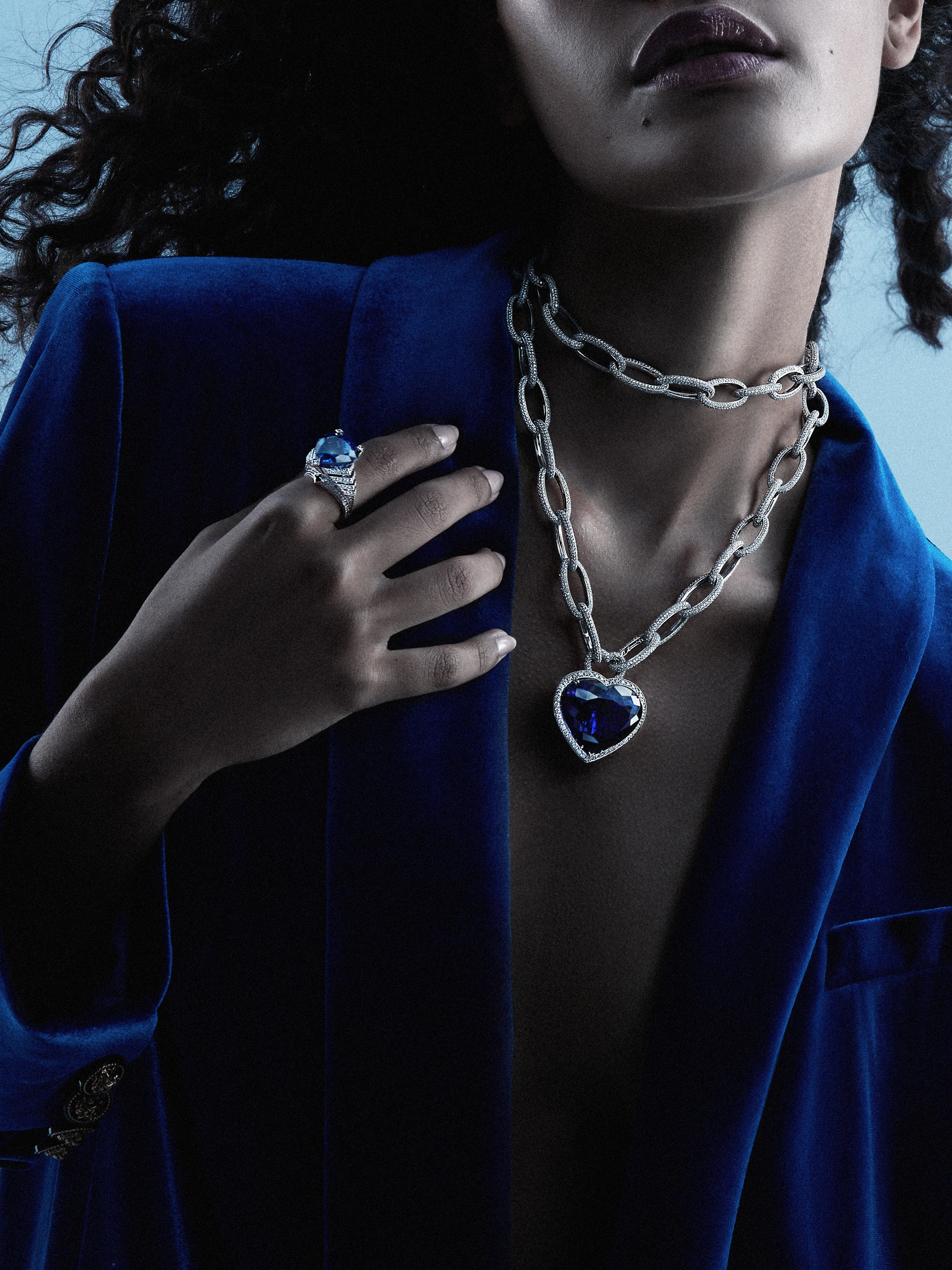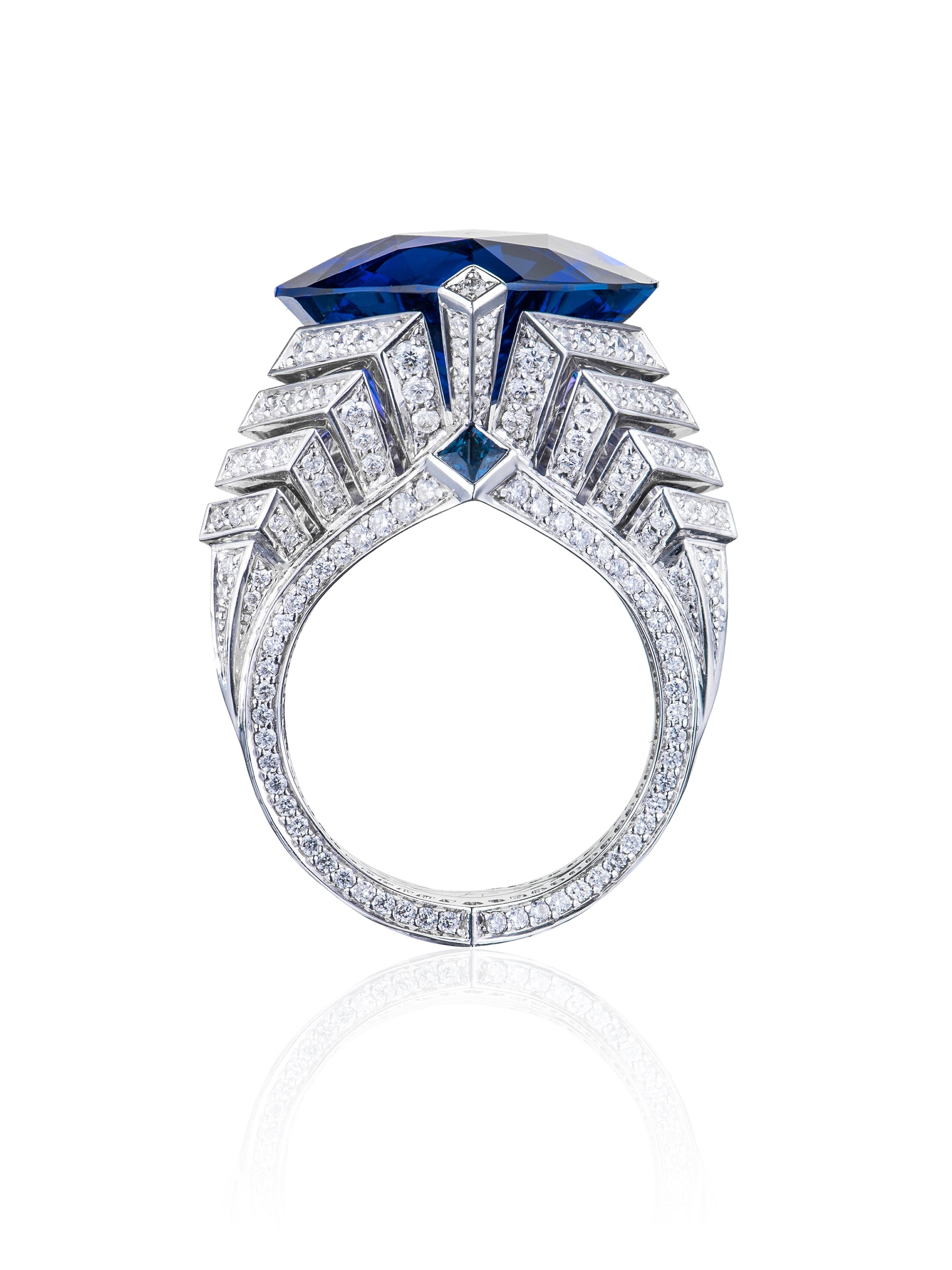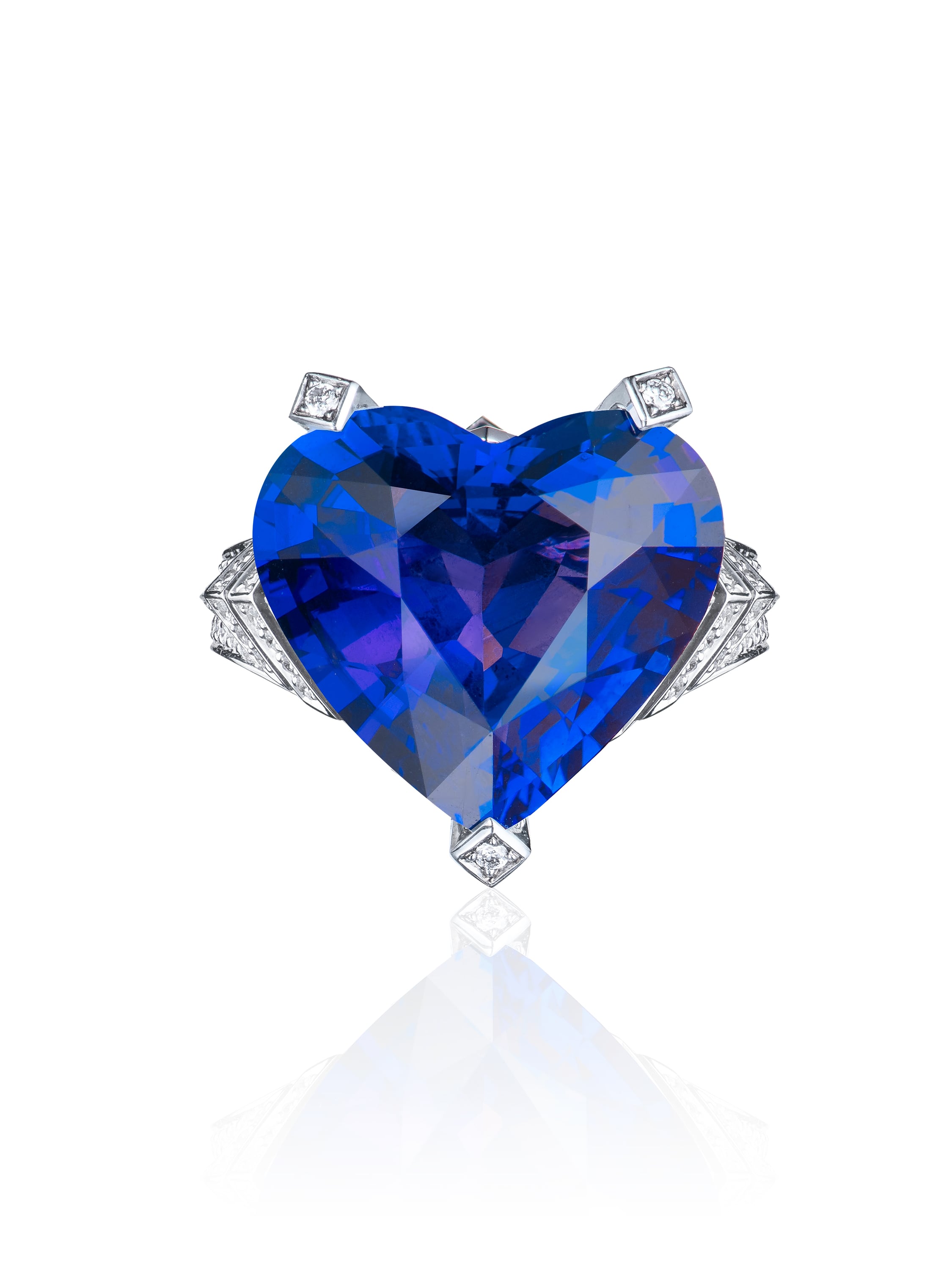 Ring made of white gold with a heart-cut tanzanite weighing 17.42 ct, 3 princess-cut sapphires with a total weight of 0.33 ct, and 380 round-cut diamonds with a total weight of 2.02 ct.