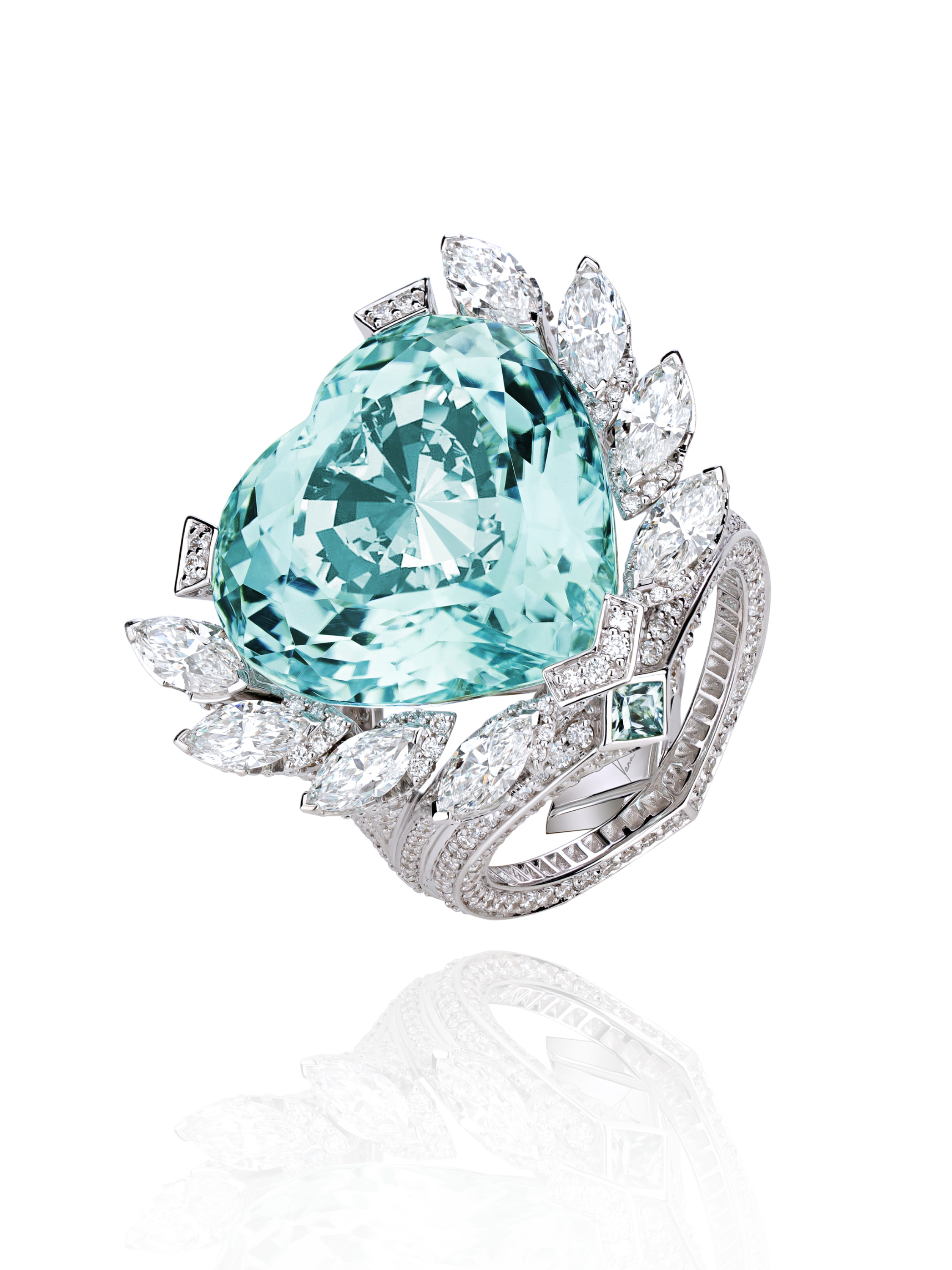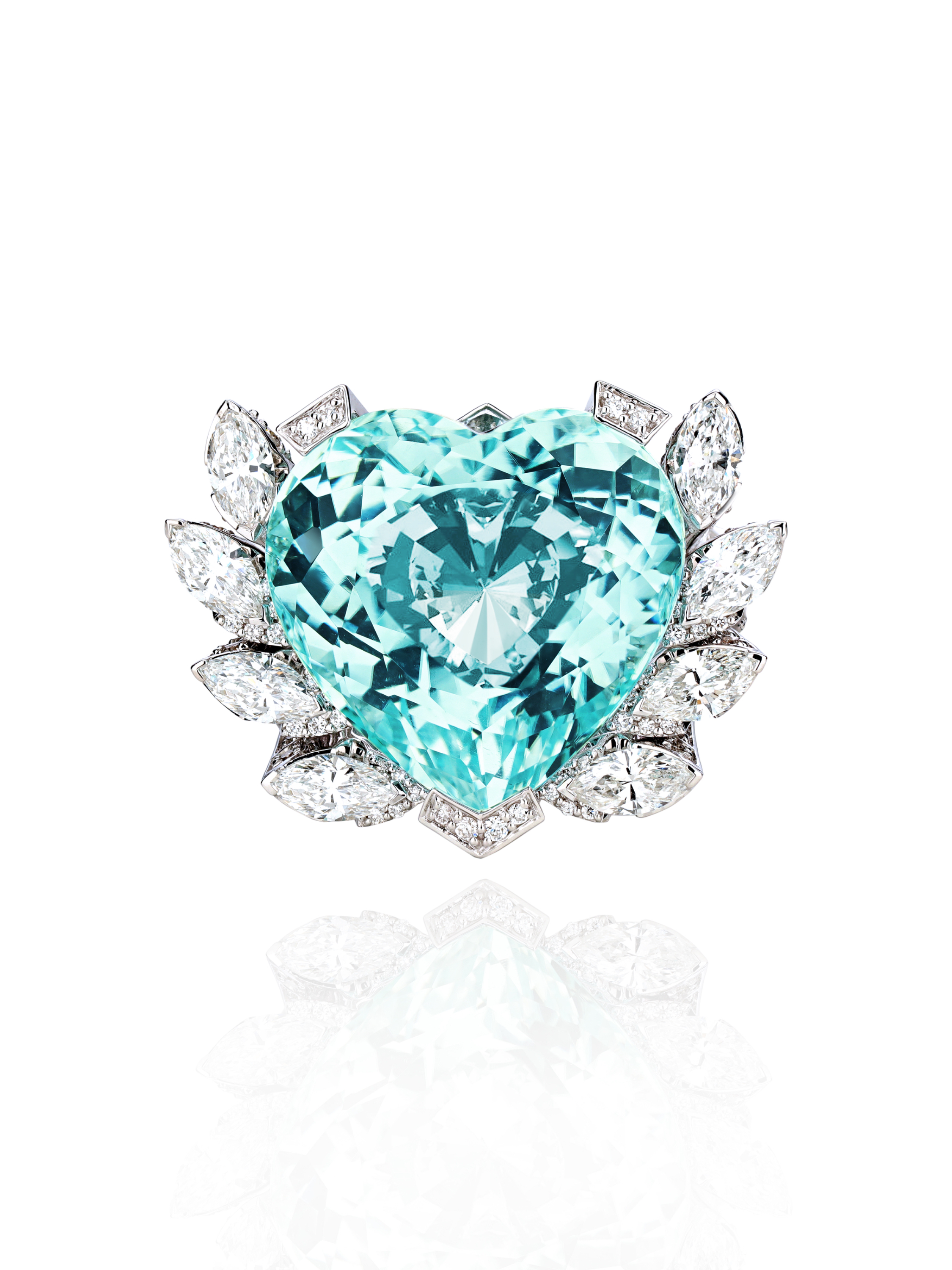 White gold ring with a heart-cut Paraiba tourmaline weighing 19.14 ct, 8 marquise-cut diamonds with a total weight of 1.55 ct, 3 princess-cut diamonds with a total weight of 0.28 ct and 635 round-cut diamonds with a total weight of 3.43 ct.