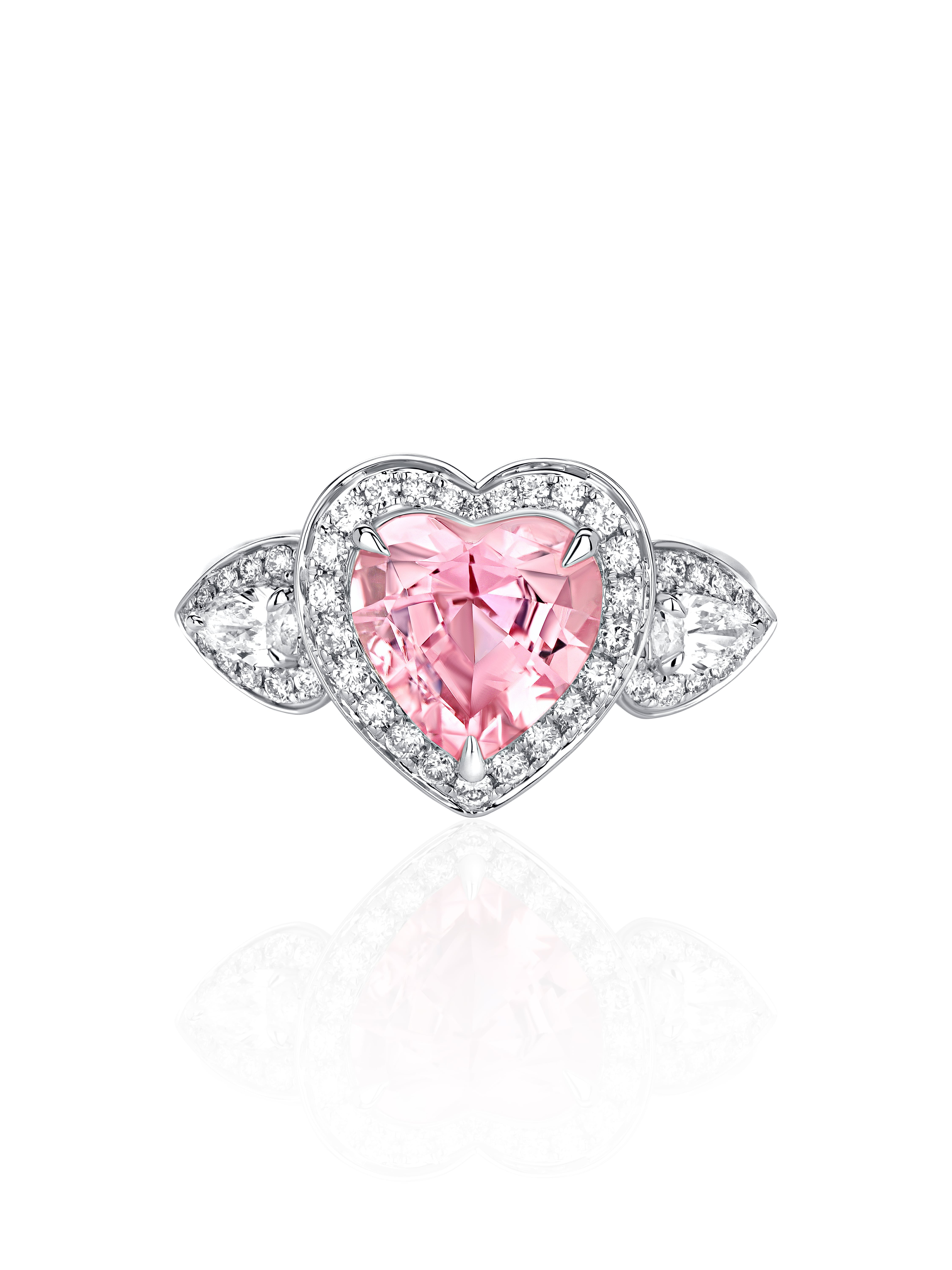 White gold ring with a heart-cut tourmaline weighing 2.53 ct, 2 pear-cut diamonds 0.3 ct and 44 round-cut diamonds with a total weight of 0.35 ct.
