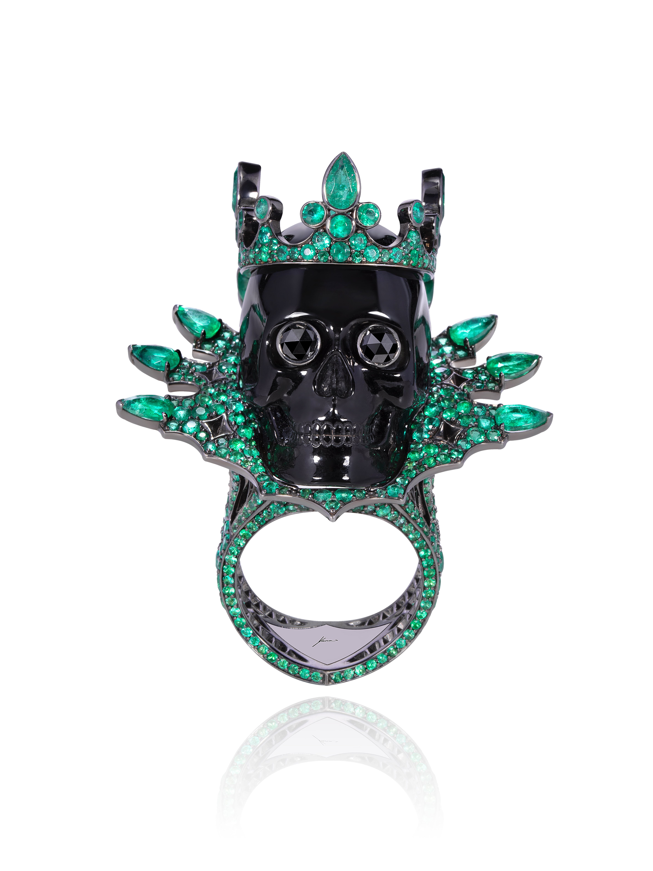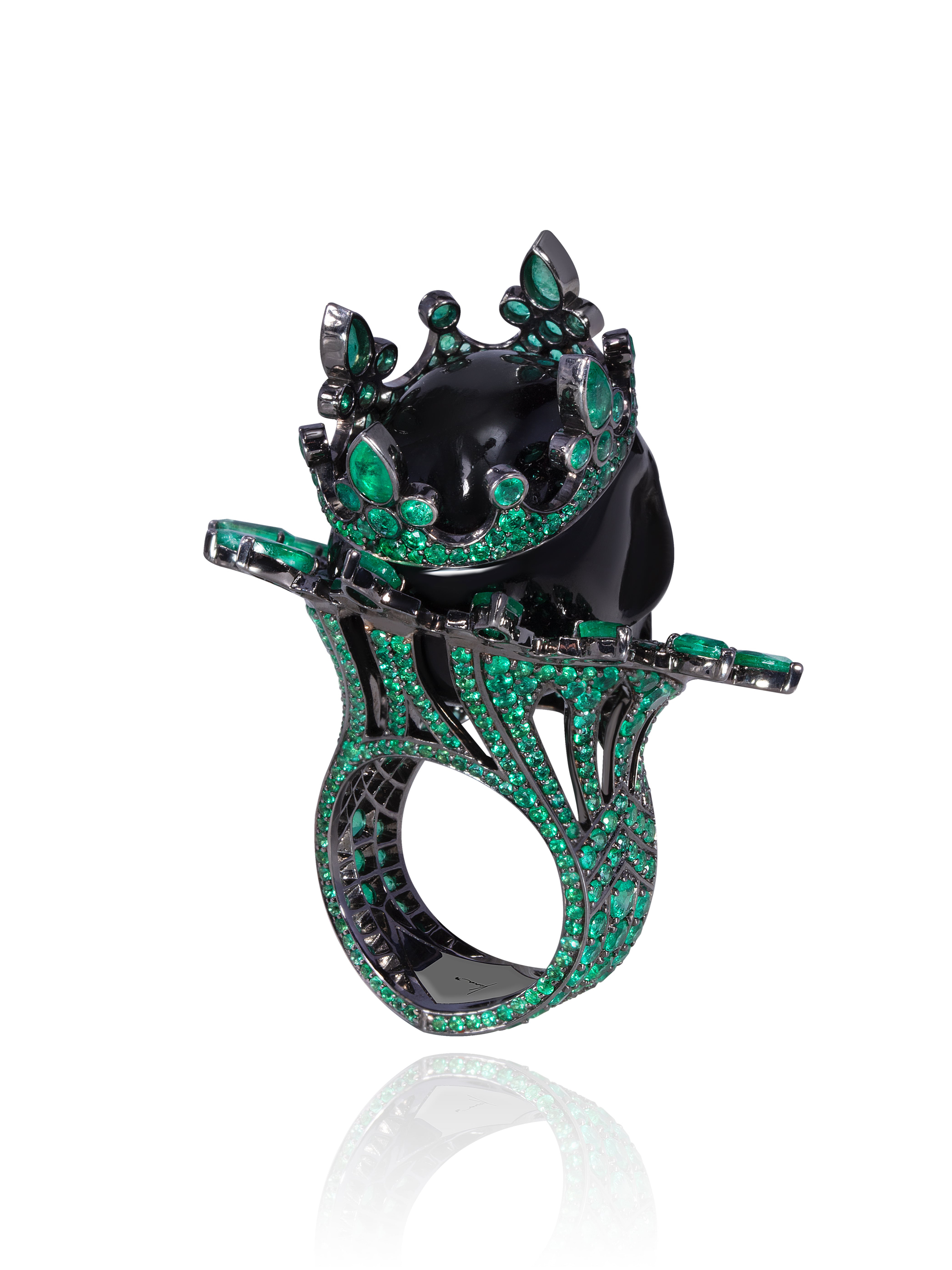 A blackened gold ring inlaid with an obsidian weighing 12.69 g, 5 black diamonds with a total weight of 0.59 ct, 13 pear-cut emeralds with a total weight of 2.45 ct, and 538 emeralds with a total weight of 5.78 ct.