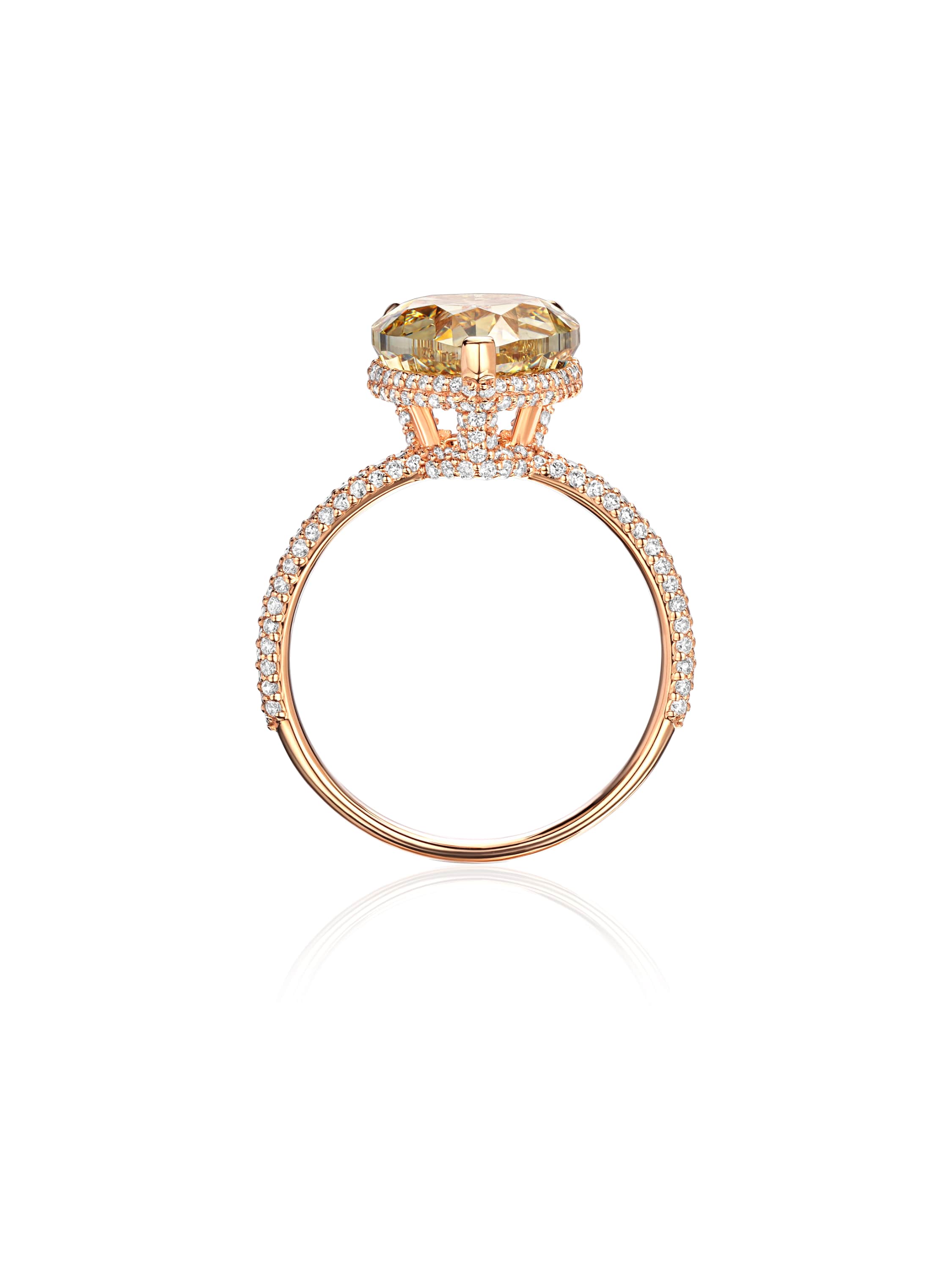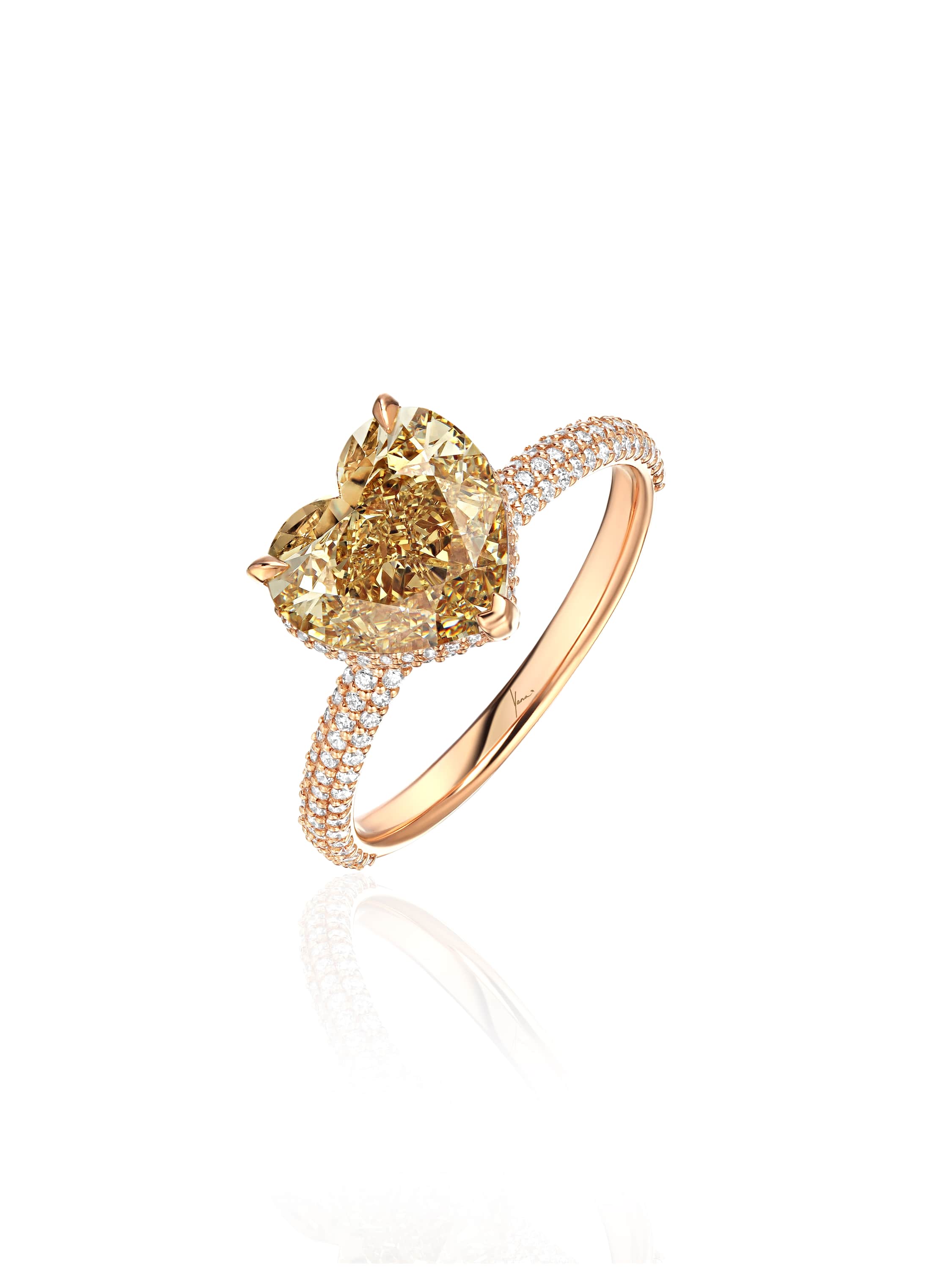 Rose gold ring with a brown heart-cut diamond weighing 3.11 ct and 221 round diamonds weighing 0.52 ct.