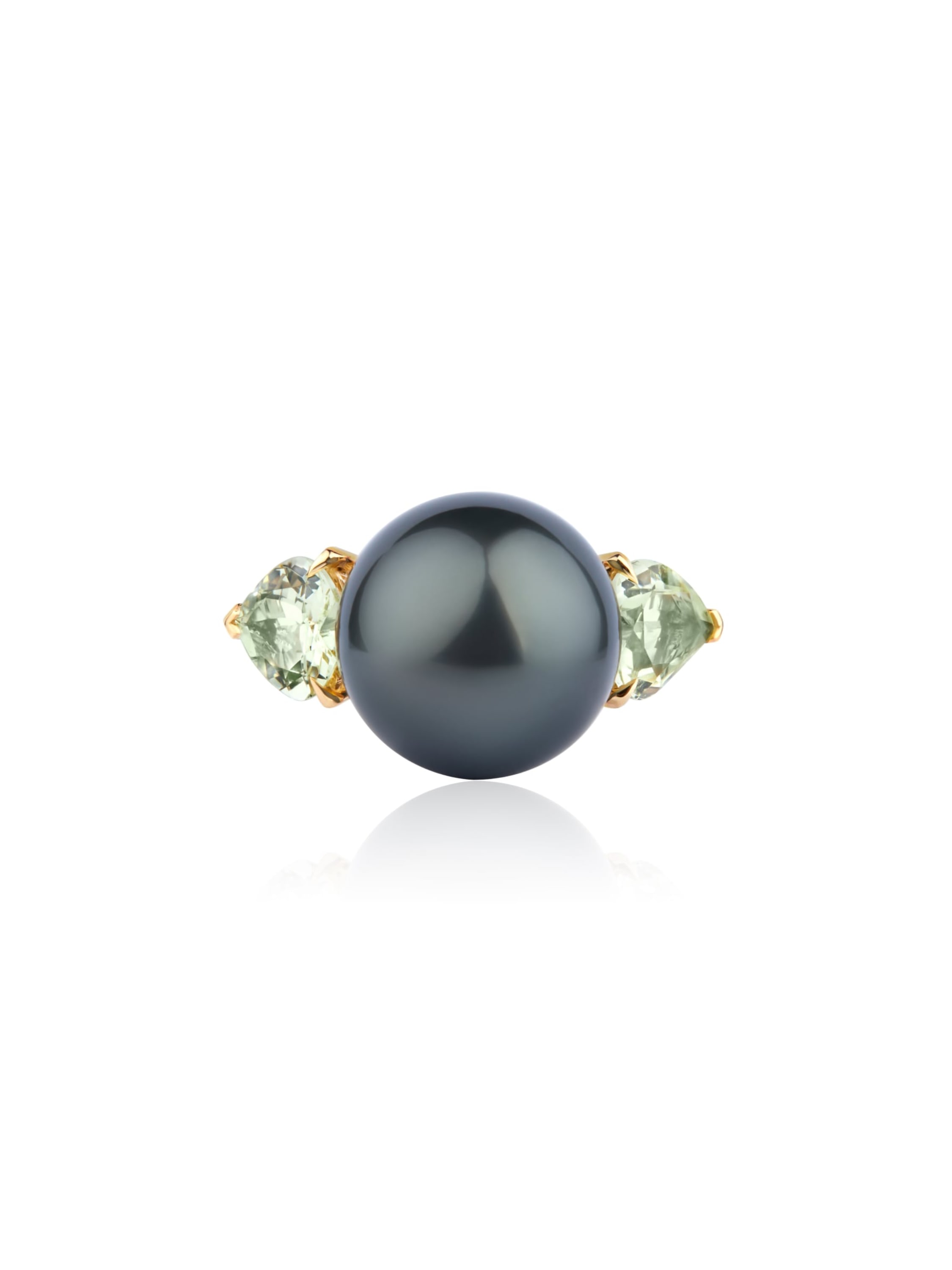 Yellow gold ring with 1 black pearl 3.70 g d 13.71 mm and 2 heart-cut beryls weighing 1.72 ct.