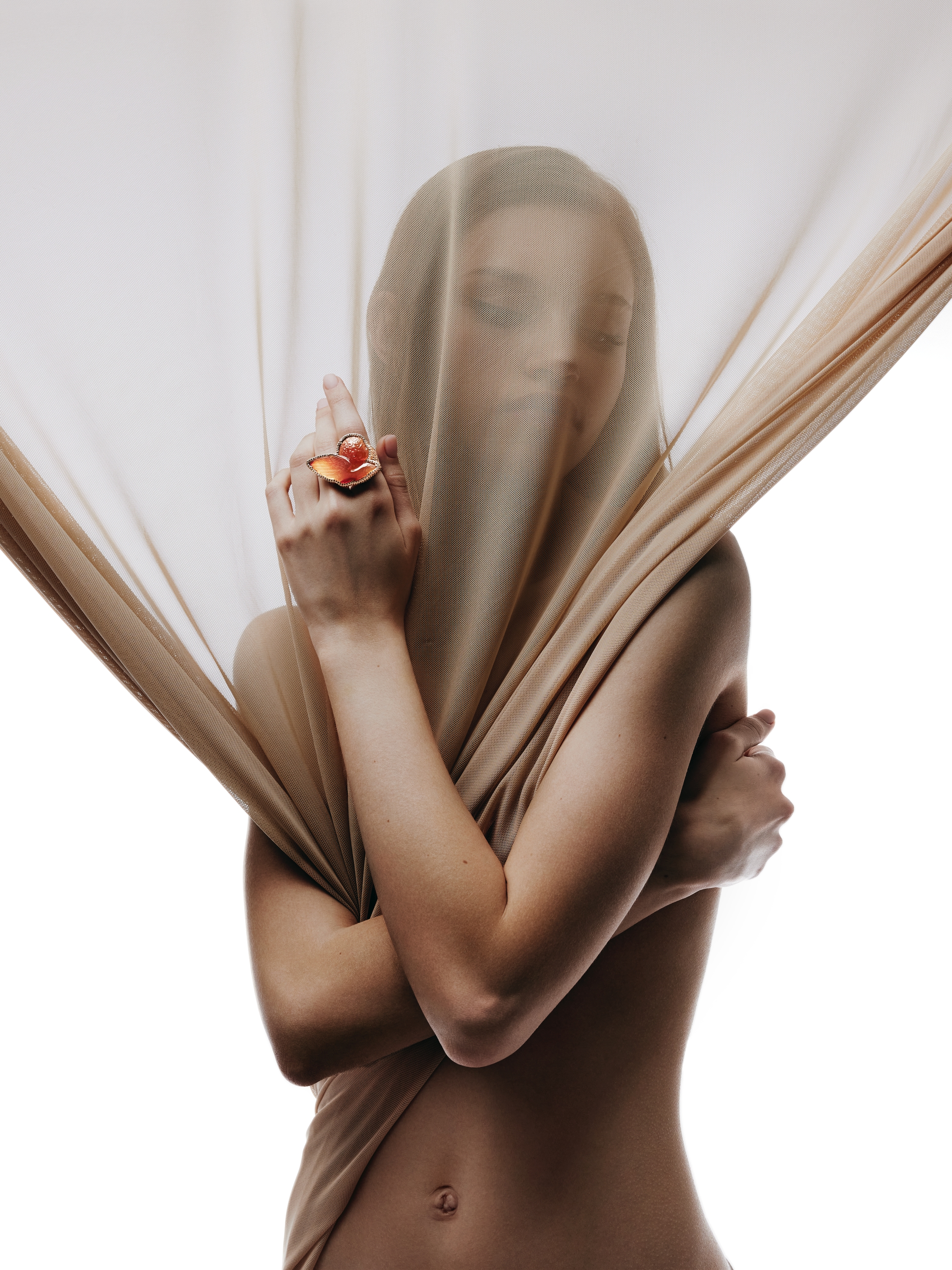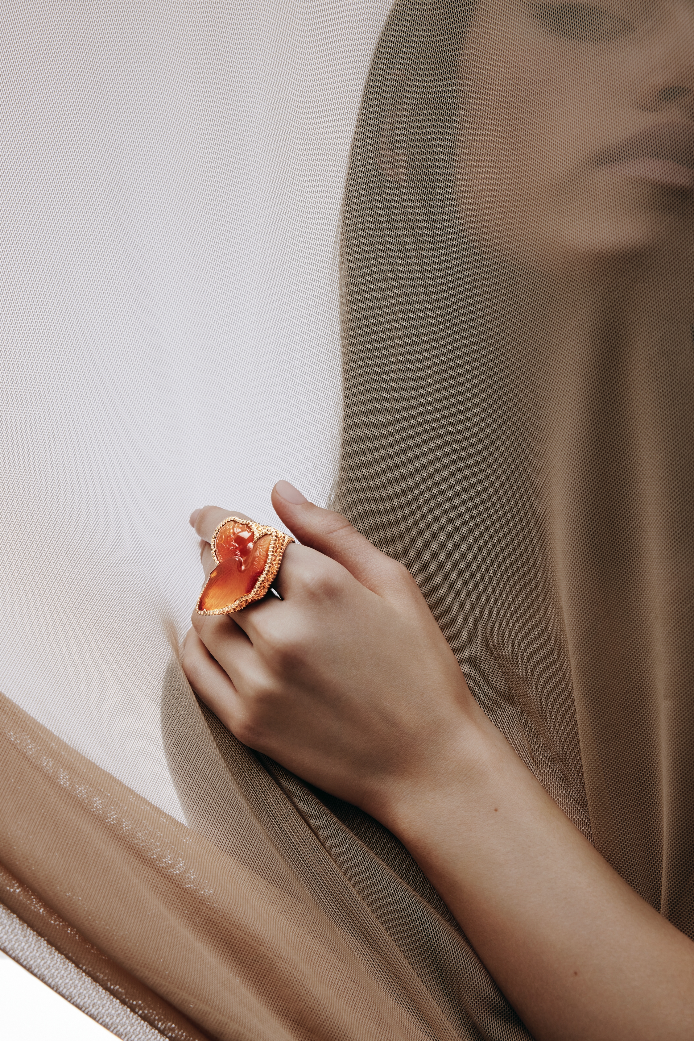 Yellow gold ring set with a carnelian cameo with an angel weighing 4.83 g and 566 round-cut diamonds with a total weight of 5.02 ct.