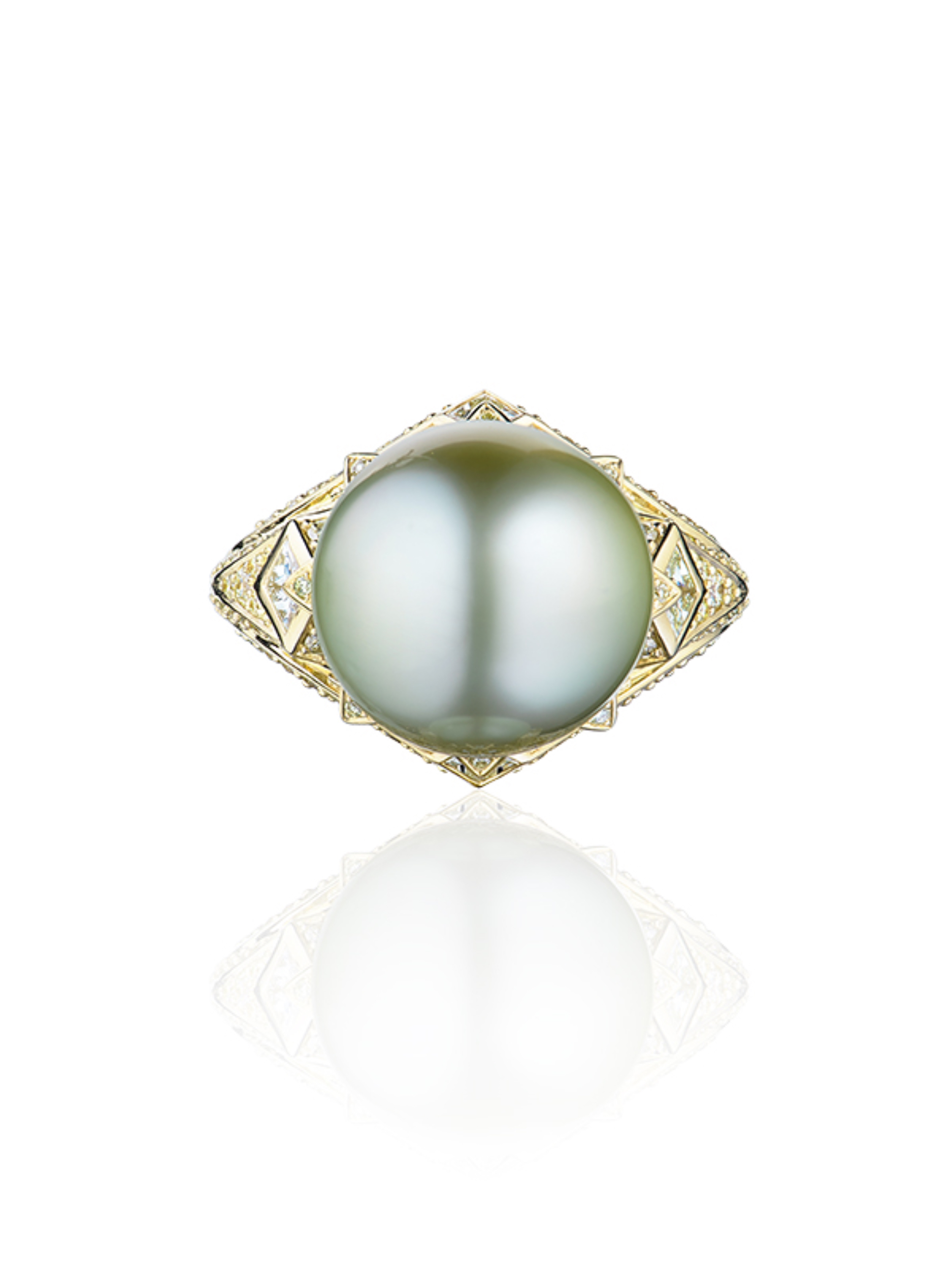 Yellow gold ring inlaid with 1 large Tahitian pearl weighing 18.27 ct (13.92*13.66), 248 round diamonds with a total weight of 1.72 ct and 5 princess-cut diamonds of 0.62 ct.