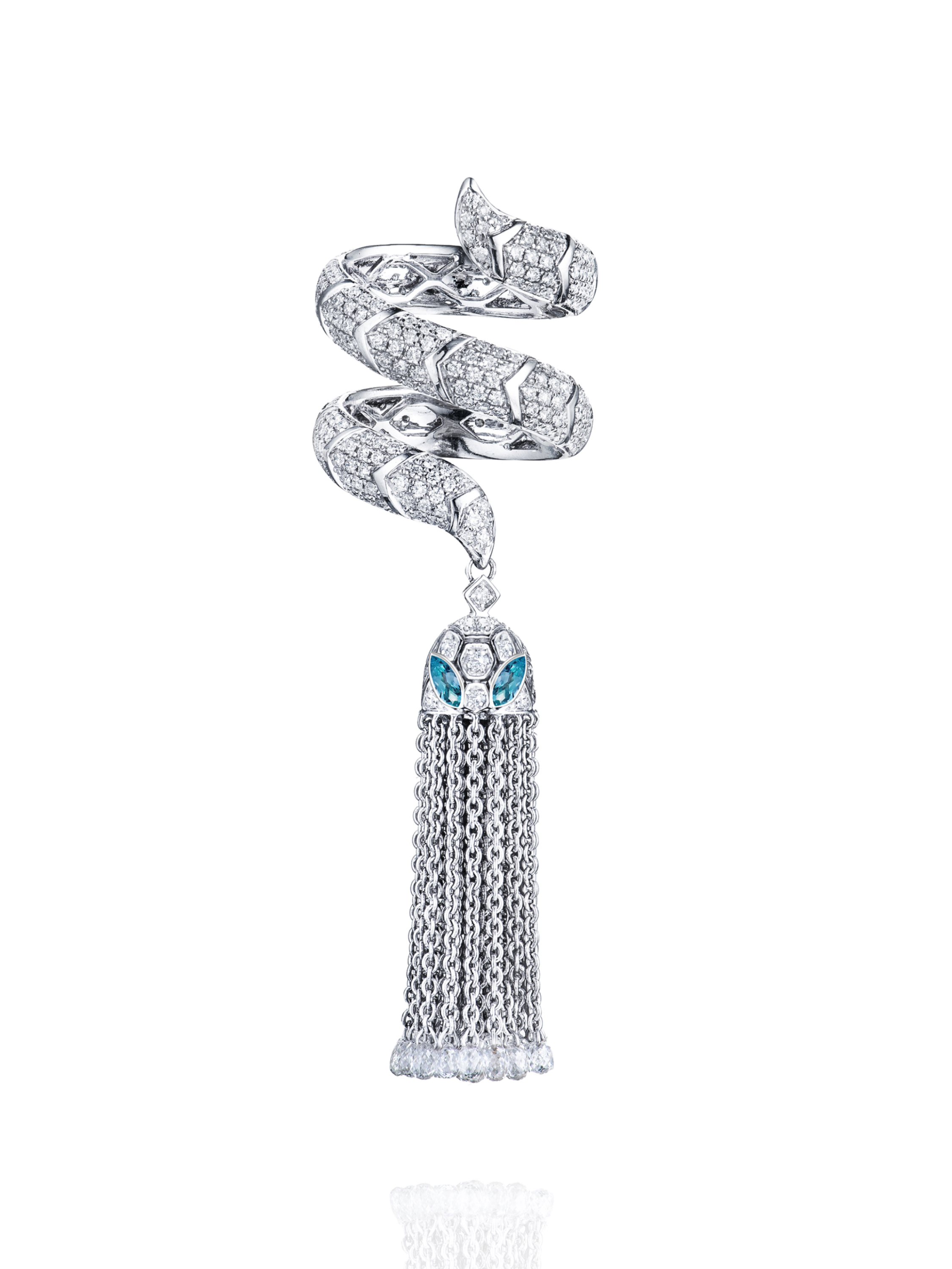 Tassel ring made of white gold, inlaid with 4 marquise-cut aquamarines with a total weight of 0.27 ct, 29 briolette-cut diamonds with a total weight of 2.69 ct, and 353 round-cut diamonds with a total weight of 2.2 ct.