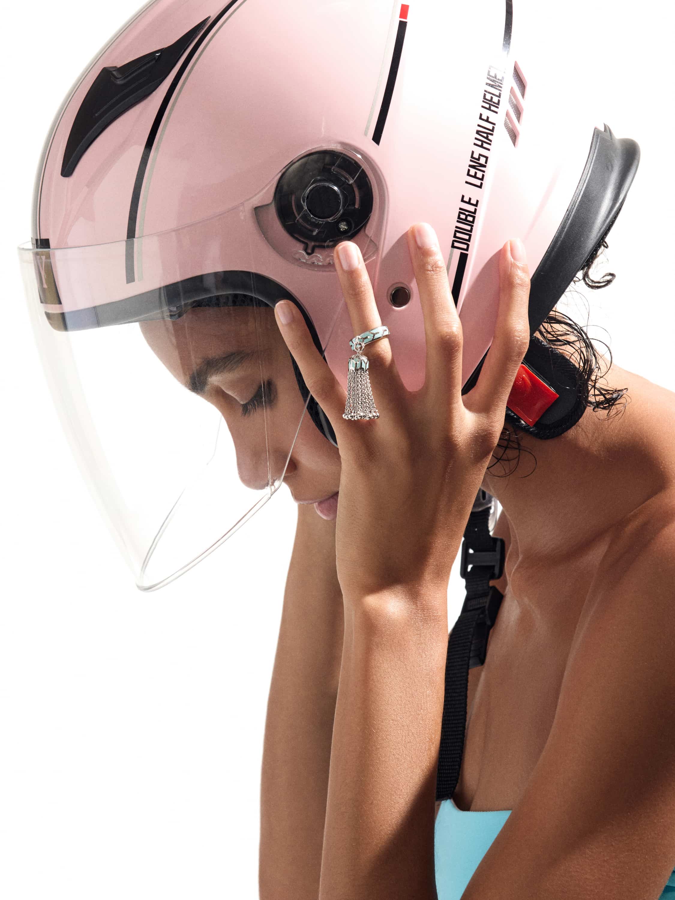White gold tassel ring with Paraiba color enamel