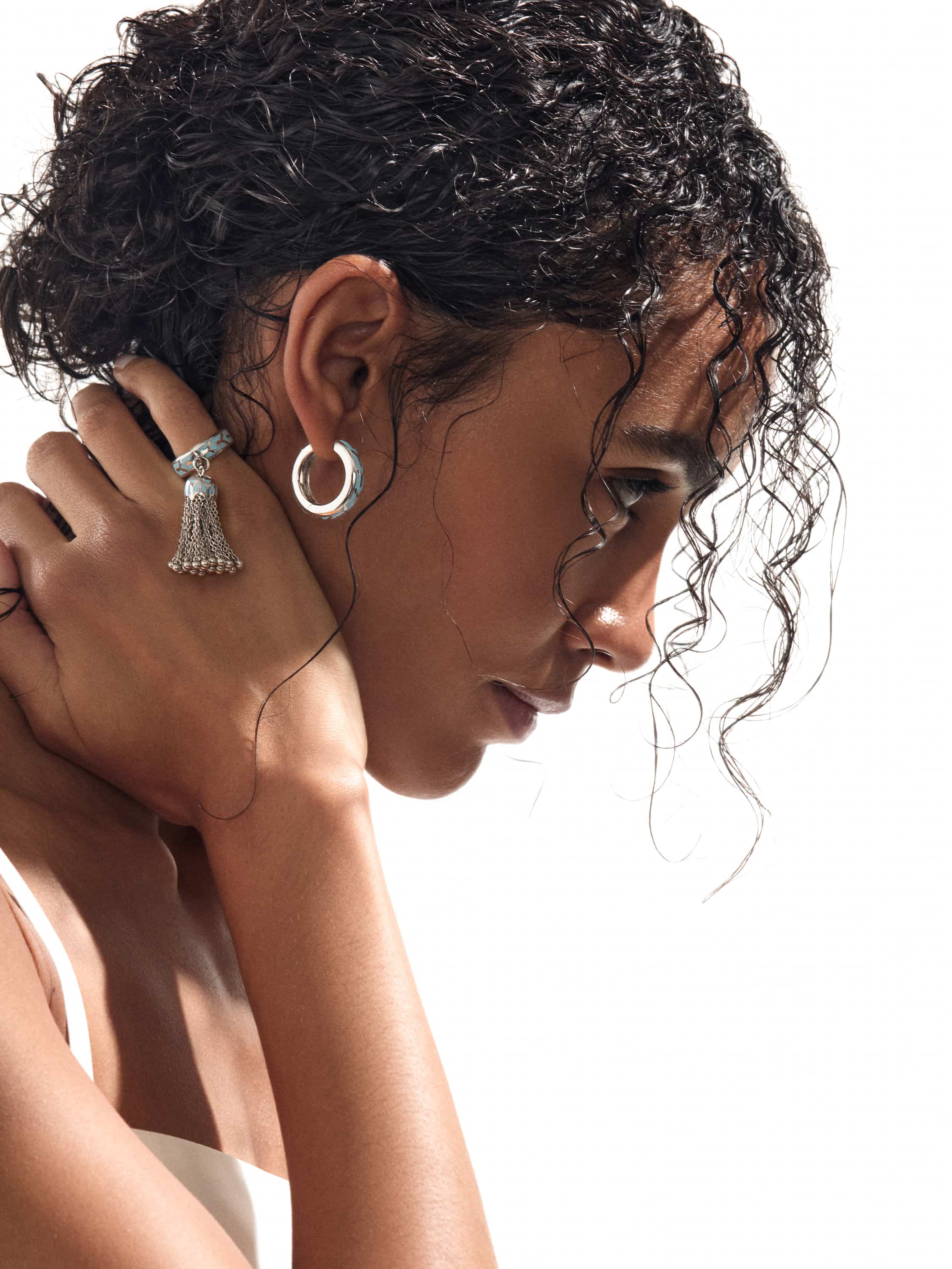 White gold tassel ring with light blue enamel.