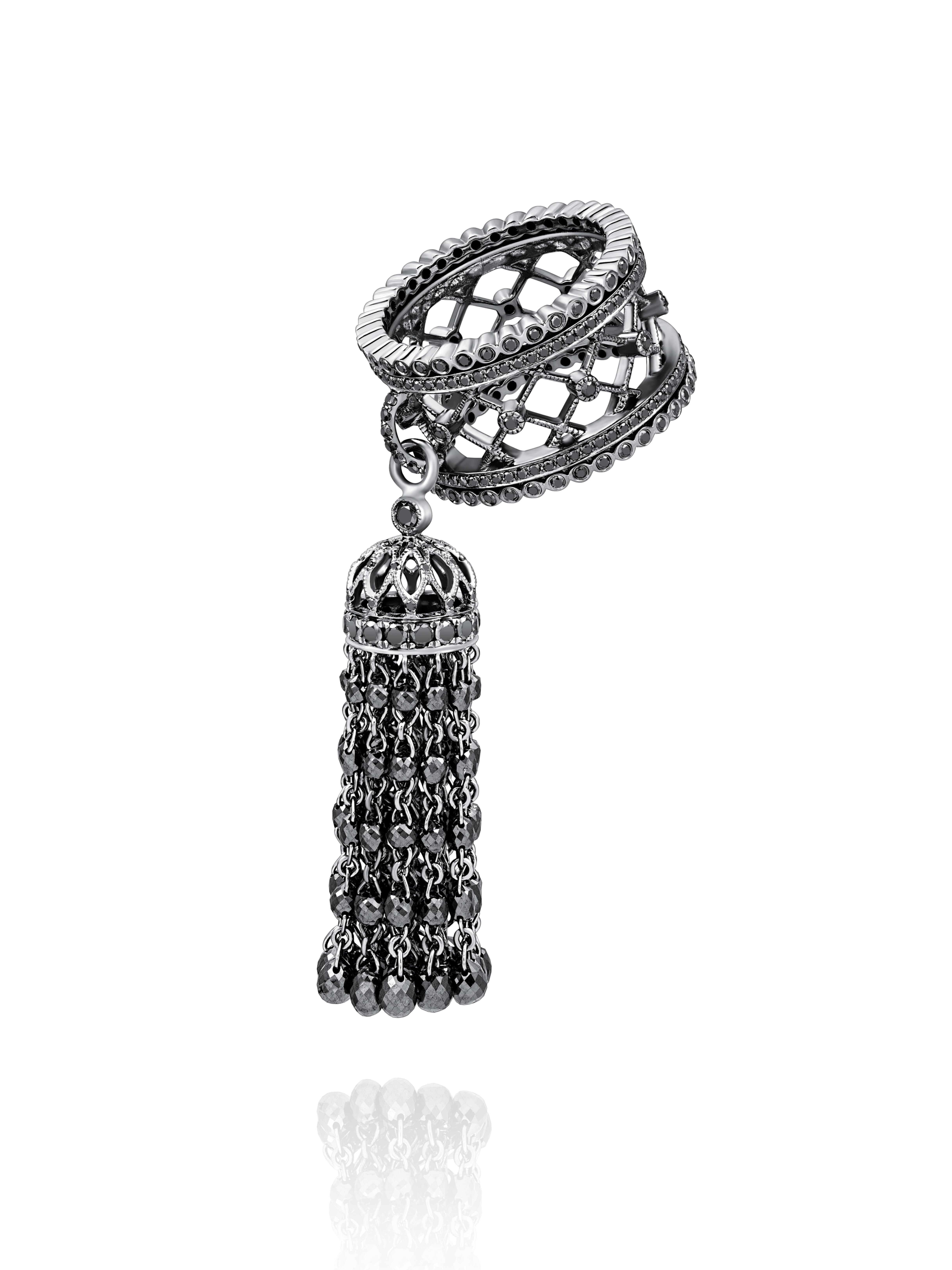 Tassel ring in blackened gold, set with 125 black briolette-cut diamonds with a total weight of 9.5 ct and 230 round-cut black diamonds with a total weight of 1.21 ct.