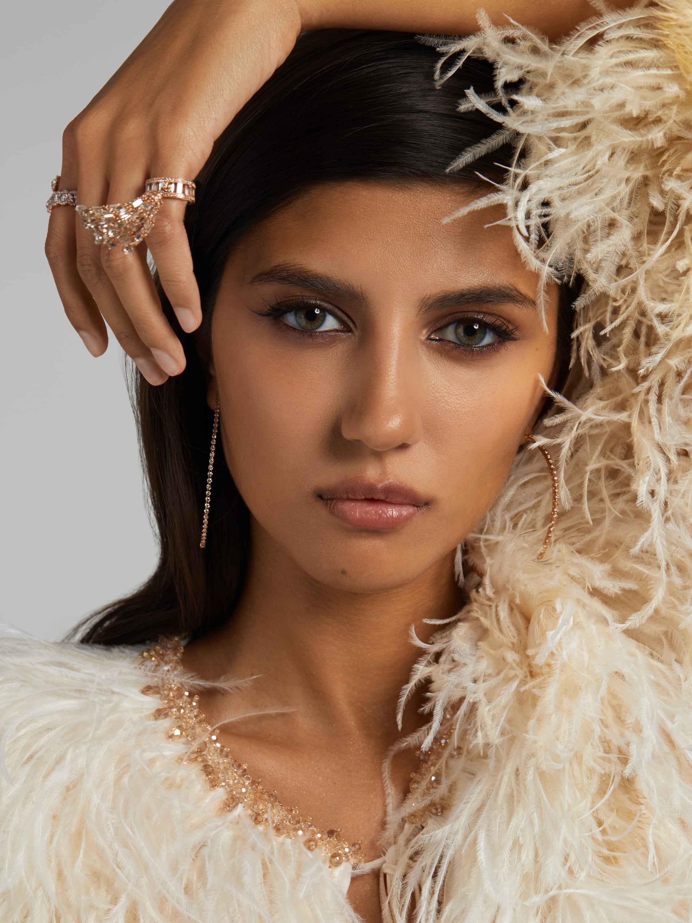 Hand ring in rose gold and 175 round‑cut brown diamonds with a total weight of 0.84 ct, 19 briolette‑cut brown diamonds with a total weight of 4.38 ct, and 75 baguette‑cut brown diamonds with a total weight of 6.39 ct.