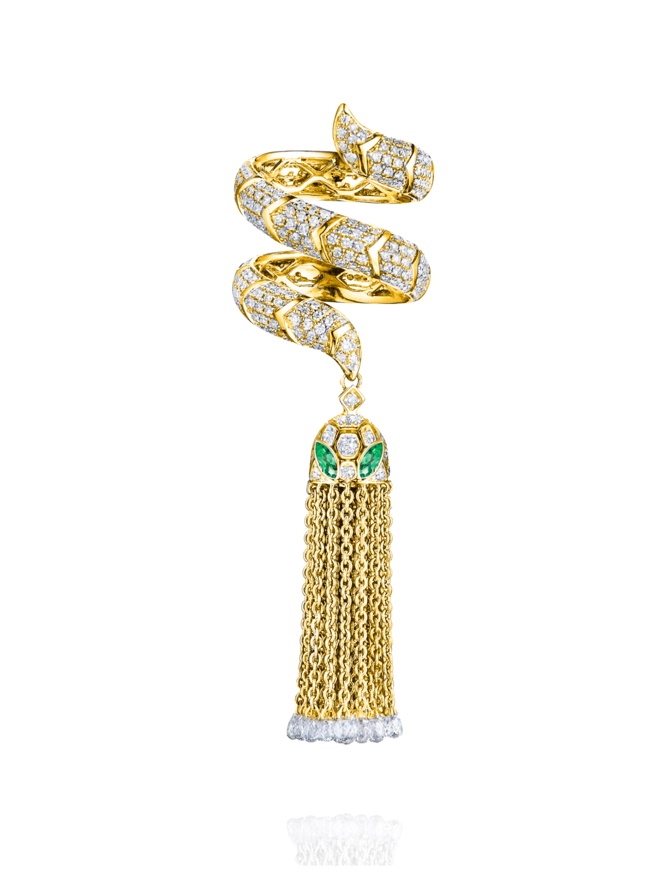 Yellow gold 750 hand ring, set with 355 round diamonds with a total weight of 2.19 ct, 29 briolettes with a total weight of 2.73 ct, and 4 marquise-cut emeralds with a total weight of 0.23 ct.