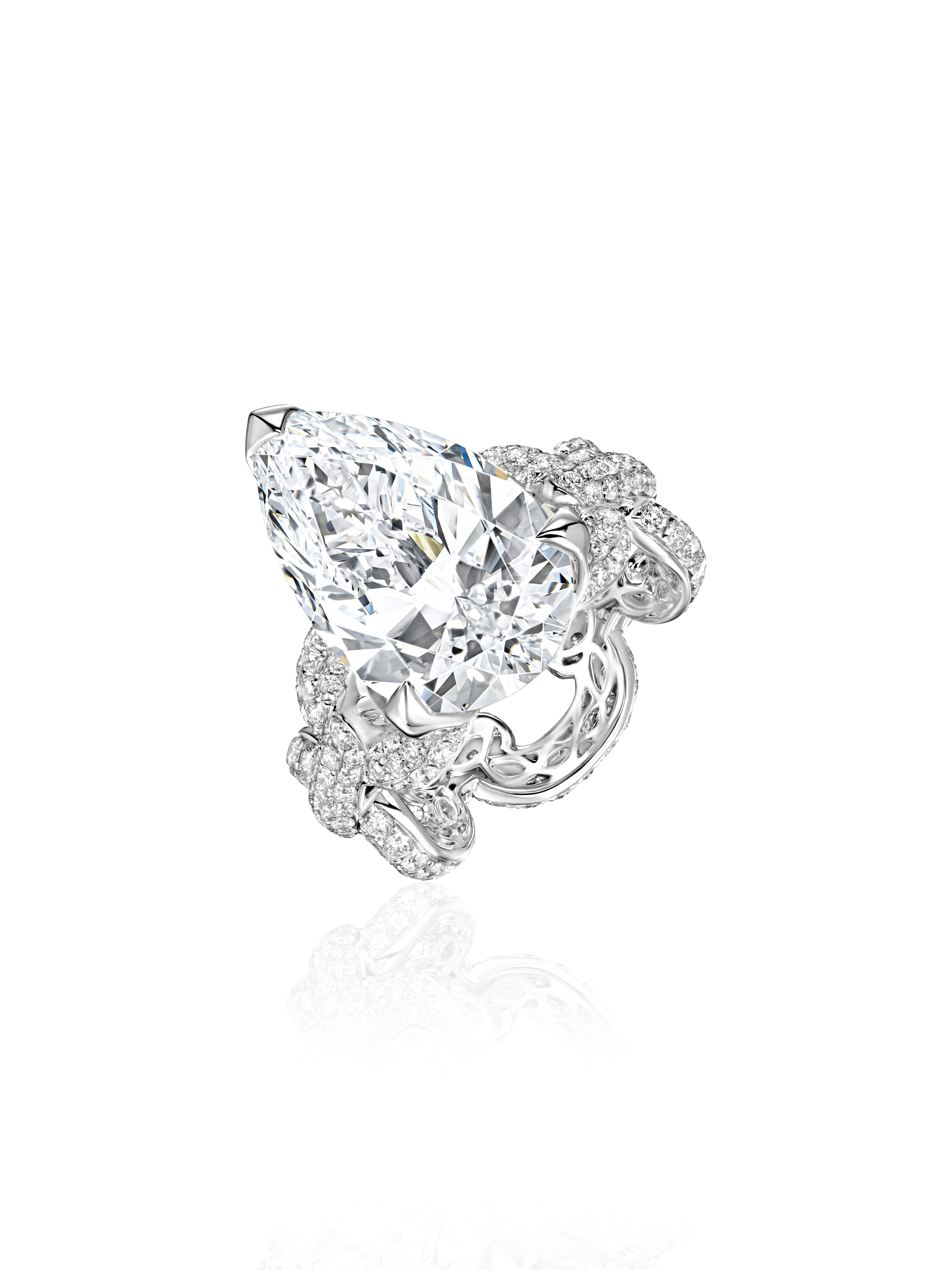 Ring with an LG pear-cut diamond of 11.69 ct F/VS1 and 302 round LG diamonds of 3.19 ct H/SI.