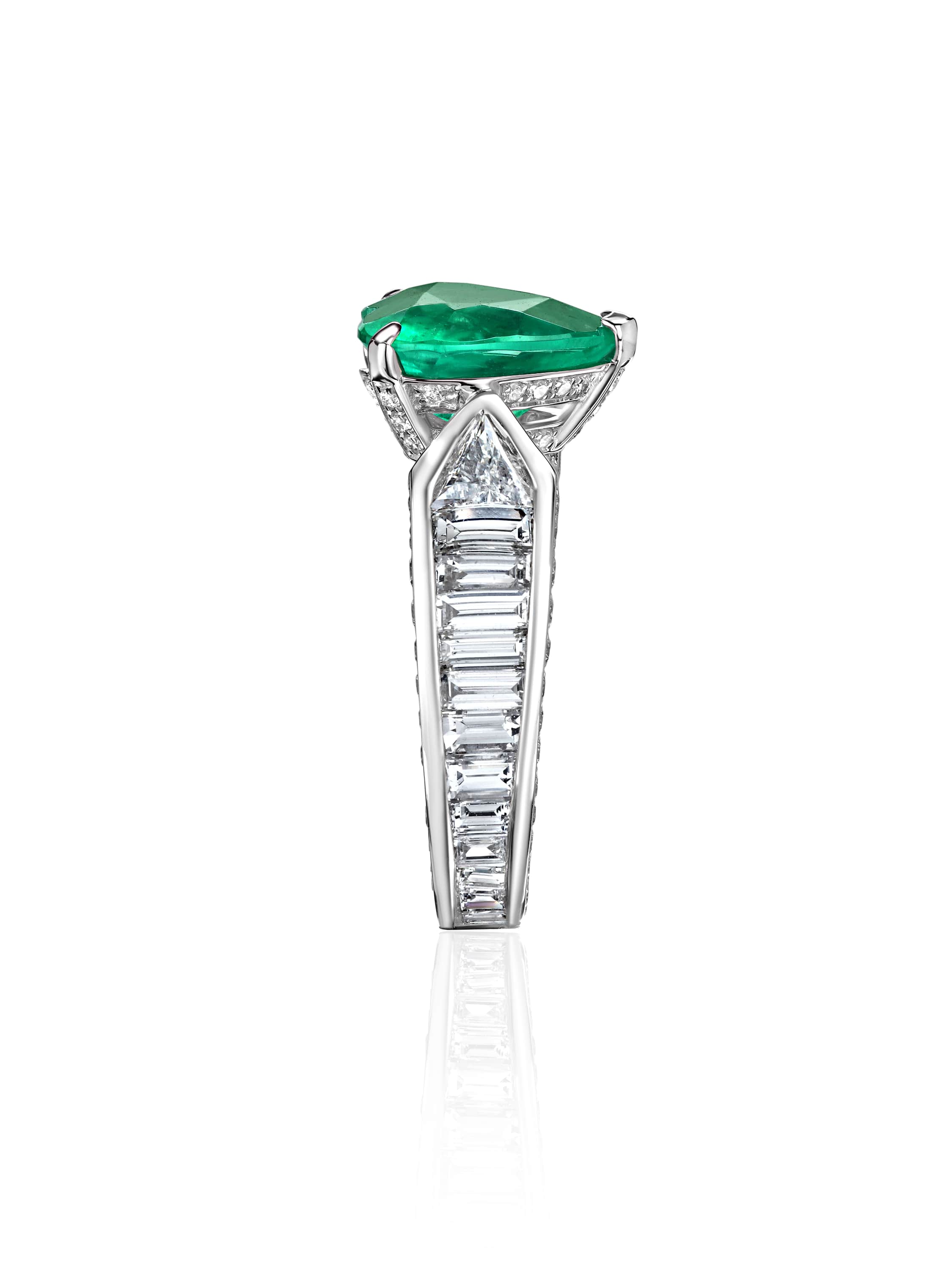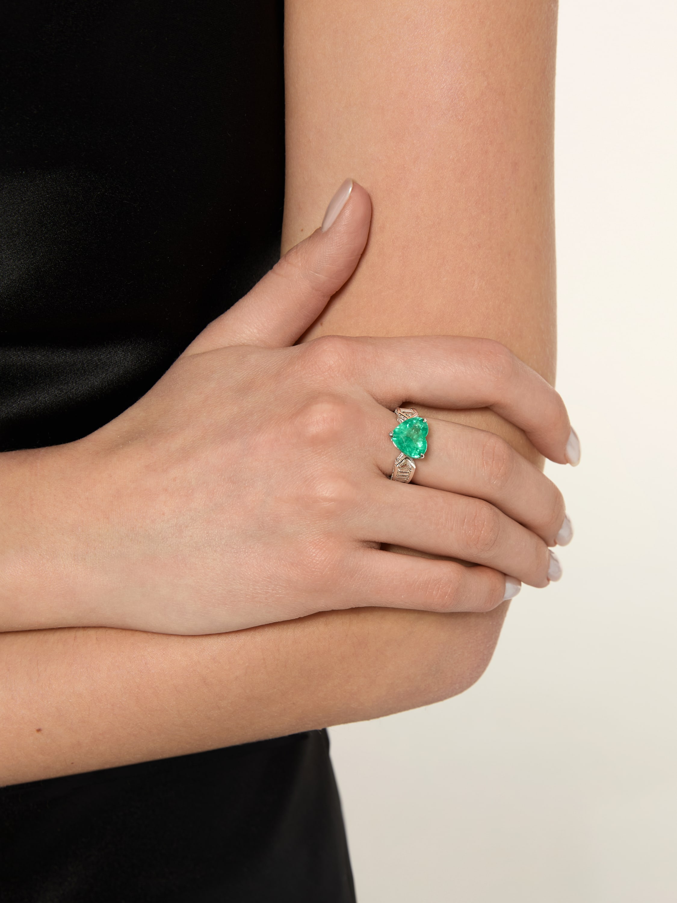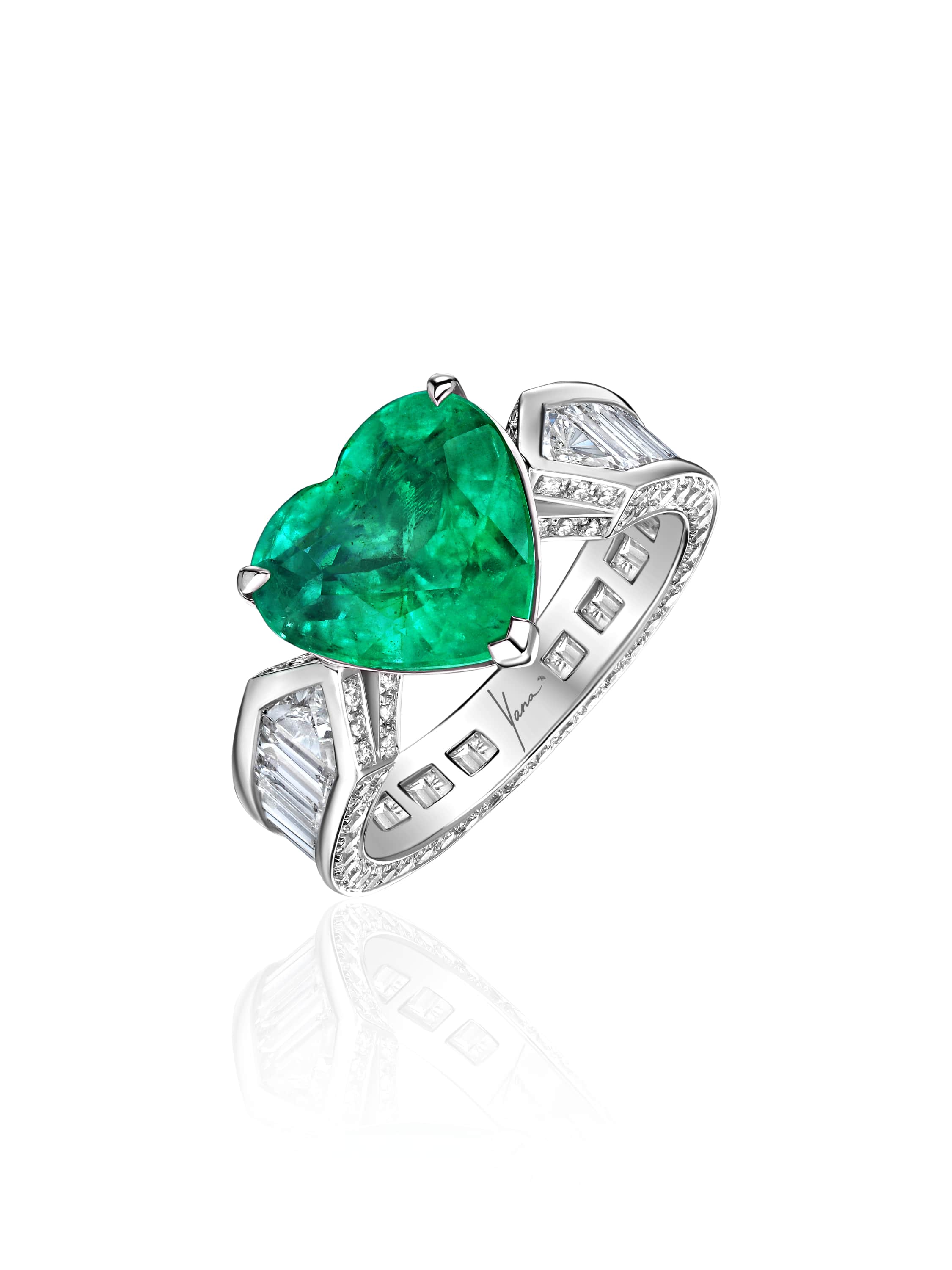 Ring with heart-cut emerald weighing 2.82 ct, 2 fancy-cut diamonds weighing 0.27 ct, 28 baguette-cut diamonds weighing 1.51 ct and 134 round-cut diamonds weighing 0.77 ct.