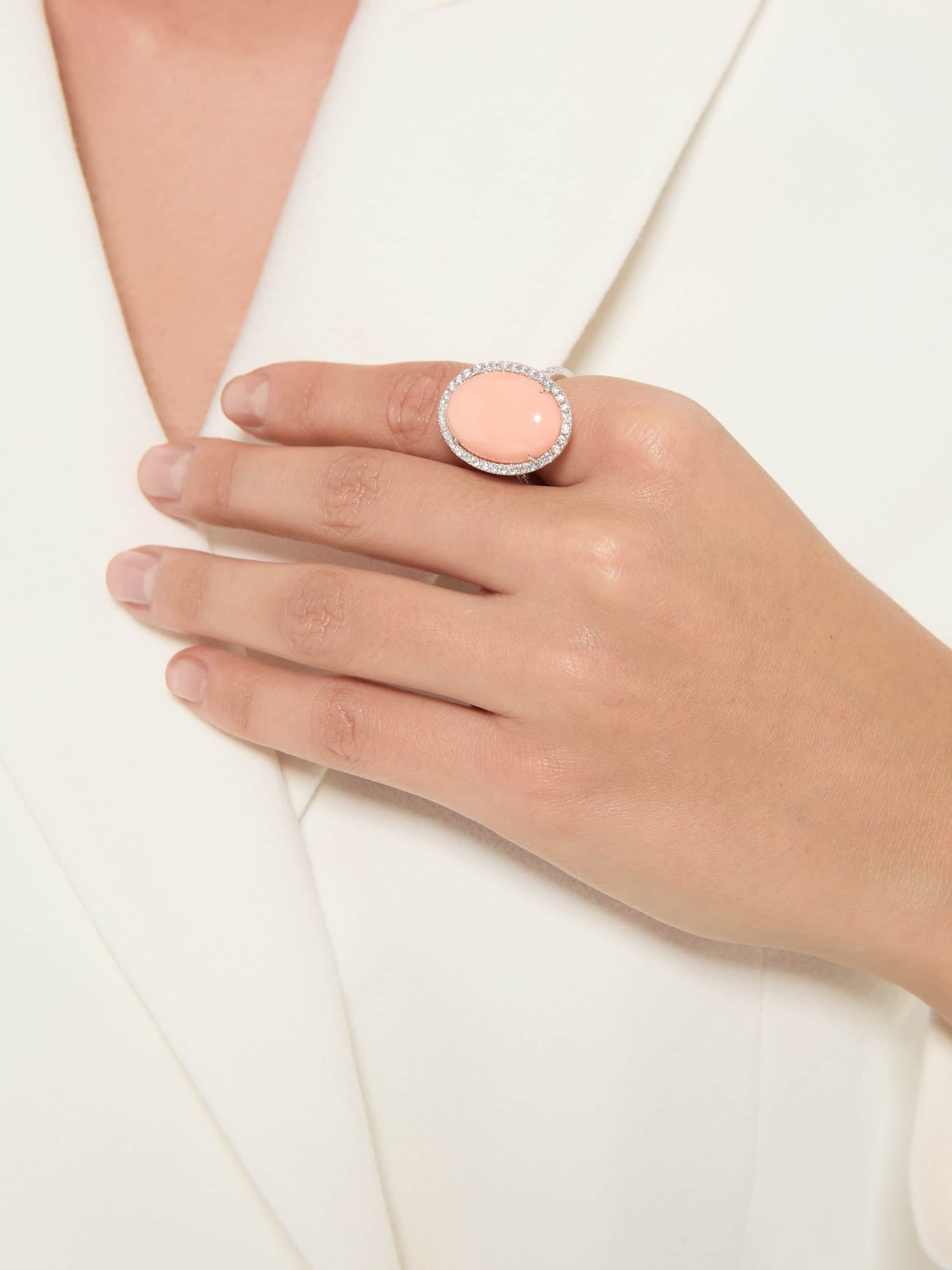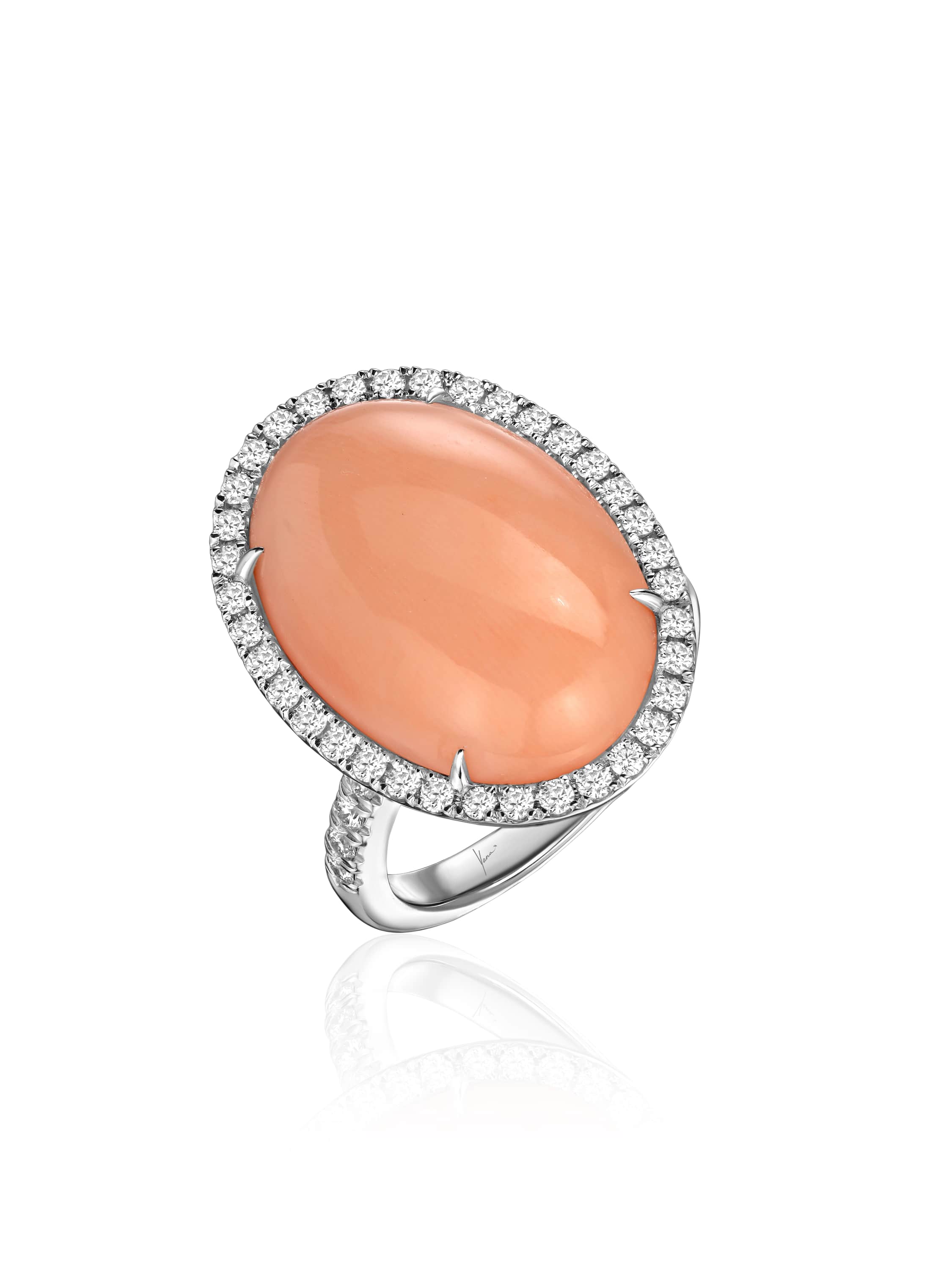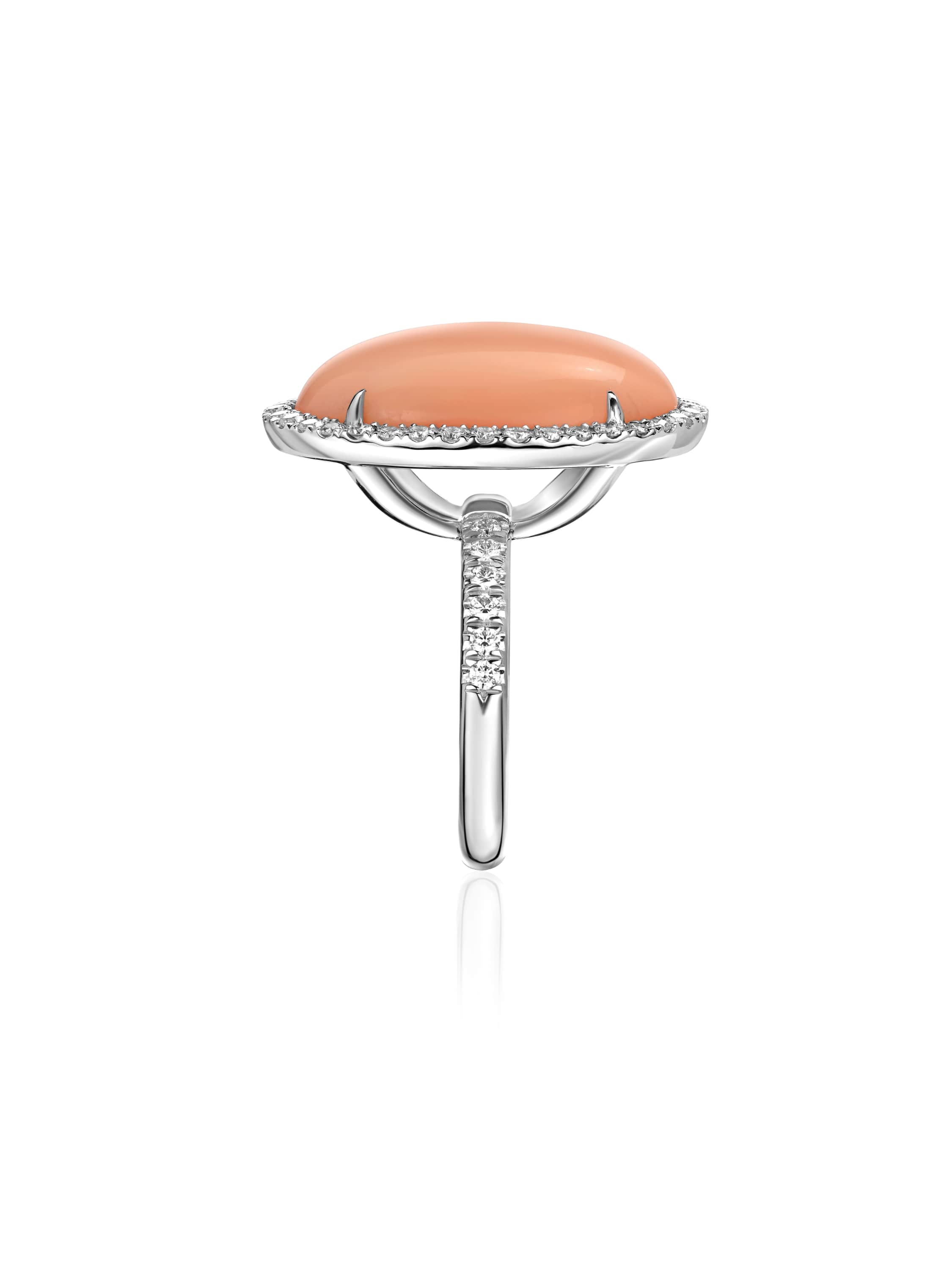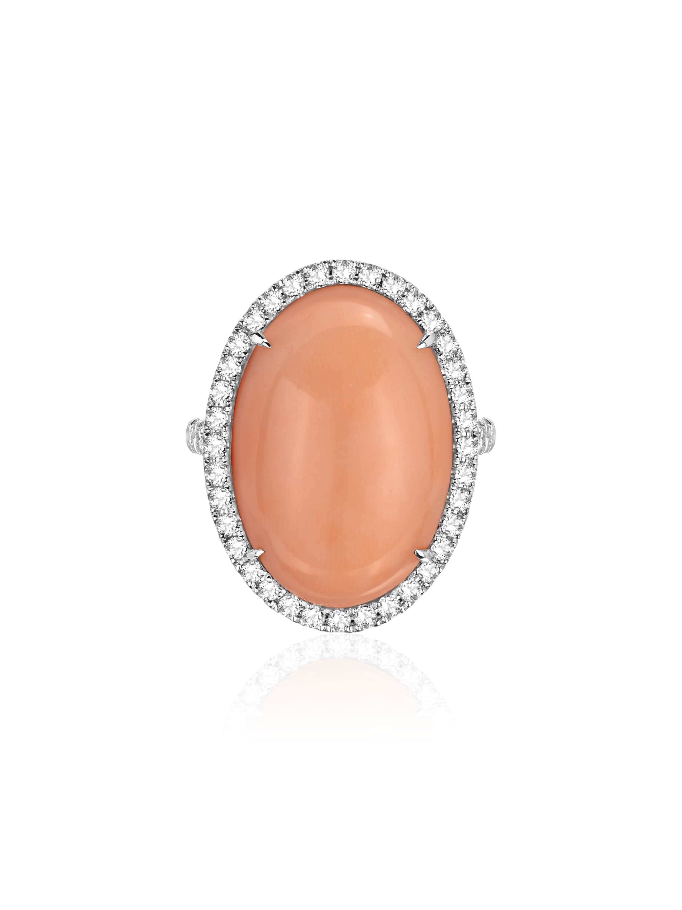 Ring with an oval coral weighing 15.98 ct and 48 round-cut diamonds with a total weight of 0.75 ct.