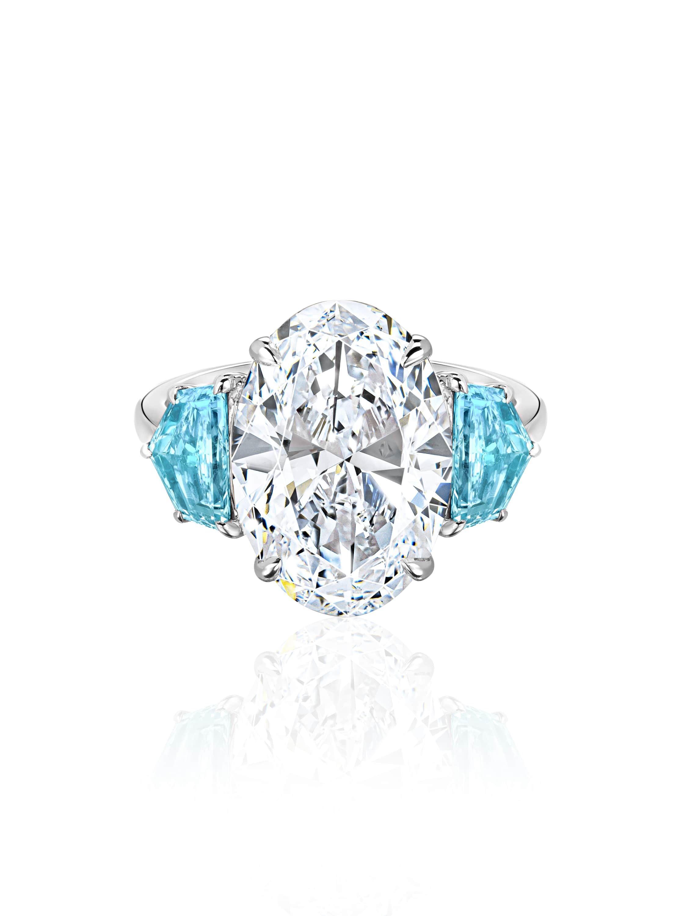 Ring with 2 oval LG diamonds 6.38 ct E/VS2 and 2 Cadillac Fancy Vivid Blue LG diamonds 1.34 ct VS2.
