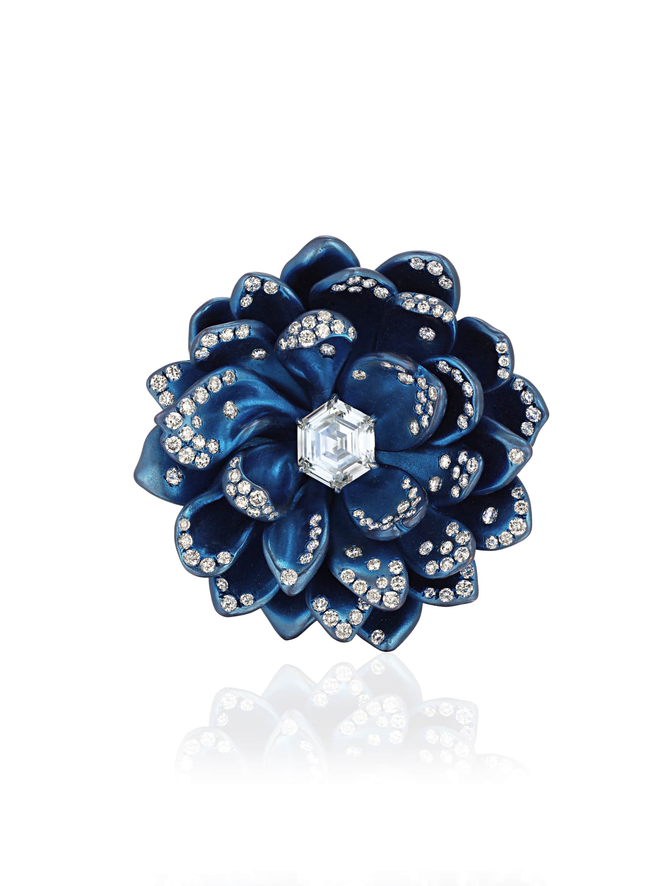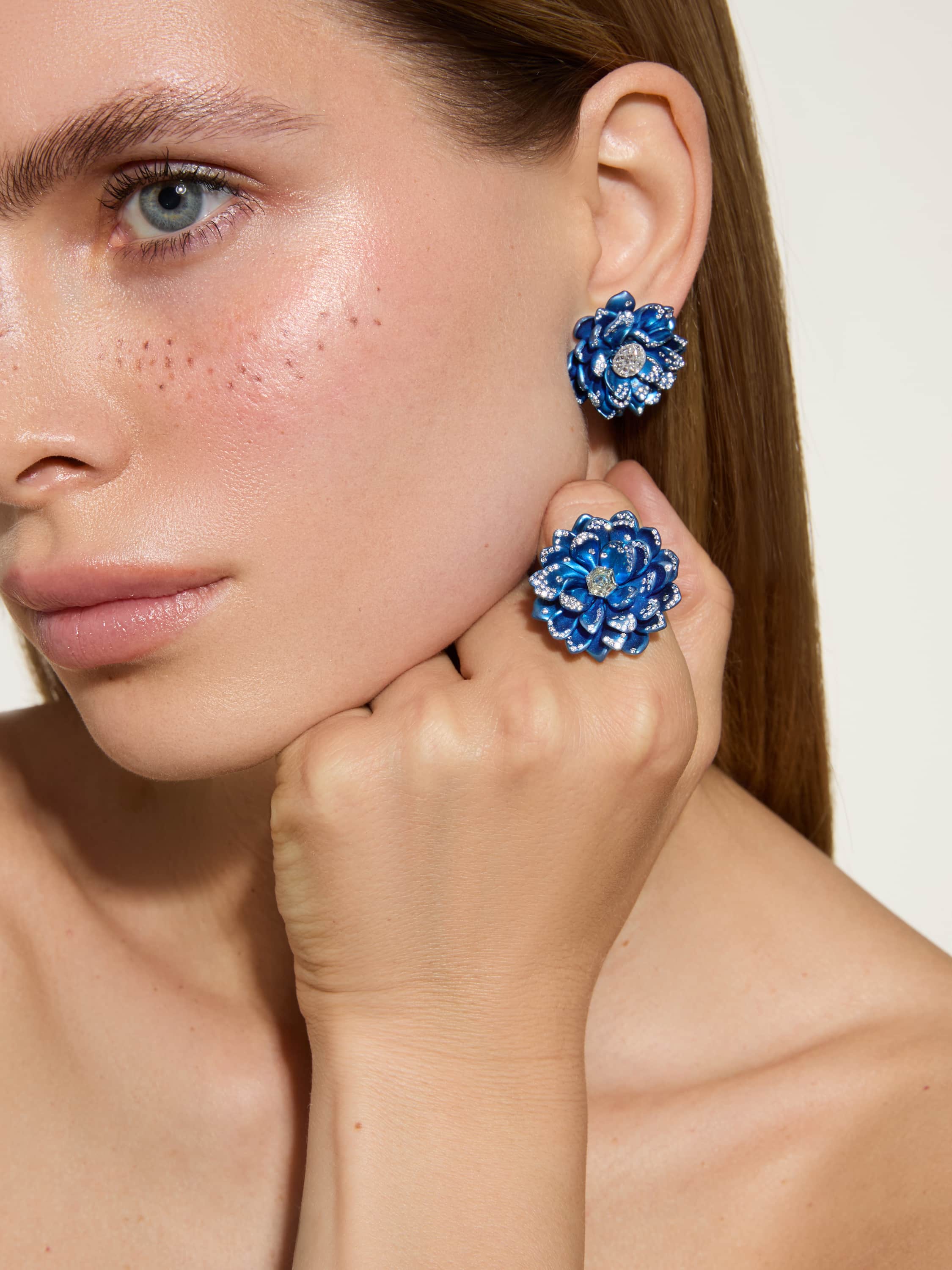 Flower‑shaped ring in titanium 7.77 g and 18K white gold with 150 round diamonds 0.78 ct and 1 Step Cut diamond 0.62 ct.