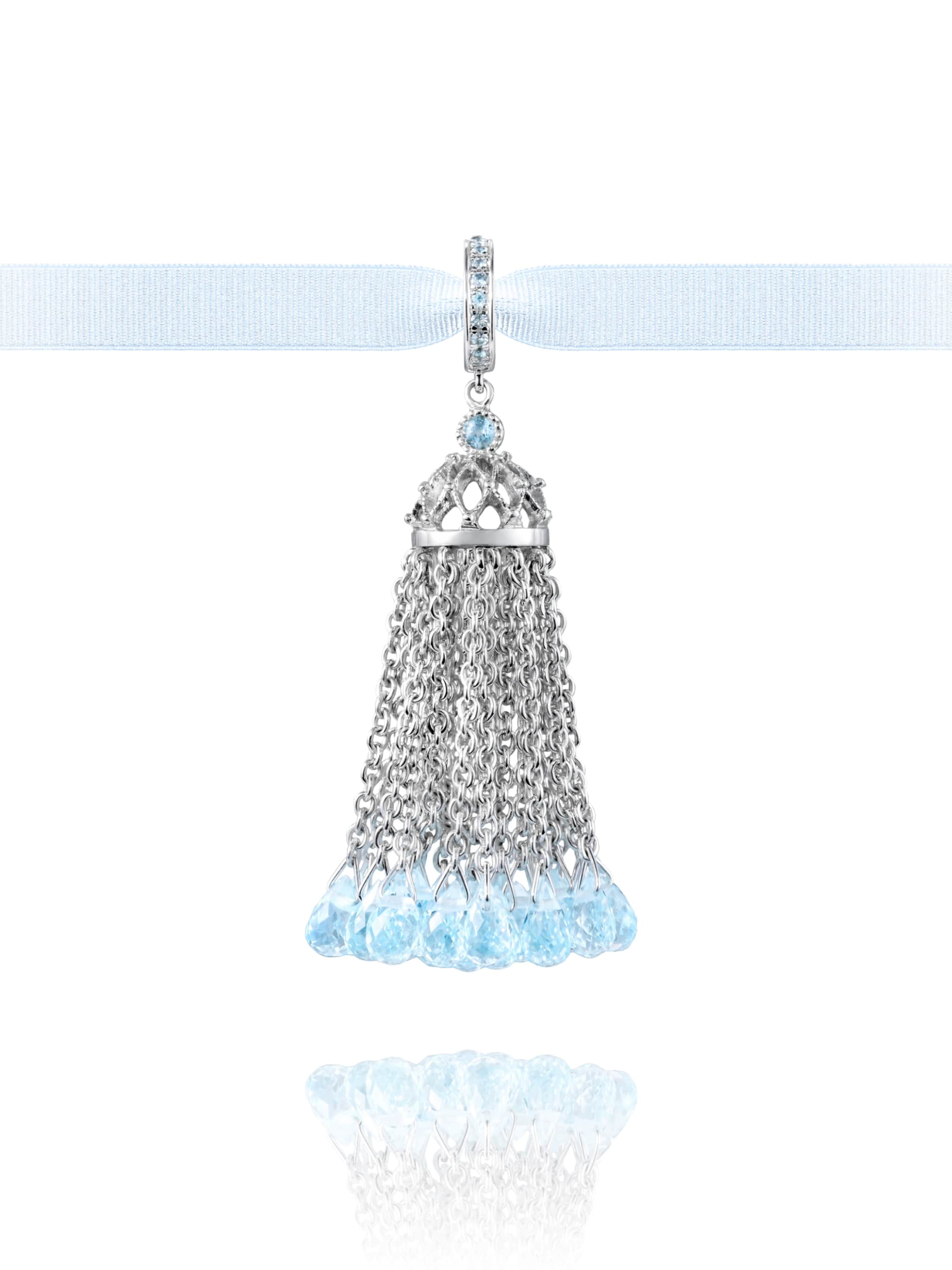 Tassel pendant in white gold with 10 Sky topazes in round cut weighing 0.11 ct and 25 Sky topazes in briolette cut weighing 10.21 ct