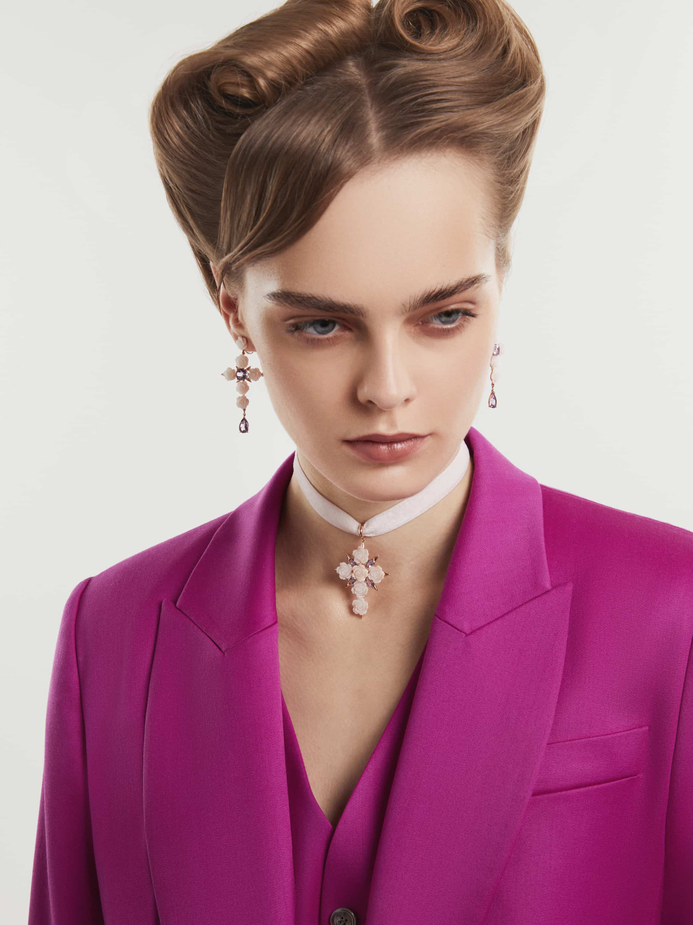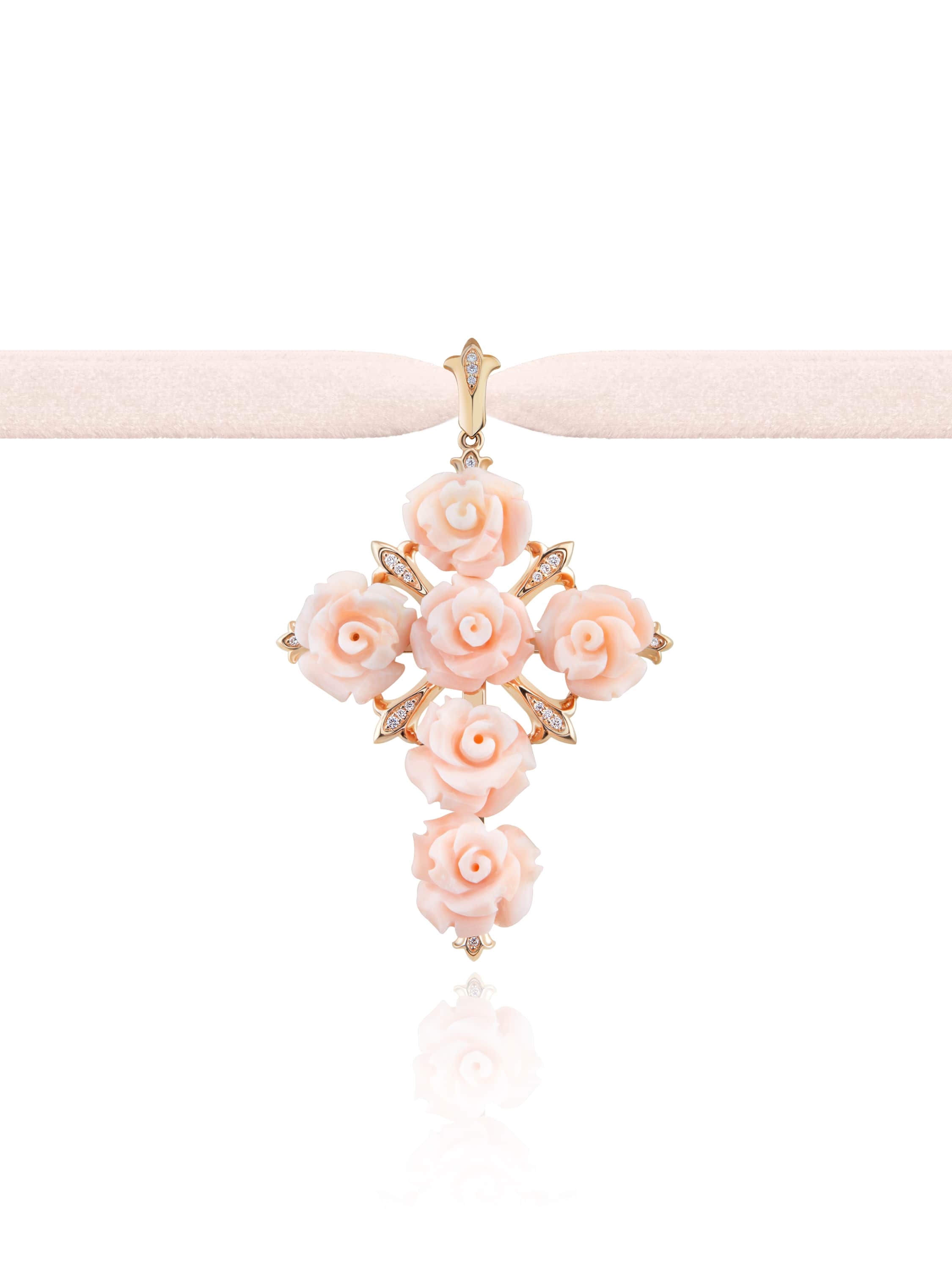 Cross-shaped rose gold pendant with carved coral roses 33.62 ct and 19 round-cut diamonds weighing 0.09 ct.