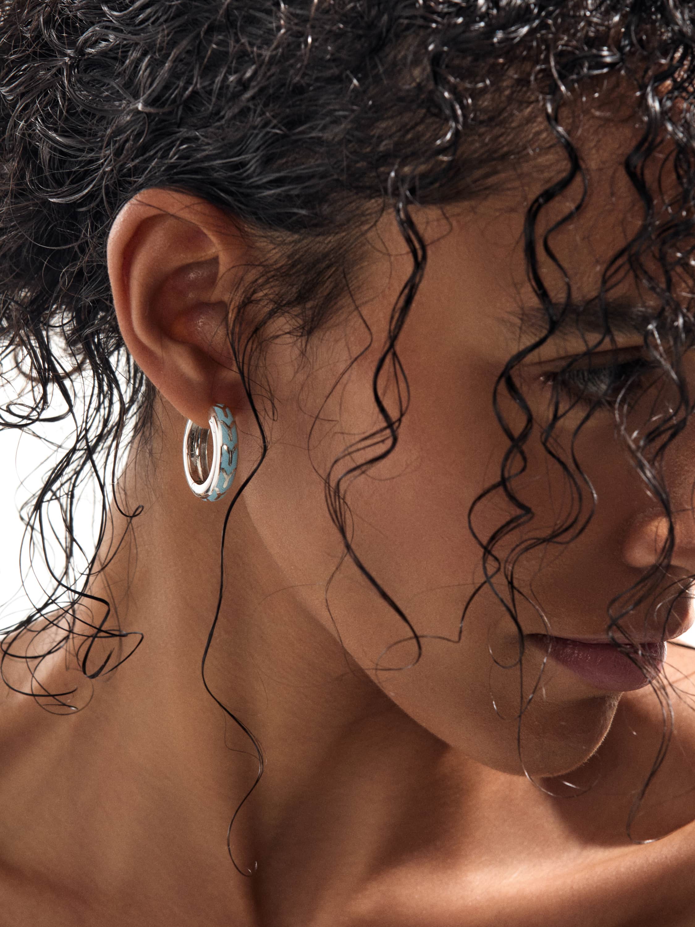 Small white gold hoops with light blue enamel