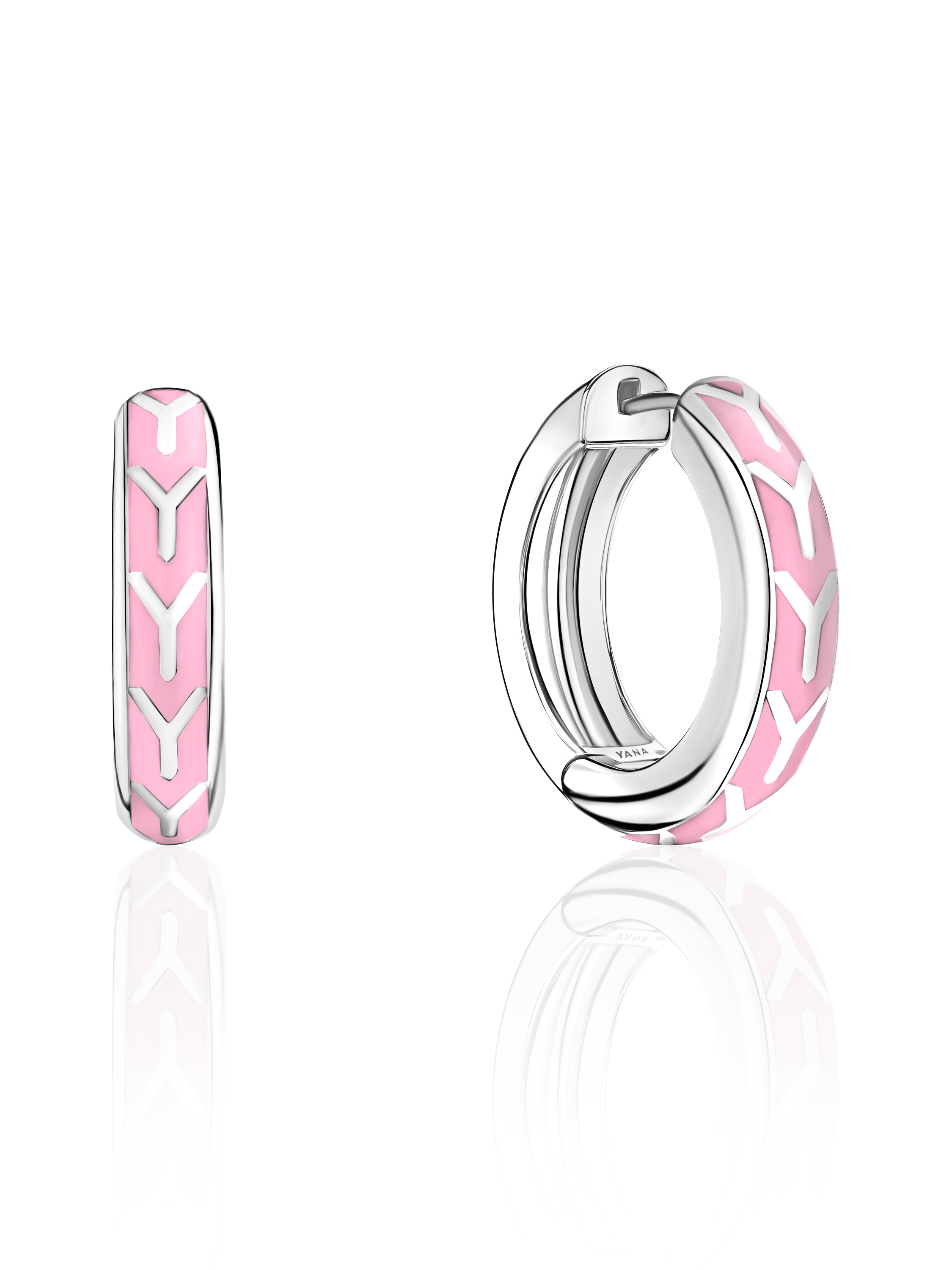 Small hoops in white gold with light pink enamel. Diameter: 2.5 cm.